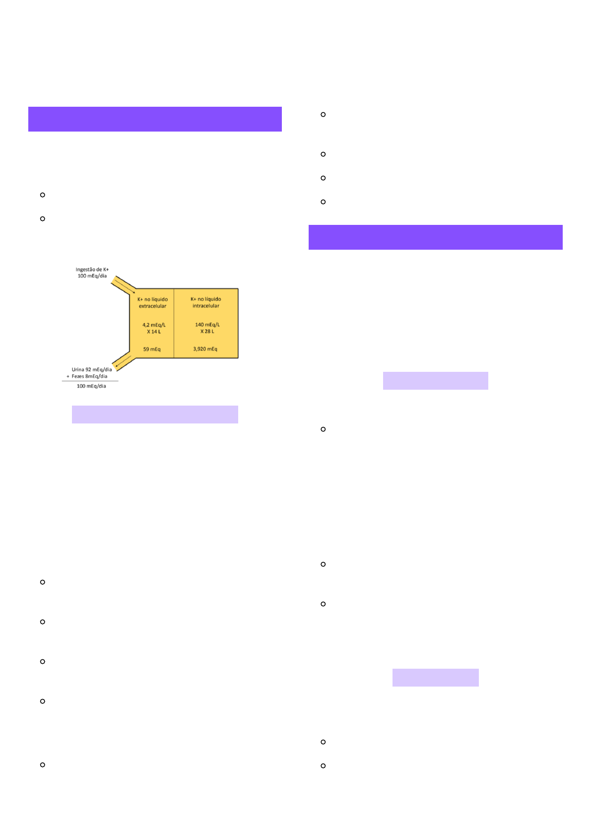Universidade Nove de Julho Maria Lívia Introdução: • Mais importante íon intracelular; • Efeitos Celulares: Determina o potencial de membrana; Manutenção do volume intracelular. • 90% intracelular (140-150 mmol/L); Al 1. Balanço Externo x Interno: • Dois balanços devem-se manter nulos; • Compartimentos desiguais separados pelas membranas celulares; • Gradiente é mantido pela bomba de Na+ e K+ ATPase; • Balanço Externo - entrada e saído do K corporal; Balanço Externo Negativo: diarreia, vômito e tubulopatias; Balanço Externo Positivo: excreção urinária deficiente; Hipercalemia - entrada de potássio maior que saída; Hipocalemia - saída de potássio maior que entrada. • Balanço Interno - insulina e ß2-adrenérgico; ß2 - aumenta atividade da bomba Na/K/ ATPase que sequestra K sérico para dentro da célula; Insulina - via intracelular diferente, mesmo efeito final; Deslocamento do íon entre LIC e LEC; Hipercalemia - desvio de K do LIC -> LEC; Hipocalemia - desvio de K do LEC -> LIC. Hipocalemia: • K sérico < 3,5 mEq/L; • Distúrbio hidroeletrolítico muito frequente na prática clínica; • Membrana da célula fica hiperpolarizada; • Despolarização torna-se mais difícil. 1. Quadro Clínico: • Fraqueza muscular - sintoma se K < 2,5; Potencial fatal - pode levar a parada respiratória. • Arritmias cardíacas; • Rabdomiólise - por isquemia; • Íleo paralítico - lentifica o trânsito intestinal; • Renais - vasoconstrição, poliúria, polidipsia; Vascuolização das células proximais - aumento da produção de amônia; Desenvolvimento de NIA. • Intolerância à glicose; • Alcalose metabólica. 2. Diagnóstico: • Anamnese - questione sobre diarreia, vômito uso de diurético; Se identificado - fim; Se não - avaliar PA + gasometria + K e Cr urinário. Distúrbios de potássio Disturbios de Potassio Universidade Nove de Julho Maria Lívia • Gradiente Transtubuluar de K (GTTK) - avalia a secreção de K; K excretado na urina = K secretado; Ausência de secreção - Uk aumenta em relação a Pk na proporção que a urina for concentrada -> Uk/Pk = Uosm/Posm -> quociente 1; Hipersecreção - Uk/Pk > Uosm/Posm -> GTTK alto (>10) -> hiperaldosteronismo x alta ingesta x uso de diuréticos; Padronização - GTTK < 3 (baixo), GTTK > 10 (alto). • Afasta pseudo-hipocalemia - presença de leucocitose secundária a leucemia; • Dosagem de K urinário 24 horas: Perda baixa de potássio - perda extrarenal (os rins estão reabsorvendo o potássio da urina para atenuar a hipocalemia); Potássio urinário elevado - as perdas são de origem renal. 3. Causas Menos Comuns: 4. Tratamento: • A agressividade do tratamento depende da velocidade de instalação e da intensidade; Quadro mais aguda hipocalemia + grave. 3-5 > 3,0: leve; 3,0 > 2,5: moderada; < 2,5: grave. • Estimando déficit de potássio: Queda de 0,3 mEq/L sérico ~ perda de 100 mEq corporal total; Não se aplica se cetoacidose diabética ou hiperglicemia - supõe um shift 0. • Tratar a causa sempre; • Reposição Oral de K: Dieta (frutas); 60 a 80 mEq/dia (70 a 100 mL ou 7 a 10 comprimidos); KCl - 10 a 20 mL de xarope ou 1 a 2 comprimidos 12/12 até 6/6 horas. • Reposição Intravenosa de K: Estimar o déficit de K corporal; Dosar Mg e repor se necessário; Prefira a razão K/Cr ao invés de GTTK. Doença Defeito Quadro Clínico ATR I ou clássica Túbulo distal (defeito na excreção H+) Hipocalemia Cálculos renais (hipercalciúria) ATR II Túbulo proximal (defeito na reabsorção de BIC) Hipocalemia Sem cálculos Sd. Bartter Alça de Henle (defeito na Na-K-2Cl) HipoK, hipoCl, alcalose Poliúria, polidipsia Sem hipertensão Sd. Gitelman Túbulo distal (defeito Na-Cl) HipoK, hipoCl, hipoMg, alcalose Hipercalciúria, litíase Sem hipertensão Sd. Liddle Túbulo coletor HipoK, hiperNa Universidade Nove de Julho Maria Lívia Utilizar bomba de infusão contínua - repor rápido pode dar flebite, arritmia, morte; Acesso periférico (dose máxima) - 20 mL em 500 mL de NaCl 0,9% em 4 hrs (BIC); Acesso central (dose máxima) - 20 mL em 250 mL de NaCl 0,9% em 2 hrs (BIC). Hipercalemia: • K > 5,5 mEq/L; • Etiologias: Redução da excreção de potássio -> DRC, IRA, hipoaldosteronismo (balanço positivo do potássio) Desvio do K+ do LIC para o LEC -> acidose metabólica, cetoacidose diabética lise celular maciça. 1. Quadro Clínico: • Sintomas ou alterações eletrocardiográficas típicas costumam aparecer na hipercalemia grave; • Musculatura estriada esquelética: fraqueza, câimbra, mialgia, insuficiência respiratória; • Musculatura lisa -> não tem sintomas intestinais significativos; • Musculatura estriada cardíaca: Apiculação da onda T; Achatamento da onda P e alargamento do QRS. 2. Diagnóstico: • Afastar uma pseudo hipercalemia: hemólise traumática da amostra de sangue por sucção excessiva na seringa; • Dosagem aldosterona sérica e atividade da renina plasmática; • A dosagem do potássio urinário, relação potássio/creatinina na urina e do gradiente transtubular de potássio são medidas que, por enquanto, acrescentam pouco valor ao diagnóstico etiológico da hipercalemia. K ≥ 3,0 - repor VO; K < 3,0 = repor IV. Acidose Metabólica -> leva à entrada de H+ na célula, resultando na saída de um cátion para equilibrar a carga elétrica, sendo esse cátion o potássio. Ao mesmo tempo, a entrada de H+ na célula tubular renal leva à acidose intracelular, estimulando a secreção de hidrogênio para a luz intestinal no lugar do potássio, ou seja, prejudicando o mecanismo protetor contra hipercalemia. Universidade Nove de Julho Maria Lívia 3. Tratamento: • Estabilização do cardiomiócito -> infusão de gluconato de cálcio a 10% diluído em 100 ml de SF 0,9% em 5 a 10 minutos; Não reduz o potássio sérico, mas estabiliza a membrana do cardiomiócito, evitando uma parada cardiorrespiratória até que as medidas redutoras de potássio