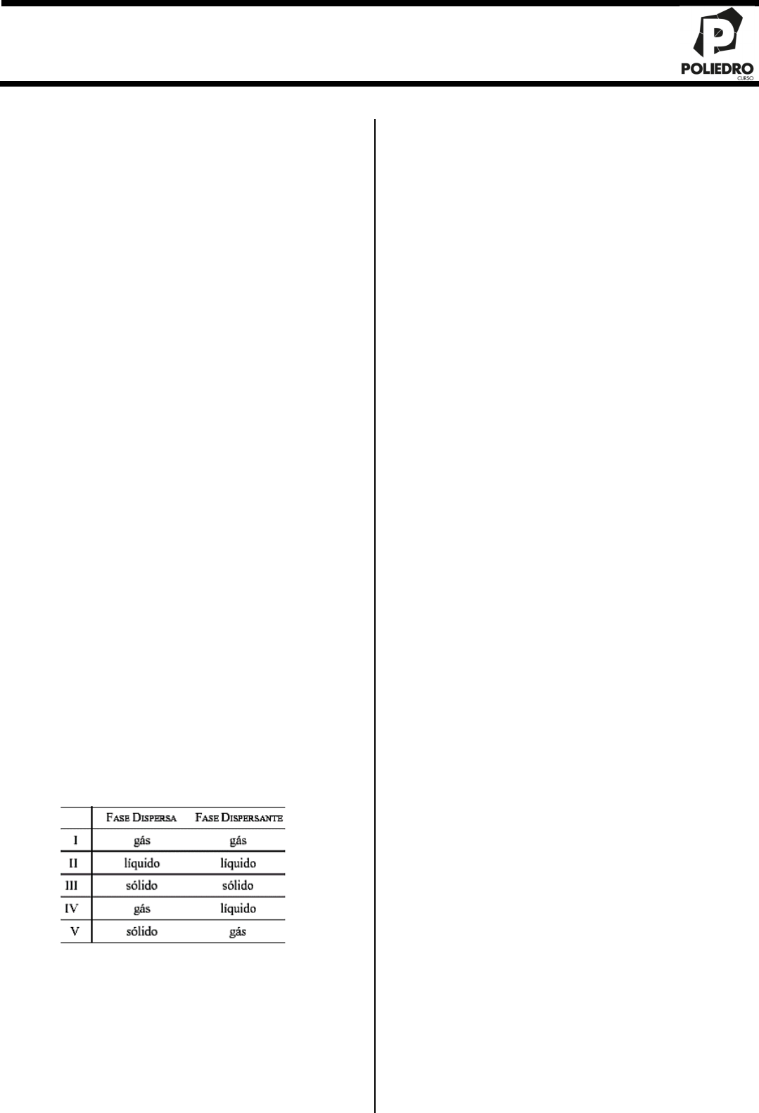 Lista de Exercícios - Coloides Prof. Thiago Costa 1 1. (FUVEST) Azeite e vinagre, quando misturados, separam-se logo em duas camadas. Porém, adicionando-se gema de ovo e agitando- se a mistura, obtém-se a maionese, que é uma dispersão coloidal. Nesse caso, a gema de ovo atua como um agente: a) emulsificador. b) hidrolisante. c) oxidante. d) redutor. e) catalisador. 2. Alguns medicamentos trazem no rótulo “agite antes de usar”. Esse procedimento é necessário se o medicamento for uma: a) mistura homogênea. b) suspensão. c) solução. d) dispersão coloidal. 3. Dentre os seguintes materiais: I. maionese; II. iogurte; III. azeite de oliva; IV. refrigerante. Podem ser classificados como dispersões coloidais: a) I e II b) I e III c) II e III d) II e IV e) III e IV 4. O gás butano é utilizado como propelente em desodorantes e em cremes de barbear. O rótulo de um creme de barbear indica a composição de 4% em massa de butano numa embalagem de 145 g de produto. Considere as seguintes afirmações sobre as características da espuma do creme de barbear: I. é um coloide; II. pode ser classificada como suspensão; III. a fase dispersa é um gás; IV. os seus componentes não sofrem sedimentação. Está correto o contido em a) I, II, III e IV. b) I, II e III, apenas. c) I, II e IV, apenas. d) I, III e IV, apenas. e) II, III e IV, apenas. 5. (UFTM) A nanotecnologia e as nanociências contemplam o universo nanométrico, no qual a dimensão física é representada por uma unidade igual a 10–9 m. O emprego da nanotecnologia tem trazido grandes avanços para a indústria farmacêutica e de cosmético. As nanopartículas são, contudo, velhas conhecidas, uma vez que nas dispersões coloidais elas são as fases dispersas. Analisando-se as combinações, podem constituir dispersões coloidais apenas: a) II e IV. b) I, II e III. c) I, IV e V. d) I, II, IV e V. e) II, III, IV e V. 6. (UFPA) A diminuição da eficiência dos faróis de um automóvel na neblina está intimamente relacionada com: a) o movimento browniano b) a diálise c) o efeito Tyndall d) a eletroforese e) a adsorsão de carga elétrica 7. (ITA) A pintura eletrostática de automóveis baseia-se no princípio de neutralização das cargas elétricas das partículas coloidais da tinta. A lataria do automóvel é ligada ao terminal positivo de um circuito elétrico, enquanto a tinta é carregada negativamente. Ao ser aspergida sobre a lataria, as partículas de tinta(-) são atraídas pela lataria(+), onde ocorre a neutralização de cargas elétricas. Essa técnica proporciona uma pintura mais aderente, resistente e uniforme. O processo de pintura eletrostática é uma: a) preparação de dispersão coloidal. b) eletroforese. c) adsorção seletiva de íons. d) purificação de dispersão coloidal. e) destruição de dispersão coloidal. 8. (UFU) A popular maionese caseira é formada pela mistura de óleo, limão (ou vinagre) e gema de ovo; este último componente tem a função de estabilizar a referida mistura. Esta mistura é um exemplo de: a) solução verdadeira concentrada; b) solução verdadeira diluída; c) uma dispersão coloidal do tipo gel; d) uma dispersão coloidal do tipo emulsão; e) um gel que sofreu uma peptização. 9. Em relação às afirmações: I. Sol é uma dispersão coloidal na qual o dispergente e o disperso são sólidos. II. Gel é uma dispersão coloidal na qual o dispergente é sólido e o disperso é líquido. III. A passagem de sol para gel é chamada pectização. IV. A passagem de gel a sol é chamada peptização. São corretas as afirmações: a) I e II b) II e III c) I, III e IV d) II, III e IV e) todas 10. (UEM) Assinale a alternativa correta. a) Nevoeiro, xampu e leite são exemplos de substâncias no estado coloidal, classificadas como aerossóis. b) Leite, maionese e pedra-pomes são exemplos de substâncias no estado coloidal, classificadas como emulsões. c) Geleia, xampu e chantilly são exemplos de substâncias no estado coloidal, classificadas como espumas. d) Gelatina, tinta e geleia são exemplos de substâncias no estado coloidal, classificadas como géis. e) Ligas metálicas, fumaça e asfalto são exemplos de substâncias no estado coloidal, classificadas como sóis. 11. Analise as afirmações sobre coloides. I. As proteínas formam, em solução aquosa, coloides hidrófilos. II. O fenômeno da migração das partículas coloidais sob a influência de um potencial elétrico é chamado eletroforese. III. As partículas de um coloide hidrófobo podem ser separadas de uma dispersão aquosa por filtração comum. Estão corretas: a) Apenas I. b) Apenas I e II. c) Apenas I e III. d) Apenas II e III. e) I, II e III. 2 12. (UEL) A força e a exuberância das cores douradas do amanhecer desempenham um papel fundamental na produção de diversos significados culturais e científicos. Enquanto as atenções se voltam para as cores, um coadjuvante exerce um papel fundamental nesse espetáculo. Trata-se de um sistema coloidal formado por partículas presentes na atmosfera terrestre, que atuam no fenômeno de espalhamento da luz do Sol. Com base no enunciado e nos conhecimentos acerca de coloides, considere as afirmativas a seguir. I. São uma mistura com partículas que variam de 1 a 1000 nm. II. Trata-se de um sistema emulsificante. III. Consistem em um sistema do tipo aerossol sólido. IV. Formam uma mistura homogênea monodispersa. Assinale a alternativa correta. a) Somente as afirmativas I e II são corretas. b) Somente as afirmativas I e III são corretas. c) Somente as afirmativas III e IV são corretas. d) Somente as afirmativas I, II e IV são corretas. e) Somente as afirmativas II, III e IV são corretas. 13. O colágeno é a proteína mais abundante no corpo humano, fazendo parte da composição de órgãos e tecidos de sustentação. Apesar de não ser comestível, seu aquecimento em água produz uma mistura de outras proteínas comestíveis, denominadas gelatinas. Essas 