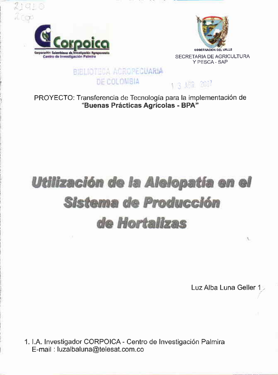 1. l.A. Investigador CORPOICA - Centro de Investigación Palmira