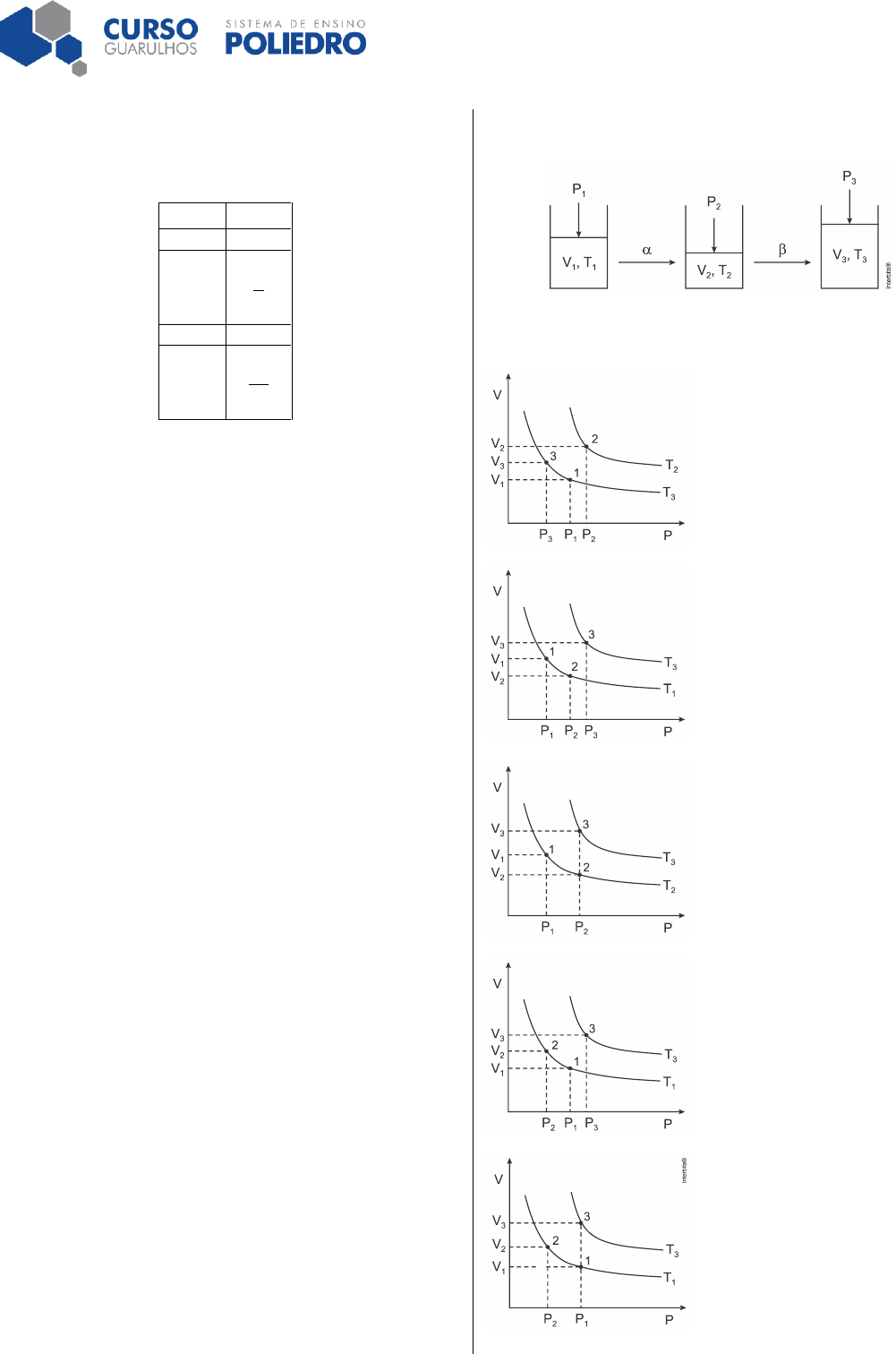 Prof. Túlio Química Página 1 de 2 Lista de Exercícios – Gases I 1. (Uerj 2018) Quatro balões esféricos são preenchidos isotermicamente com igual número de mols de um gás ideal. A temperatura do gás é a mesma nos balões, que apresentam as seguintes medidas de raio: Balão Raio I 𝑅 II 𝑅 2 III 2𝑅 IV 2𝑅 3 A pressão do gás é maior no balão de número: a) I b) II c) III d) IV 2. (Mackenzie 2018) Uma amostra de 20 𝑔 de um gás ideal foi armazenada em um recipiente de 15,5 𝐿, sob pressão de 623 𝑚𝑚𝐻𝑔, a uma temperatura de 37 °𝐶. Dentre os gases elencados abaixo, aquele que podia representar esse gás ideal é o Dados: - massas molares (𝑔 ⋅ 𝑚𝑜𝑙−1) 𝐻 = 1, 𝐶 = 12, 𝑁 = 14, 𝑂 = 16, 𝐴𝑟 = 40 - constante universal dos gases ideais (𝑚𝑚𝐻𝑔 ⋅ 𝐿 ⋅ 𝑚𝑜𝑙−1 ⋅ 𝐾−1) = 62,3 a) gás hidrogênio. b) gás carbônico. c) gás argônio. d) gás etano. e) gás nitrogênio. 3. (Ufpr 2018) Mergulhadores que utilizam cilindros de ar estão sujeitos a sofrer o efeito chamado “narcose pelo nitrogênio” (ou “embriaguez das profundezas”). Devido à elevada pressão parcial do nitrogênio na profundidade das águas durante o mergulho, esse gás inerte se difunde no organismo e atinge o sistema nervoso, causando efeito similar a embriaguez pelo álcool ou narcose por gases anestésicos. A intensidade desse efeito varia de indivíduo para indivíduo, mas em geral começa a surgir por volta de 30 𝑚 de profundidade. No mergulho, a cada 10 𝑚 de profundidade, aproximadamente 1 𝑎𝑡𝑚 é acrescida à pressão atmosférica. A composição do ar presente no cilindro é a mesma da atmosférica e pode ser considerada como 80% 𝑁2 e 20% 𝑂2. Dados: 𝑃𝑉 = 𝑛𝑅𝑇; 𝑅 = 0,082 𝐿 ⋅ 𝑎𝑡𝑚 ⋅ 𝐾−1 ⋅ 𝑚𝑜𝑙−1. a) Um mergulhador está numa profundidade de 30 𝑚. Qual é a pressão total a que esse mergulhador está submetido? b) Calcule a pressão parcial de 𝑁2 inspirada pelo mergulhador que utiliza o cilindro a 30 𝑚 de profundidade. Mostre o cálculo. c) Considere um mergulhador profissional que possui uma capacidade pulmonar de 6 litros. Calcule a quantidade de matéria de 𝑁2 na condição de pulmões totalmente cheios de ar quando o mergulhador está a 30 𝑚 de profundidade e à temperatura de 298 𝐾 (25 °𝐶). Mostre o cálculo. 4. (Ime 2018) Um sistema fechado contendo um gás ideal no estado 1 sofre as transformações 𝛼 e 𝛽, conforme indicado na figura abaixo. Sabendo que a transformação 𝛼 é isotérmica e 𝛽 isobárica, indique o gráfico que representa os estados do sistema. a) b) c) d) e) Prof. Túlio Química Página 2 de 2 5. (Mackenzie 2018) Certa massa fixa de um gás ideal, sob temperatura de 30 °𝐶 e pressão de 2 𝑎𝑡𝑚, foi submetida a uma transformação isocórica, em que sua temperatura foi aumentada em 150 unidades. Dessa forma, é correto afirmar que, durante a transformação, a) além do volume, a pressão manteve-se constante. b) apenas o volume permaneceu constante, e no final, a pressão exercida por essa massa gasosa, foi aumentada para aproximadamente 12 𝑎𝑡𝑚. c) apenas o volume permaneceu constante, e no final, a pressão exercida por essa massa gasosa, foi aumentada para aproximadamente 3 𝑎𝑡𝑚. d) apenas o volume permaneceu constante, e no final, a pressão exercida por essa massa gasosa, foi diminuída para aproximadamente 1 𝑎𝑡𝑚. e) apenas o volume permaneceu constante, e no final, a pressão exercida por essa massa gasosa, foi diminuída para aproximadamente 0,33 𝑎𝑡𝑚. 6. (Acafe 2017) Baseado nos conceitos sobre os gases, analise as afirmações a seguir. I. A densidade de um gás diminui à medida que ele é aquecido sob pressão constante. II. A densidade de um gás não varia à medida que este é aquecido sob volume constante. III. Quando uma amostra de gás é aquecida sob pressão constante é verificado o aumento do seu volume e a energia cinética média de suas moléculas mantém-se constante. Todas as afirmações corretas estão em: a) I – II – III b) II – III c) apenas I. d) I – II 7. (Fuvest 2017) Os pneus das aeronaves devem ser capazes de resistir a impactos muito intensos no pouso e bruscas alterações de temperatura. Esses pneus são constituídos de uma câmara de borracha reforçada, preenchida com o gás nitrogênio (𝑁2) a uma pressão típica de 30 𝑎𝑡𝑚 a 27 °𝐶. Para a confecção dessa câmara, utiliza-se borracha natural modificada, que consiste principalmente do poli-isopreno, mostrado a seguir: −𝐶𝐻2 − 𝐶(𝐶𝐻3) = 𝐶𝐻 − 𝐶𝐻2 − 𝐶𝐻2 − 𝐶(𝐶𝐻3) = 𝐶𝐻 − 𝐶𝐻2 − 𝐶𝐻2 − 𝐶(𝐶𝐻3) = 𝐶𝐻 − 𝐶𝐻2 − Em um avião, a temperatura dos pneus, recolhidos na fuselagem, era −13 °𝐶 durante o voo. Próximo ao pouso, a temperatura desses pneus passou a ser 27 °𝐶, mas seu volume interno não variou. a) Qual é a pressão interna de um dos pneus durante o voo? Mostre os cálculos. b) Qual é o volume interno desse mesmo pneu, em litros, dado que foram utilizados 14 kg de N2 para enchê-lo? Mostre os cálculos. c) Escreva a fórmula estrutural do monômero do poli-isopreno. Note e adote: Massa molar do 𝑁2 = 28 𝑔 𝑚𝑜𝑙 Constante universal dos gases = 0,082 𝐿 ⋅ 𝑎𝑡𝑚 ⋅ 𝐾−1 ⋅ 𝑚𝑜𝑙−1 𝐾 = °𝐶 + 273 8. (Uece 2017) No laboratório de química, onde é comum recolher- se um gás pelo deslocamento de água, foram coletados 400 𝑚𝐿 de gás oxigênio a 25 °𝐶 e 1 𝑎𝑡𝑚 de pressão. Sabendo-se que a pressão de vapor da água na mesma temperatura é 0,03 𝑎𝑡𝑚, é correto afirmar que o volume de oxigênio seco obtido nas mesmas condições de temperatura e pressão é a) 328,0 𝑚𝐿. b) 388,0 𝑚𝐿. c) 368,0 𝑚𝐿. d) 354,0 𝑚𝐿. 9. (Unigranrio - Medicina 2017) Gases ideais 