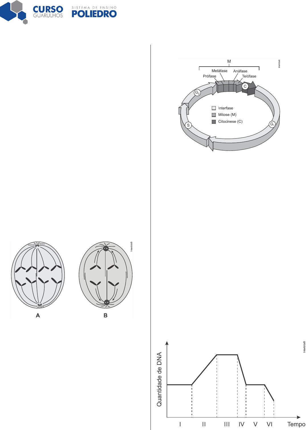 Prof. Ambrósio Biologia Página 1 de 2 Lista de Exercícios – Divisão Celular 1. (Fuvest 2018) Células de embrião de drosófila (2n 8),= que estavam em divisão, foram tratadas com uma substância que inibe a formação do fuso, impedindo que a divisão celular prossiga. Após esse tratamento, quantos cromossomos e quantas cromátides, respectivamente, cada célula terá? a) 4 e 4. b) 4 e 8. c) 8 e 8. d) 8 e 16. e) 16 e 16. 2. (G1 - cftmg 2018) Mitose e meiose são processos de divisão celular que, apesar de suas diferenças, podem estar relacionados à reprodução. De maneira geral, essa é a função da meiose em organismos pluricelulares, e, da mitose, em organismos unicelulares. Dessa forma, nos organismos unicelulares, a mitose será responsável por a) formar gametas de alta fecundidade. b) estimular o crescimento do organismo. c) gerar descendentes geneticamente iguais. d) produzir número equivalente de células da meiose. 3. (Upf 2017) A figura abaixo representa duas células de um mesmo indivíduo em processo de divisão celular. Com base na figura, assinale a alternativa correta. a) A célula A representa a anáfase mitótica, e a célula B, a anáfase II da meiose. b) A célula A representa a anáfase I, e a célula B, a anáfase II, ambas da meiose. c) Nessa espécie, o número diploide de cromossomos é oito. d) O número de cromossomos no gameta masculino dessa espécie é quatro. e) A célula A representa anáfase II, e a célula B, a anáfase I, ambas da meiose. 4. (Pucsp 2017) A figura a seguir ilustra o ciclo celular. Na célula somática de um organismo diploide em que 2n 20,= espera-se encontrar a) 40 moléculas de DNA em 2G . b) 10 moléculas de DNA em C e 1G . c) 20 moléculas de DNA na metáfase. d) mais moléculas de DNA em 1G que em S. 5. (Pucrj 2017) Sobre os processos de divisão celular (meiose e mitose), verifica-se que: a) na anáfase (mitose), ocorre a separação das cromátides irmãs, enquanto na anáfase I (meiose) ocorre a separação dos cromossomos homólogos. b) ao final do processo meiótico, uma célula de conjunto cromossômico 2n gera duas células-filhas de conjunto cromossômico n. c) ao final do processo mitótico, uma célula de conjunto cromossômico 2n gera duas células-filhas de conjunto cromossômico n. d) tanto a meiose quanto a mitose geram variação genética. e) o crossing-over ocorre na metáfase I. 6. (Fac. Albert Einstein - Medicina 2016) O gráfico abaixo refere-se ao processo de divisão celular que ocorre durante a espermatogênese humana: Prof. Ambrósio Biologia Página 2 de 2 Nesse processo de divisão ocorre a) duplicação dos cromossomos nos intervalos I e II e as fases que caracterizam esse processo ocorrem nos intervalos III, IV, V e VI. b) duplicação dos cromossomos nos intervalos II e III e as fases que caracterizam esse processo ocorrem nos intervalos IV, V e VI. c) separação de cromátides-irmãs, levando à formação de células com 23 cromossomos simples ao final do intervalo IV e maturação dos espermatozoides nos intervalos V e VI. d) separação de cromossomos homólogos no intervalo IV e separação de cromátides-irmãs no intervalo VI. 7. (Ufrgs 2016) Os diagramas abaixo se referem a células em diferentes fases da meiose de um determinado animal. Os diagramas 1, 2 e 3 correspondem, respectivamente, a a) prófase I, metáfase I e telófase II. b) prófase II, anáfase I e telófase I. c) prófase I, metáfase II e anáfase II. d) prófase II, anáfase II e telófase I. e) prófase I, anáfase I e metáfase II. 8. (Pucpr 2015) Sobre a divisão celular, considerando a prófase I da Meiose I, é CORRETO dizer que: a) a característica mais marcante do diplóteno é que os cromossomos ainda emparelhados se cruzam em certos pontos chamados quiasmas. b) no paquíteno ocorre o afastamento dos cromossomos homólogos e os cromômeros são bem visíveis formando as cromátides-irmãs. c) no leptóteno, o emparelhamento dos cromossomos é chamado de sinapse cromossômica. d) na diacinese, as cromátides permanecem no centro celular, a carioteca se refaz, os nucléolos reaparecem e os centríolos atingem os polos celulares. e) a prófase I é uma fase curta em que os centríolos que não sofreram duplicação na interfase permanecem no centro celular e a carioteca se desintegra ao final dessa fase. 9. (Fuvest 2015) Na gametogênese humana, a) espermatócitos e ovócitos secundários, formados no final da primeira divisão meiótica, têm quantidade de DNA igual à de espermatogônias e ovogônias, respectivamente. b) espermátides haploides, formadas ao final da segunda divisão meiótica, sofrem divisão mitótica no processo de amadurecimento para originar espermatozoides. c) espermatogônias e ovogônias dividem-se por mitose e originam, respectivamente, espermatócitos e ovócitos primários, que entram em divisão meiótica, a partir da puberdade. d) ovogônias dividem-se por mitose e originam ovócitos primários, que entram em meiose, logo após o nascimento. e) espermatócitos e ovócitos primários originam o mesmo número de gametas, no final da segunda divisão meiótica. 10. (Famerp 2018) A figura representa uma célula em uma das fases de certa divisão celular. Supondo que essa divisão celular se concretize, gerando células-filhas, pode-se afirmar que a) serão originadas quatro células-filhas geneticamente idênticas. b) cada célula-filha terá quatro cromossomos diferentes. c) cada célula-filha terá dois cromossomos diferentes. d) serão originadas duas células-filhas geneticamente idênticas. e) a divisão ocorreu em uma célula somática, originando duas células-filhas idênticas. _______________________________________________ GABARITO 1. D 2. C 3. A 4. A 5. A 6. D 7. E 8. A 9. A 10. C