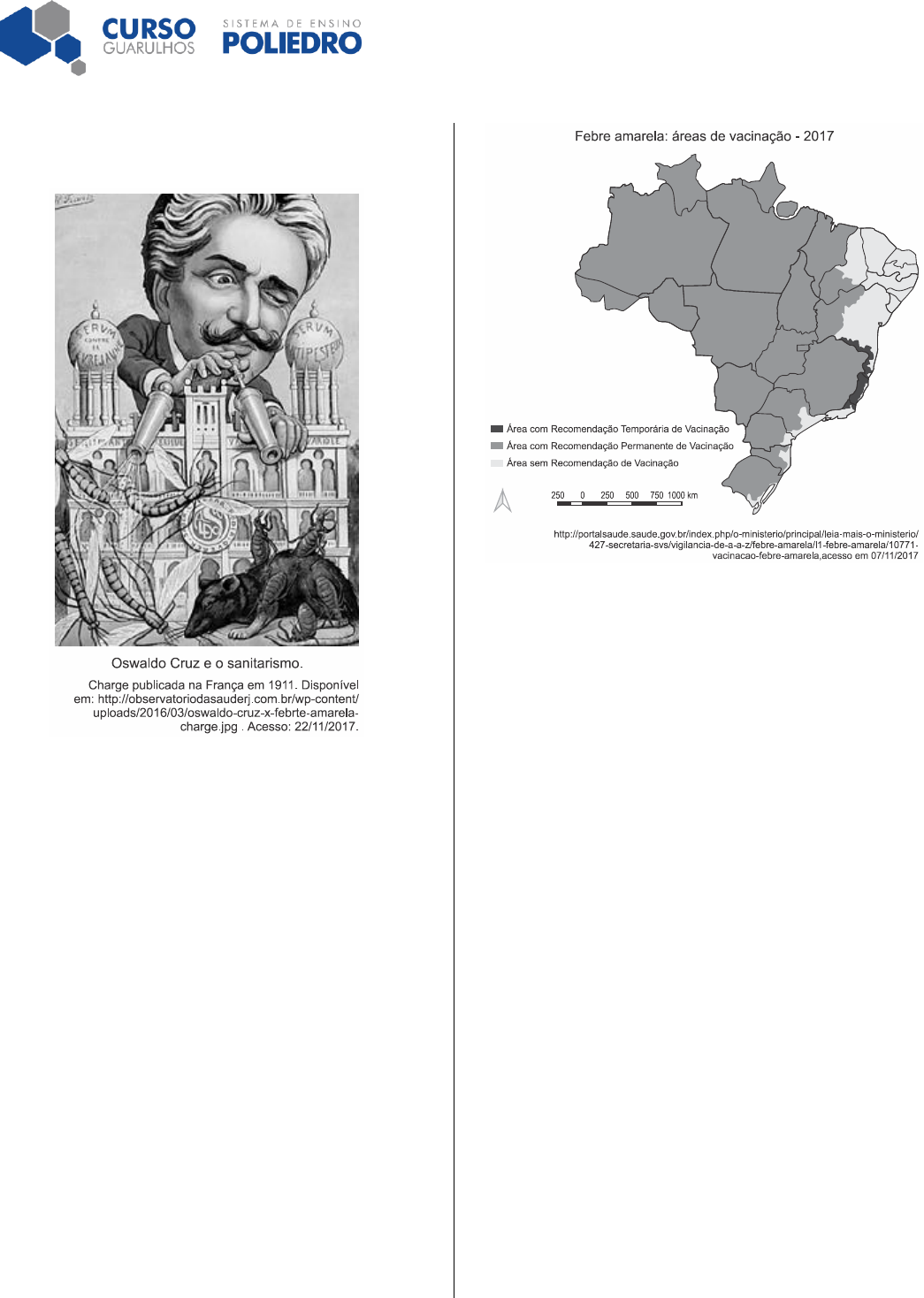 Profº. Marcon Geografia Página 1 de 7 População 1 1. SAÚDE PÚBLICA NO BRASIL “Parece propósito firme do governo violentar a população desta capital por todos os meios e modos. Como não bastasse [...]a vacinação obrigatória, entendeu provocar essas arruaças que, há dois dias já, trazem em sobressalto o povo. Desde ante-ontem que a polícia, numa ridícula exibição de força, provoca os transeuntes, ora os desafiando diretamente, ora agredindo-os, desde logo, com o chanfalho e com a pata de cavalo, ora, enfim, levantando proibições sobre determinadas pontos da cidade.” Correio da Manhã, 12 de novembro de 1904. Disponível em: http://www1.uol.com.br/rionosjornais/rj10.htm “Diante de antigas e novas emergências sanitárias, como febre amarela, dengue, zika e chikungunya, é inevitável se questionar por que o Brasil parece patinar no combate ao Aedes aegypti e a doenças por ele transmitidas, a despeito dos êxitos obtidos pelos seus cientistas no início do século passado e dos avanços científicos e tecnológicos que se sucederam desde então. Oswaldo Cruz morreu em 11 de fevereiro de 1917 sem testemunhar o surto [febre amarela] que se abateu sobre a cidade já em 1928. De lá para cá, a história tomou rumos que o sanitarista dificilmente suporia: cem anos após a sua morte, o Rio de Janeiro, já não mais sede do governo federal, vive novamente a apreensão de ter a febre amarela batendo a suas portas. Os paralelos com o passado indicam que o país parece ter ignorado algumas lições que poderia ter aprendido ao longo de sua história.” (FIOCRUZ, Legado, https://portal.fiocruz.br/pt-br/content/legado, acesso em 15/11/2017 A partir dos textos e das imagens, situe os dois momentos e as respectivas políticas de saúde pública, tendo em vista a relação entre os poderes públicos e a população. Profº. Marcon Geografia Página 2 de 7 2. O gráfico apresenta a dinâmica demográfica brasileira do final do século XIX até a década atual. A partir de sua leitura, está correta a seguinte associação: Período Fenômeno Fator associado a) 1880-1910 Boom emigratório Redução do quantitativo b) 1950-1960 Explosão demográfica Queda das taxas de mortalidade c) 1970-1990 Bônus demográfico Baixa razão de dependência d) 2000-2010 Implosão demográfica Índice de reposição negativo 3. Observe o gráfico abaixo, a respeito da sobremortalidade masculina (maior mortalidade da população masculina em relação à feminina) no Brasil, entre 1940 e 2015. Considere as afirmações abaixo, sobre a dinâmica populacional recente no Brasil. I. A sobremortalidade masculina, em 2015, concentra-se nos grupos de 15 a 19 anos, de 20 a 24 anos e de 25 a 29 anos. II. A alta incidência de mortes entre homens jovens adultos pode ser explicada pelo grande número de óbitos por causas violentas ou não naturais, que atingem com maior intensidade a população masculina. III. Os altos níveis de sobremortalidade masculina no grupo de adultos jovens em 2015, quando comparados a 1940, mostram que é um fenômeno de regiões que passaram por rápido processo de urbanização e metropolização. Profº. Marcon Geografia Página 3 de 7 Quais estão corretas? a) Apenas I. b) Apenas II. c) Apenas III. d) Apenas II e III. e) I, II e III. 4. Observe o gráfico a seguir, que mostra a evolução da participação dos grupos de idade na população brasileira no período de 1940 a 2050. Com base no gráfico e nos conhecimentos sobre a demografia brasileira, pode-se afirmar que: I. o aumento da participação de adultos e idosos no conjunto total da população é fruto da redução do número de óbitos. II. a queda da proporção de crianças no conjunto total da população brasileira está fortemente relacionada às elevadas taxas de mortalidade infantil que assolam o País. III. do ponto de vista demográfico, o Brasil vive uma fase favorável ao crescimento econômico, pois, com a redução das taxas de natalidade, houve uma redução da razão de dependência, isto é, do peso econômico das crianças e dos idosos sobre a população economicamente ativa do País. IV. ao final da década de 2030, a população brasileira deverá parar de crescer e logo sofrer redução, pois o número de óbitos tenderá a ser maior do que o número de nascimentos. V. a pressão demográfica observada atualmente no crescimento populacional revela a necessidade de aumento do número de vagas nas escolas e de leitos hospitalares. Assinale a alternativa em que todas as afirmativas estão corretas. a) I e III b) I e II c) III e IV d) III e V e) II, IV e V 5. ENVELHECIMENTO DA POPULAÇÃO Hoje, a idade média do brasileiro é 32,6 anos. Pelas estimativas do IBGE, a marca dos 40 anos será ultrapassada já em 2037 e, em 2060, chegará a 45,6. Nesta data, um quarto dos brasileiros terá mais de 65 anos. Disponível em: <https://veja.abril.com.br>. Acesso em: 25 jul. 2018 (adaptado). De acordo com as projeções apontadas no texto, a longevidade do brasileiro vem aumentando e apresentando uma nova estrutura etária com a passagem de a) percentuais altíssimos de crescimento vegetativo, nas décadas de 1980 e 1990, para declínio da longevidade a partir dos anos 2000. b) baixos índices de natalidade para altas taxas de natalidade e alto percentual de mortalidade infantil. c) altos índices de mortalidade e fecundidade para baixas taxas de longevidade e crescimento da população economicamente ativa. d) períodos de baixa mortalidade e baixa fecundidade para períodos de crescimento acelerado da natalidade e crescimento vegetativo. e) períodos de alta mortalidade e alta fecundidade para períodos de baixa mortalidade e gradual baixa fecundidade. 6. (G1 - cftrj 2019) Leia atentamente a tabela abaixo: Profº. Marcon Geografia Página 4 de 7 Brasil: População absoluta e densidade demográfica segundo Grandes Regiões - 2010 População Absoluta Densidade Demográfica 2(hab km ) Região Norte 15.864.4