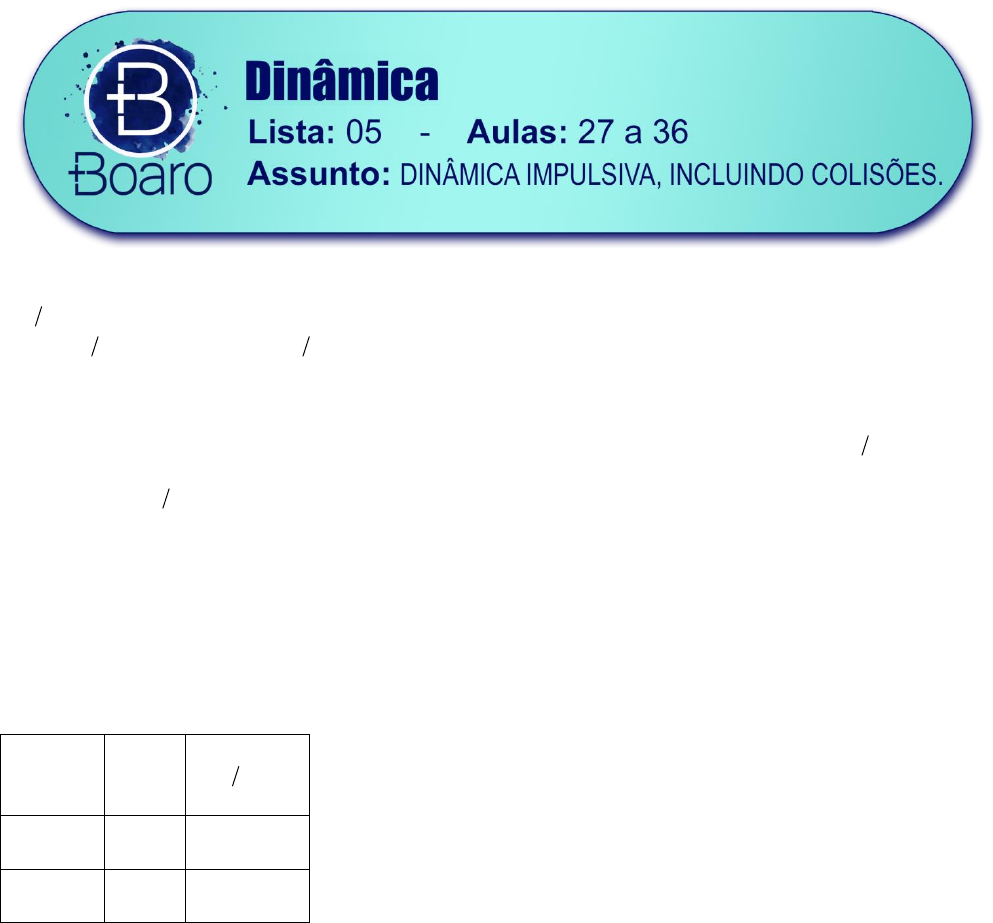EXC141. (Uece) Considere uma esfera muito pequena, de massa 1kg, deslocando-se a uma velocidade de 2 m s, sem girar, durante 3 s. Nesse intervalo de tempo, o momento linear dessa partícula é a) 2 kg m s. b) 3 s. c) 6 kg m s. d) 6 m. EXC142. (Pucrj) Um jogador de tênis, durante o saque, lança a bola verticalmente para cima. Ao atingir sua altura máxima, a bola é golpeada pela raquete de tênis, e sai com velocidade de 108 km h na direção horizontal. Calcule, em kg m s, o módulo da variação de momento linear da bola entre os instantes logo após e logo antes de ser golpeada pela raquete. Dado: Considere a massa da bola de tênis igual a 50 g. a) 1,5 b) 5,4 c) 54 d) 1.500 e) 5.400 EXC143. (Uerj) Em uma reportagem sobre as savanas africanas, foram apresentadas informações acerca da massa e da velocidade de elefantes e leões, destacadas na tabela abaixo. Massa (kg) Velocidade (km h) elefante 4.860 40,0 leão 200 81,0 Determine a razão entre a quantidade de movimento do elefante e a do leão. EXC144. (Ueg) Na olimpíada, o remador Isaquias Queiroz, ao se aproximar da linha de chegada com o seu barco, lançou seu corpo para trás. Os analistas do esporte a remo disseram que esse ato é comum nessas competições, ao se cruzar a linha de chegada. Em física, o tema que explica a ação do remador é a) o lançamento oblíquo na superfície terrestre. b) a conservação da quantidade de movimento. c) o processo de colisão elástica unidimensional. d) o princípio fundamental da dinâmica de Newton. e) a grandeza viscosidade no princípio de Arquimedes. EXC145. (Uerj) Um esquiador, com 70kg de massa, colide elasticamente contra uma árvore a uma velocidade de 72km / h. Calcule, em unidades do SI, o momento linear e a energia cinética do esquiador no instante da colisão. EXC146. (Uece) Ultimamente o futebol tem sido foco de noticiários em função da copa do mundo. Durante uma partida, suponha que a bola cai verticalmente sem girar e se choca com o solo. De modo simplificado, pode-se descrever esse choque como uma colisão entre dois corpos, sendo um a bola e o outro o planeta Terra. Caso se considere este evento como uma colisão elástica, é correto afirmar que há conservação a) da energia potencial da bola. b) da energia potencial da Terra. c) do momento linear total do sistema composto pela bola e o planeta. d) do momento linear da bola. EXC147. (Uerj) Observe o gráfico a seguir, que indica a força exercida por uma máquina em função do tempo. Admitindo que não há perdas no sistema, estime, em N s, a impulsão fornecida pela máquina no intervalo entre 5 e 105 segundos. EXC148. (Ufjf-pism 1) Nas cobranças de faltas em um jogo de futebol, uma bola com massa de 500 gramas pode atingir facilmente a velocidade de 108 km h. Supondo que no momento do chute o tempo de interação entre o pé do jogador e a bola seja de 0,15 segundos, podemos supor que a ordem de grandeza da força que atua na bola, em newton, é de: a) 010 b) 110 c) 210 d) 310 ) 410 EXC149. (Uerj) Em uma mesa de sinuca, as bolas A e B, ambas com massa igual a 140 g, deslocam-se com velocidades AV e BV , na mesma direção e sentido. O gráfico abaixo representa essas velocidades ao longo do tempo. Após uma colisão entre as bolas, a quantidade de movimento total, em kg m s, é igual a: a) 0,56 b) 0,84 c) 1,60 d) 2,24 EXC150. (Uel) Na Copa do Mundo de 2018, observou-se que, para a maioria dos torcedores, um dos fatores que encantou foi o jogo bem jogado, ao passo que o desencanto ficou por conta de partidas com colisões violentas. Muitas dessas colisões travavam as jogadas e, não raramente, causavam lesões nos atletas. A charge a seguir ilustra a narração de um suposto jogo da Copa, feita por físicos: Com base na charge e nos conhecimentos sobre colisões e supondo que, em um jogo de futebol, os jogadores se comportam como um sistema de partículas ideais, é correto afirmar que, em uma colisão a) elástica, a energia cinética total final é menor que a energia cinética total inicial. b) elástica, a quantidade de movimento total final é menor que a quantidade de movimento total inicial. c) parcialmente inelástica, a energia cinética total final é menor que a energia cinética total inicial. d) perfeitamente inelástica, a quantidade de movimento total inicial é maior que a quantidade de movimento total final. e) parcialmente inelástica, a quantidade de movimento total final é menor que a quantidade de movimento total inicial. EXC151. (Pucrj) Sobre uma superfície horizontal sem atrito, duas partículas de massas m e 4m se movem, respectivamente, com velocidades 2v e v (em módulo) na mesma direção e em sentidos opostos. Após colidirem, as partículas ficam grudadas. Calcule a energia cinética do conjunto após a colisão, em função de m e v. a) 0 b) 20,2 mv c) 20,4 mv d) 22,5 mv e) 23,0 mv EXC152. (Uece) Considerando-se o módulo do momento linear, p, de um carro de massa m, a energia cinética do carro pode ser corretamente escrita como a) 2p . 2m b) p . m c) p . 2m d) 2 m . 2p EXC153. (Pucrj) Um corpo A colide com um corpo B que se encontra inicialmente em repouso. Os dois corpos estão sobre uma superfície horizontal sem atrito. Após a colisão, os corpos saem unidos, com uma velocidade igual a 20% daquela inicial do corpo A. Qual é a razão entre a massa do corpo A e a massa do corpo B, A Bm m ? a) 0,20 b) 0,25 c) 0,80 d) 1,0 e) 4,0 EXC154. (G1 - cftmg) Considere dois astronautas com massas iguais a M que estão inicialmente em repouso e distantes de qualquer corpo celeste. Um deles resolve lançar uma mochila de ferramentas também de massa igual a M para o outro, empurrando-a com uma força de módulo F. Admitindo que uma jogada completa se dá no início do arremesso até que o outro agarre a mochila e que o impulso permaneça o mesmo, a quantidade de jogada(s) completa(s) que os astronautas conseguem realizar é a) uma. b) duas. c) três. d) mais de três. EXC155. (Uerj)