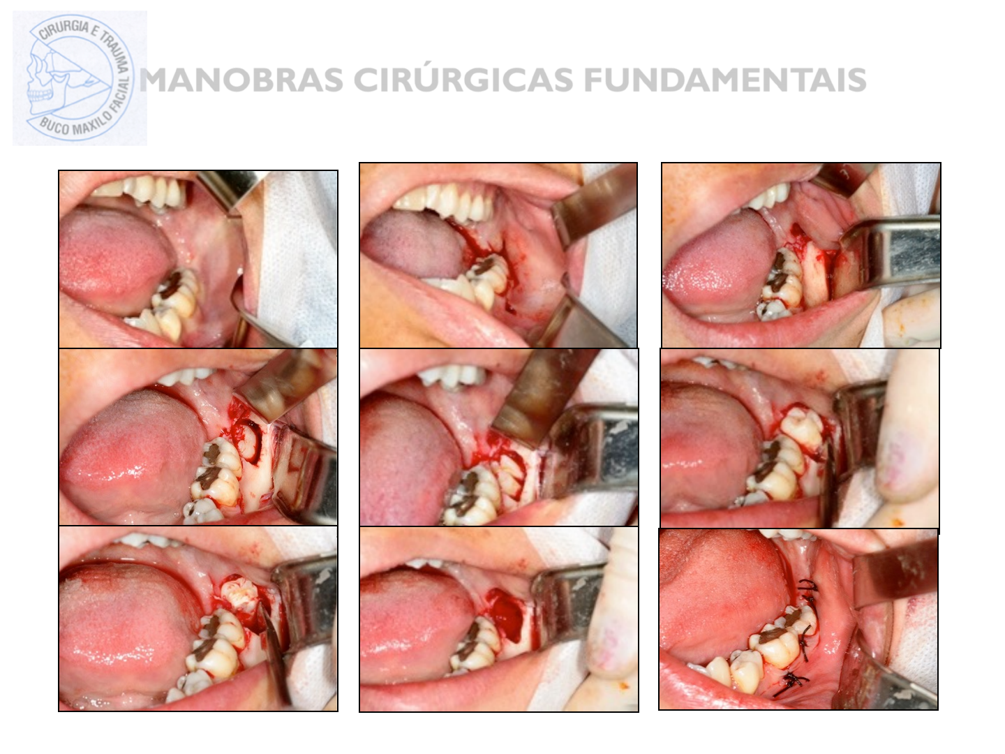 MANOBRAS CIRÚRGICAS FUNDAMENTAIS MANOBRAS CIRÚRGICAS FUNDAMENTAIS Associe cada imagem com a manobra fundamental correta A B C D E F G RECEPÇÃO ß IDENTIFICAÇÃO ß QUEIXAS ß ANAMNESE + EXAME FÍSICO + EXAMES DE IMAGENS + EXAMES LABORATORIAIS ß NECESSIDADE X OPORTUNIDADE ß TRATAMENTO PRÉ-OPERATÓRIO ß PLANEJAMENTO (Técnica cirúrgica utilizada) Þ TRATAMENTO CIRÚRGICO ß TRATAMENTO PÓS-OPERATÓRIO FUNDAMENTOS E PRINCÍPIOS Exame clínico hemostasia síntese exérese diérese Ato Operatório Manobras Cirúrgicas Fundamentais DIÉRESE • Grego - Diairesis = divisão • Manobra cirúrgica que consiste em separar tecidos para abordagem do objetivo cirúrgico Manobras Cirúrgicas Fundamentais Princípios: � Conservar maior quantidade de tecidos � Dissecção - localizar e individualizar um órgão � Evitar dissecções extensas (complicações) Manobras de Diérese 1) Incisão -rompem a integridade tecidual 2) Divulsão -interrompem a integridade tecidual A) sindesmotomia B) descolamento mucoperiostal C) divulsão de tecidos moles 3) Osteotomia - rompem a integridade tecidual 4) Odontosecção - rompem a integridade tecidual Manobras Cirúrgicas Fundamentais 1) INCISÃO Bisturi – cabo bard parker no 3 Lâminas - 11, 12, 15 e 15C Manobras Cirúrgicas Fundamentais • https://youtu.be/1TSlcBCqS-4 • Montagem de cabo de bisturi e lâmina Manobras Cirúrgicas Fundamentais https://youtu.be/1TSlcBCqS-4 INCISÃO Bisturi - empunhadura “forma de caneta” Manobras Cirúrgicas Fundamentais � Planejamento � Corte firme e contínuo � Mucoperiostal (intra-oral) � Estruturas nobres � Apoio em osso sadio PLANOS TECIDUAIS Incisão extra-oral � pele (derme e epiderme) � tec. cel. subcutâneo � aponeurose � tecido muscular � periósteo � osso Incisão intra-oral � mucosa �periósteo �osso Manobras Cirúrgicas Fundamentais início a 90° extensão a 45° término a 90° Incisão Qualidade das Incisões Irrigação sangüínea do retalho • retalho com relaxantes (alívios) divergentes – base ampla • não realizar incisões relaxantes sobre as papilas • base do retalho (x) maior que a altura (Y) – nutrição (X=2y) Manobras Cirúrgicas Fundamentais X Adequada visualização do campo operatório • Conhecimento da anatomia topográfica regional • O retalho tem que expor amplamente o campo operatório • Incisão menor não cicatriza mais rápido • “Tão grande quanto necessária e tão pequena quanto possível” Manobras Cirúrgicas Fundamentais Tipos de Incisões � Neümann Manobras Cirúrgicas Fundamentais Neümann modificada Novak-Peter Intrasulcular + 1 alívio Intrasulcular + 2 alívios Tipos de Incisões � Wassmund Manobras Cirúrgicas Fundamentais � Partsch Semilunar acima da gengiva inserida Trapezoidal acima da gengiva inserida Incisão de Ochsenbein-Luebke Acima da gengiva inserida acompanhando a arquitetura das papi las, com 2 incisões de a l ív io 16 Ariane Leme Tamaro Mais usado para pessoas que tem o sorriso gengival, pois a cicatriz é acompanha a cervical do dente. � Envelope Manobras Cirúrgicas Fundamentais Intrasulcular Ariane Leme Tamaro ✳ Rompimento de fibras intrasulcular, e o descolamento. ✳ Não se faz alivio em regiões de 3o molar, palato → pode romper nervos e há pouca irrigação nessas regiões. � Envelope Manobras Cirúrgicas Fundamentais Intrasulcular 19 Envelope - 2 dentes anterior e um posterior Alívio um dente anterior e um posterior - evitar deiscência Ariane Leme Tamaro ✳ Neuman → 1 dente anterior e 1 dente posterior, com alívio ✳ Pode ser modificada para lesões maiores Ariane Leme Tamaro ✳ Suporte ósseo → o dente em tratamento deve ser rodeado de osso, precisa de espaço ao redor, para evitar abertura de pontos (deiscência) • Tipos de Incisões para 3 Molar Inferior Incisão de Winter (ampliada) https://youtu.be/2IT8Bnp5sK4 Ariane Leme Tamaro ✳ Relaxante na mesial do 2o molar ✳ Intrasucular em cima do rebordo Incisão de Dorrance - Y Frank Botera - 2013 Ariane Leme Tamaro ✳ O Y foge do canal incisivo e do nervo incisivo apontados pela seta Ariane Leme Tamaro Incisão duplo Y •https://docplayer.com.br/13011146- A-cirurgia-pre-protetica-para-torus- palatino-relato-de-caso.html https://docplayer.com.br/13011146-A-cirurgia-pre-protetica-para-torus-palatino-relato-de-caso.html https://docplayer.com.br/13011146-A-cirurgia-pre-protetica-para-torus-palatino-relato-de-caso.html https://docplayer.com.br/13011146-A-cirurgia-pre-protetica-para-torus-palatino-relato-de-caso.html DIÉRESE - 1) Incisões 3° molar superior - Winter Manobras Cirúrgicas Fundamentais 24 Winter Manobras Cirúrgicas Fundamentais DIÉRESE - 2) Divulsão Empunhadura em forma de caneta Empunhadura em forma dígito-palmar Diérese do tecido ósseo Subperióstica = despojar o periósteo do osso - descoladores de freer e molt FÓRCEPS - Desinserção das fibras gengivais que circundam o dente. - Evita dilacerar tecido gengival - Facilita a adaptação do fórceps no cemento. Manobras Cirúrgicas Fundamentais Divulsão A) Sindesmotomia Sindesmótomo Ariane Leme Tamaro ✳ Descola os dentos de seus tecidos moles mais superficiais. Manobras Cirúrgicas Fundamentais Divulsão – B) descolamento mucoperiostal - Requer incisão prévia - Descoladores de Freer e Molt - Despojar o tecido ósseo do periósteo e gengiva. - Iniciar em gengiva inserida proxima ao dente - Retalho é protegido pelo afastador de Minesota 29 Ariane Leme Tamaro ✳ Descolamente inicia-se pela sulcular ou pela união entre a sulcular e a relaxante, para não dilacerar 31 C) DIVULSÃO DE TECIDOS MOLES Tesouras rombas - Metzenbaum 33 Manobras Cirúrgicas Fundamentais 3) Osteotomia Alta rotação\baixa rotação e peça reta • Brocas cirúrgicas longas – esféricas (4,6,8), tronco cônicas (701, 702, 703 e Zecrya) •Serras cirúrgicas (reciprocante, sagital e oscilatória) •Cirurgia piezoelétrica Ariane Leme Tamaro ✳ Canaleta. ✳