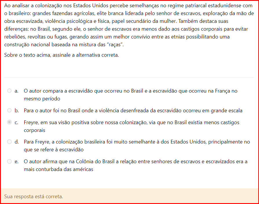 Ao analisar a colonização nos Estados Unidos percebe semelhanças no regime patriarcal estadunidense com o brasileiro: grandes fazendas agrícolas, elite branca liderada pelo senhor de escravos, exploração da mão de obra escravizada, violência psicológica e física, papel secundário da mulher. Também destaca suas diferenças: no Brasil, segundo ele, senhor de escravos era menos dado aos castigos corporais para evitar rebeliões, revoltas ou fugas, gerando assim um melhor convívio entre as etnias possibilitando uma construção nacional baseada na mistura das "raças". Sobre texto acima, assinale a alternativa correta. a. autor compara a escravidão que ocorreu no Brasil e a escravidão que ocorreu na França no mesmo período b. Para o autor foi no Brasil onde a violência desenfreada da escravidão ocorreu em grande escala c. Freyre, em sua visão positiva sobre nossa colonização, via que no Brasil existia menos castigos corporais d. Para Freyre, a colonização brasileira foi muito semelhante à dos Estados Unidos, principalmente no que se refere à escravidão e. autor afirma que na Colônia do Brasil a relação entre senhores de escravos e escravizados era a mais conturbada das américas