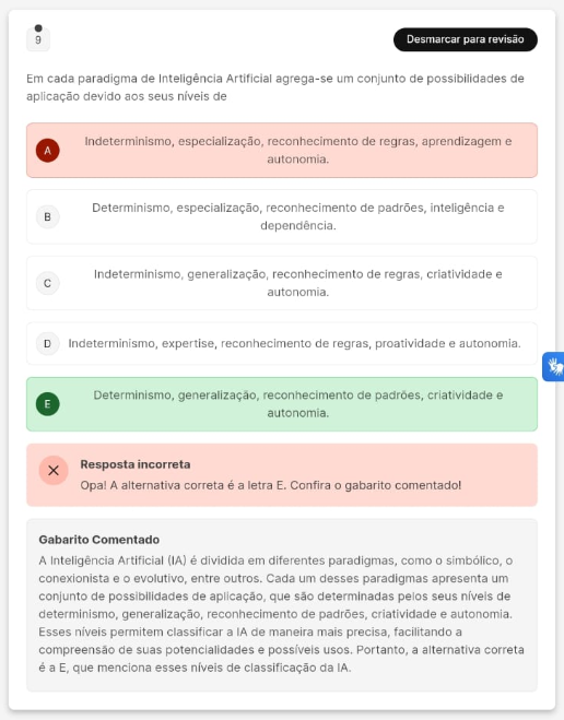 Em cada paradigma de Inteligência Artificial agrega-se um conjunto de possibilidades de aplicação devido aos seus níveis de Indeterminismo, reconhecimento de regras, aprendizagem e A Determinismo, reconhecimento de padrões, inteligência e B Indeterminismo, generalização, reconhecimento de regras, criatividade e C D Indeterminismo, expertise, reconhecimento de regras, proatividade e Determinismo, reconhecimento de padrões, criatividade e E autonomia.