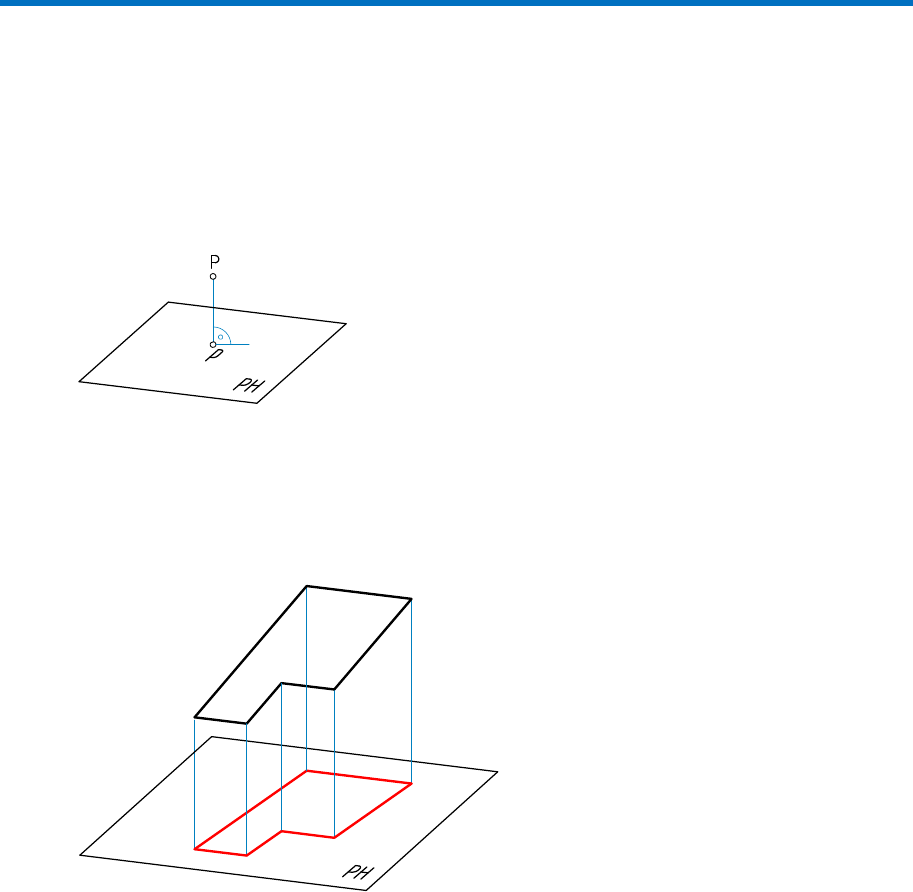 _________________________________________________________________________________________________ Editorial Alarcón. Apuntes de Dibujo Técnico. ISBN: 978−84−613−1320−4 www.editorial-alarcon.es 168 El sistema diédrico D1 Generalidades: El punto Generalidades Proyección ortogonal de un punto sobre un plano Proyección ortogonal o, simplemente proyección de un punto sobre un plano, es el pie de la perpendicular trazada desde el punto al plano. La recta que proyecta el punto se llama proyectante. Proyección de una figura sobre un plano Es la figura que forman las proyecciones de cada uno de sus puntos. Proyección de una recta sobre un plano Si la recta es perpendicular al plano su proyección es un punto. Si la recta es paralela al plano, su proyección es una recta paralela a la dada. Si la recta es oblicua al plano, su proyección es otra recta que corta a la dada oblicuamente. D1 Sistema diédrico. El punto. _________________________________________________________________________________________________ Editorial Alarcón. Apuntes de Dibujo Técnico. ISBN: 978−84−613−1320−4 www.editorial-alarcon.es 169 Proyección de un segmento sobre un plano Es el segmento determinado por las proyecciones de sus extremos. Plano Un plano es la superficie definida por dos rectas que se cortan, por un punto y una recta o, por dos rectas paralelas. Si una recta tiene dos puntos en un plano toda ella está contenida en ese plano. Postulados del plano Si una recta tiene dos puntos comunes con un plano, está contenida en dicho plano. Una recta de un plano lo divide en dos partes llamadas semiplanos. Para pasar de un punto de un semiplano a uno del otro es preciso atravesar la recta. Un plano divide al espacio en dos partes llamadas semiespacios. Por un punto o una recta pasan infinitos planos. Determinación de planos Un plano queda determinado por: Dos rectas que se cortan. Tres puntos no alineados. Una recta y un punto exterior a ella. Dos rectas paralelas. Posiciones relativas entre recta y plano Que no tengan ningún punto común. Implica que la recta y el plano son paralelos. D1 Sistema diédrico. El punto. _________________________________________________________________________________________________ Editorial Alarcón. Apuntes de Dibujo Técnico. ISBN: 978−84−613−1320−4 www.editorial-alarcon.es 170 Que tengan un punto común. Son secantes, la recta corta al plano. El punto común es el punto de intersección entre la recta y el plano. Que tengan dos puntos comunes. En este caso la recta está contenida en el plano. Posiciones relativas entre dos rectas Que se corten. Tienen un punto común o de intersección. Que sean paralelas. Tienen un punto común en el infinito y están contenidas en el mismo plano. Que se crucen. No tienen ningún punto común y no están contenidas en el mismo plano. Posiciones relativas entre dos planos Que no tengan ningún punto común. Implica que son paralelos. Que tengan un punto común. Son secantes, tienen una recta común que pasa por dicho punto. Que tengan tres puntos comunes no alineados. En este caso coinciden en toda su extensión. Intersección de planos Si dos planos tienen un punto común, tienen común una recta que pasa por dicho punto. Esta recta se denomina intersección de ambos planos o traza de un plano sobre el otro. Sistema diédrico de representación Proyección diédrica La proyección diédrica es cilíndrica y ortogonal, esto quiere decir que la proyección de un punto sobre un plano es la intersección de la recta perpendicular al plano que pasa por el punto. D1 Sistema diédrico. El punto. _________________________________________________________________________________________________ Editorial Alarcón. Apuntes de Dibujo Técnico. ISBN: 978−84−613−1320−4 www.editorial-alarcon.es 171 Característica fundamental del Sistema diédrico: las figuras planas situadas en los planos de proyección o en planos paralelos a ellos se observan en verdadera magnitud. Elementos de referencia Los elementos de referencia son el plano horizontal de proyección, el plano vertical de proyección, y ocasionalmente un plano de perfil. Los planos horizontal y vertical son perpendiculares entre sí. El plano de perfil es perpendicular a los planos horizontal y vertical de proyección. La posición del plano de perfil es arbitraria a lo largo del eje X. La intersección del plano horizontal con el vertical determina la posición del eje de coordenadas X. La intersección del plano horizontal con un plano de perfil determina la posición del eje de coordenadas Y. La intersección del plano vertical con el plano de perfil determina la posición del eje de coordenadas Z. La Línea de Tierra (eje X) es la intersección de los planos vertical y horizontal. A menudo, no es preciso representarla. Planos bisectores: son los planos que dividen en dos ángulos iguales los ángulos diédros rectos que forman los planos de proyección horizontal y vertical. D1 Sistema diédrico. El punto. _________________________________________________________________________________________________ Editorial Alarcón. Apuntes de Dibujo Técnico. ISBN: 978−84−613−1320−4 www.editorial-alarcon.es 172 Coordenadas del punto Desviación o coordenada x de un punto es su distancia al plano de perfil. Alejamiento o coordenada y de un punto es su distancia al plano vertical. Cota o coordenada z de un punto es su distancia al plano horizontal. Representación del punto Proyección del punto P(x,y,z) del espacio sobre los planos de referencia horizontal, vertical y de perfil. Trazando por el punto P perpendiculares a los planos de proyección obtendremos: p, es la proyección horizontal (planta) del punto P p', es la proyección vertical (alzado) del punto P p'', es la proyección lateral (perfil) del punto P D1 Sistema diédrico. El punto. _________________________________________________________________________________________________ Editorial Alarcón. A