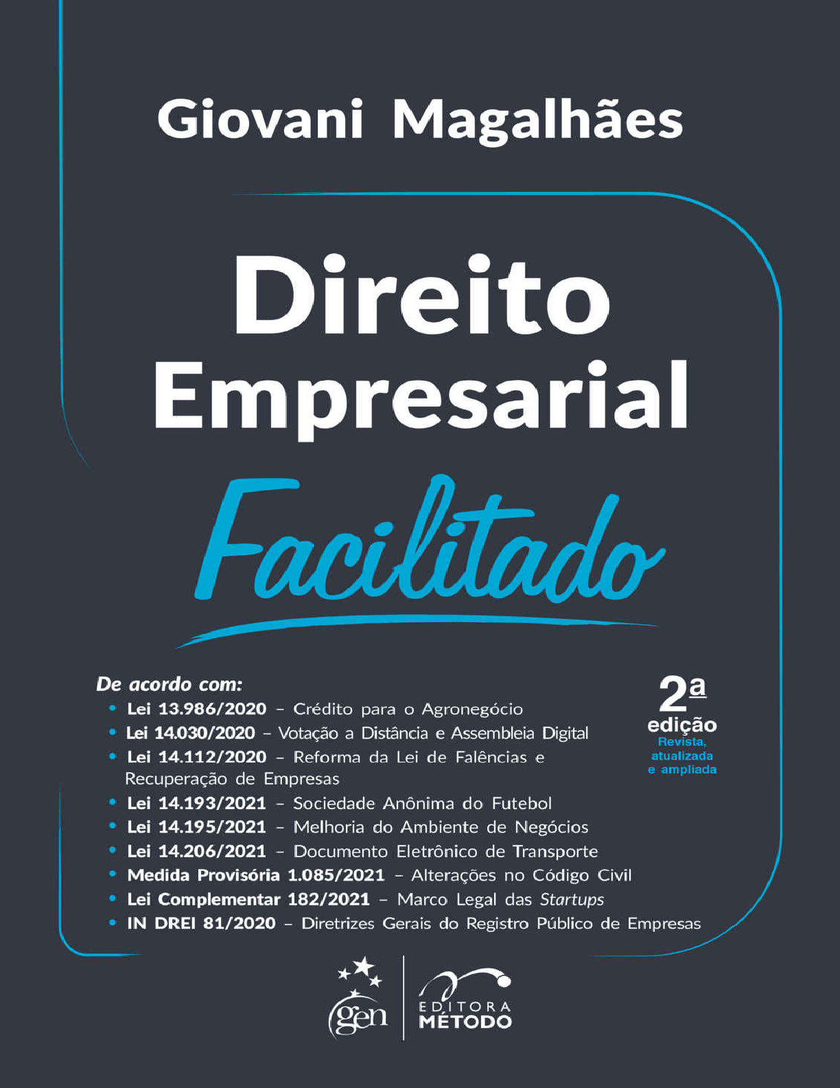 O autor deste livro e a editora empenharam seus melhores esforços para assegurar que as informações e os procedimentos apresentados no texto estejam em acordo com os padrões aceitos à época da publicação, e todos os dados foram atualizados pelo autor até a data de fechamento do livro. Entretanto, tendo em conta a evolução das ciências, as atualizações legislativas, as mudanças regulamentares governamentais e o constante fluxo de novas informações sobre os temas que constam do livro, recomendamos enfaticamente que os leitores consultem sempre outras fontes fidedignas, de modo a se certificarem de que as informações contidas no texto estão corretas e de que não houve alterações nas recomendações ou na legislação regulamentadora. Fechamento desta edição: 12.01.2022 O Autor e a editora se empenharam para citar adequadamente e dar o devido crédito a todos os detentores de direitos autorais de qualquer material utilizado neste livro, dispondo-se a possíveis acertos posteriores caso, inadvertida e involuntariamente, a identificação de algum deles tenha sido omitida. Atendimento ao cliente: (11) 5080-0751 | faleconosco@grupogen.com.br Direitos exclusivos para a língua portuguesa Copyright © 2022 by Editora Forense Ltda. Uma editora integrante do GEN | Grupo Editorial Nacional Travessa do Ouvidor, 11 – Térreo e 6º andar Rio de Janeiro – RJ – 20040-040 www.grupogen.com.br Reservados todos os direitos. É proibida a duplicação ou reprodução deste volume, no todo ou em parte, em quaisquer formas ou por quaisquer meios (eletrônico, mecânico, gravação, fotocópia, distribuição pela Internet ou outros), sem permissão, por escrito, da Editora Forense Ltda. Capa: Anderson Pereira Produção digital: Ozone CIP – BRASIL. CATALOGAÇÃO NA PUBLICAÇÃO. SINDICATO NACIONAL DOS EDITORES DE LIVROS, RJ. M166d mailto:faleconosco@grupogen.com.br http://www.grupogen.com.br/ 2. ed. Magalhães, Giovani Direito empresarial facilitado / Giovani Magalhães. – 2. ed. – Rio de Janeiro: Método, 2022. 680 p.; 23 cm. Inclui bibliografia ISBN 978-65-5964-398-1 1. Direito empresarial – Brasil – Problemas, questões, exercícios. 2. Serviço público – Brasil – Concursos. I. Título. 22-75543 CDU: 347.7(81) Meri Gleice Rodrigues de Souza – Bibliotecária – CRB-7/6439 À Cláudia Magalhães e ao Giovani Neto, pela paciência e entendimento em relação às minhas ausências, para que este projeto fosse finalizado. PREFÁCIOS Conheci o professor Giovani Magalhães pela internet, há muitos anos, quando nós dois ainda estávamos iniciando nossas carreiras acadêmicas: ele em Fortaleza-CE, e eu em Recife-PE. O professor Giovani era o administrador de uma comunidade virtual chamada Direito Empresarial, hospedada na extinta rede social Orkut. Desde que passei a fazer parte da comunidade e a interagir no seu fórum de discussões, pude perceber a vocação dele para o ofício de professor, bem como a sua dedicação em estudar profundamente a matéria. Giovani respondia pacientemente a todos que postavam perguntas com dúvidas, e já naquela época era possível perceber, nas suas manifestações, que se tratava de alguém muito estudioso e conhecedor do assunto. O tempo passou, o Orkut acabou, mas o nosso contato, a nossa amizade e a minha admiração pelo professor Giovani só aumentaram, principalmente por causa da nossa afinidade ideológica: somos liberais e sempre fizemos questão de nos manifestarmos, em nossas aulas, palestras e escritos, em defesa do liberalismo. Também seguimos caminhos semelhantes: ambos nos tornamos professores de direito empresarial em cursos preparatórios para concursos e universidades, nestas lecionando tanto nos programas de graduação quanto nos programas de pós-graduação. Nessa jornada acadêmica, tive o prazer de lecionar na pós-graduação em Direito Empresarial da Unifor, em curso à época coordenado pelo querido amigo Giovani, que me fez esse gentil e honroso convite. Ao longo desses anos, o professor Giovani tornou-se uma referência no ensino do direito empresarial, ajudando inúmeras pessoas a obter a tão sonhada aprovação no temido Exame da Ordem dos Advogados do Brasil. Em suas aulas, ele sempre aliou o seu vasto conhecimento e a sua notável didática ao seu conhecido carisma: aprender direito empresarial, talvez a matéria mais odiada pelos estudantes de graduação em Direito, tornou-se algo fácil e prazeroso quando é o professor Giovani que está ensinando. Agora, esse aprendizado do direito empresarial tende a se tornar mais fácil e mais prazeroso ainda com a publicação desta obra. Trazendo para o livro o método de sucesso que usa em suas aulas, o professor Giovani nos brinda com um trabalho excelente, que explica os diversos assuntos do direito empresarial com clareza e simplicidade, mas sem deixar de ser suficientemente profundo na abordagem. Enfim, é com muita alegria que apresento aos leitores essa admirável obra, parabenizando o amigo Giovani e a editora pela sua publicação. Brasília, 23 de janeiro de 2020. André Luiz Santa Cruz Ramos Professor de Direito Empresarial e Econômico (IESB/DF), Procurador Federal (AGU/DF) e Diretor do DREI. Direito empresarial não é fácil” é a primeira coisa que os alunos gostam de dizer logo no início das aulas. Como somos sinceros, nós, professores da disciplina, concordamos: “realmente, não é fácil”. Mas há os mágicos da disciplina e, com certeza, o professor Giovani Magalhães é um deles. Essa pequena e quase exclusiva “turma de mágicos” consegue que seus alunos não só mudem a opinião, como também, apaixonem-se pela matéria de empresarial. Conheço o professor Giovani o tempo suficiente para afirmar o que disse nas linhas anteriores, tanto da sala de aula, como na carreira autoral. E digo mais: o “01”, como gostam de referir seus alunos, é “caveira” desde as noções introdutórias ao Direito Empresarial, passando pe
