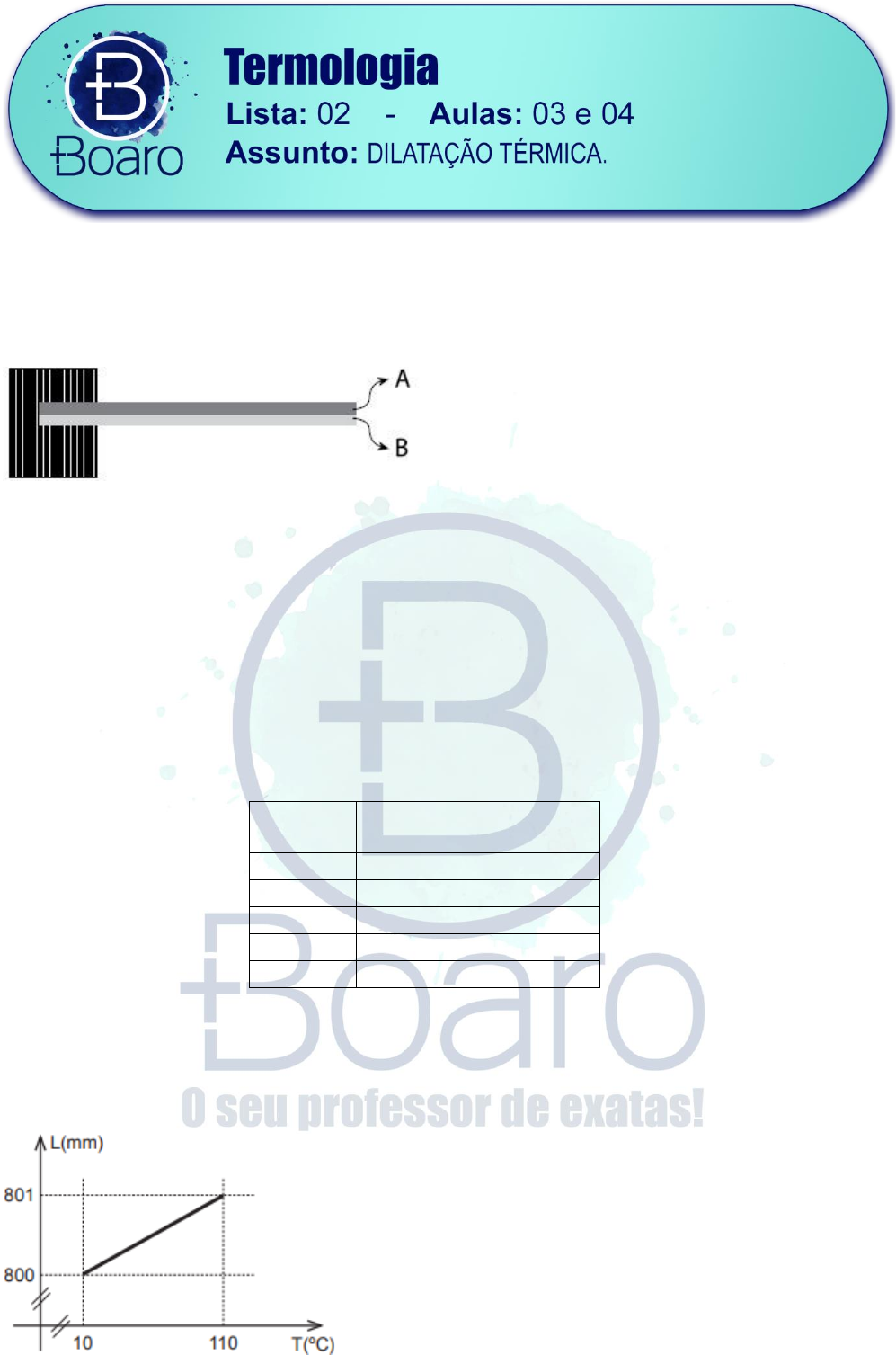 EXC030.(Fatec) Numa aula de laboratório do curso de Soldagem da FATEC, um dos exercícios era construir um dispositivo eletromecânico utilizando duas lâminas retilíneas de metais distintos, de mesmo comprimento e soldadas entre si, formando o que é chamado de “lâmina bimetálica”. Para isso, os alunos fixaram de maneira firme uma das extremidades enquanto deixaram a outra livre, conforme a figura. Considere que ambas as lâminas estão inicialmente sujeitas à mesma temperatura 0T , e que a relação entre os coeficientes de dilatação linear seja A B.α α Ao aumentar a temperatura da lâmina bimetálica, é correto afirmar que a) a lâmina A e a lâmina B continuam se dilatando de forma retilínea conjuntamente. b) a lâmina A se curva para baixo, enquanto a lâmina B se curva para cima. c) a lâmina A se curva para cima, enquanto a lâmina B se curva para baixo. d) tanto a lâmina A como a lâmina B se curvam para baixo. e) tanto a lâmina A como a lâmina B se curvam para cima. EXC031.(G1 - ifce) Em uma atividade de laboratório, um aluno do IFCE dispõe dos materiais listados na tabela a seguir. Se o professor pediu a ele que selecionasse, dentre as opções, aquele material que possibilita maior dilatação volumétrica para uma mesma variação de temperatura e um mesmo volume inicial, a escolha correta seria Material Coeficiente de dilatação linear ( )α em 1C− Aço 51,1 10− Alumínio 52,4 10− Chumbo 52,9 10− Cobre 51,7 10− Zinco 52,6 10− a) alumínio. b) chumbo. c) aço. d) cobre. e) zinco. EXC032.(Pucrs) Num laboratório, um grupo de alunos registrou o comprimento L de uma barra metálica, à medida que sua temperatura T aumentava, obtendo o gráfico abaixo: Pela análise do gráfico, o valor do coeficiente de dilatação do metal é a) 5 11,05 10 C− − b) 5 11,14 10 C− − c) 5 11,18 10 C− − d) 5 11,22 10 C− − e) 5 11,25 10 C− − EXC033.(Fuvest) Uma lâmina bimetálica de bronze e ferro, na temperatura ambiente, é fixada por uma de suas extremidades, como visto na figura abaixo. Nessa situação, a lâmina está plana e horizontal. A seguir, ela é aquecida por uma chama de gás. Após algum tempo de aquecimento, a forma assumida pela lâmina será mais adequadamente representada pela figura: Note e adote: O coeficiente de dilatação térmica linear do ferro é 5 11,2 10 C .− − O coeficiente de dilatação térmica linear do bronze é 5 11,8 10 C .− − Após o aquecimento, a temperatura da lâmina é uniforme. a) b) c) d) e) EXC034.(Upe-ssa 2) Por que os lagos congelam só na superfície? Porque a camada de gelo funciona como uma espécie de cobertor, impedindo que a água mais profunda congele. "A capa gelada faz o papel de isolante térmico. Como o gelo é um mau condutor, ele evita que o resto da água perca calor para a atmosfera", afirma o glaciologista Jefferson Cardia Simões, da Universidade Federal do Rio Grande do Sul (UFRGS). Disponível em: http://mundoestranho.abril.com.br/materia/por-que-os-lagos-congelam-so-na-superficie, acessado em: O comportamento diferenciado da densidade da água em baixas temperaturas, quando comparada com outras substâncias, permite que o fundo dos lagos não congele, preservando a vida nesses ecossistemas, nos períodos de inverno. Sobre isso, o gráfico que melhor descreve a variação da densidade da água, d, com a temperatura, T, está indicado na alternativa EXC035.(Ufrj) Um incêndio ocorreu no lado direito de um dos andares intermediários de um edifício construído com estrutura metálica, como ilustra a figura 1. Em consequência do incêndio, que ficou restrito ao lado direito, o edifício sofreu uma deformação, como ilustra a figura 2. Com base em conhecimentos de termologia, explique por que o edifício entorta para a esquerda e não para a direita. EXC036.(Enem PPL) O quadro oferece os coeficientes de dilatação linear de alguns metais e ligas metálicas: GREF. Física 2; calor e ondas. São Paulo: Edusp, 1993 Para permitir a ocorrência do fato observado na tirinha, a partir do menor aquecimento do conjunto, o parafuso e a porca devem ser feitos, respectivamente, de a) aço e níquel b) alumínio e chumbo. c) platina e chumbo. d) ouro e Iatão. e) cobre e bronze. EXC037.(Pucmg) Deseja-se passar uma esfera metálica através de um orifício localizado no centro de uma chapa metálica quadrada. O diâmetro da esfera é levemente maior que o diâmetro do furo. Para conseguir esse objetivo, o procedimento CORRETO é: a) aquecer igualmente a esfera e a chapa. b) resfriar apenas a chapa. c) resfriar igualmente a esfera e a chapa. d) aquecer a chapa. EXC038.(G1 - cps) Quem viaja de carro ou de ônibus pode ver, ao longo das estradas, torres de transmissão de energia tais como as da figura. Olhando mais atentamente, é possível notar que os cabos são colocados arqueados ou, como se diz popularmente, “fazendo barriga”. A razão dessa disposição é que a) a densidade dos cabos tende a diminuir com o passar dos anos. b) a condução da eletricidade em alta tensão é facilitada desse modo. c) o metal usado na fabricação dos cabos é impossível de ser esticado. d) os cabos, em dias mais frios, podem encolher sem derrubar as torres. e) os ventos fortes não são capazes de fazer os cabos, assim dispostos, balançarem. EXC039.(Uece) Seja um anel metálico construído com um fio muito fino. O material tem coeficiente de dilatação linear α e sofre uma variação de temperatura T. A razão entre o comprimento da circunferência após o aquecimento e o comprimento inicial é a) T.α b) 1 (1 T)α+ c) 1 T.α d) 1 T.α+ EXC040.(Ufrgs) Uma barra metálica de 1m de comprimento é submetida a um processo de aquecimento e sofre uma variação de temperatura. O gráfico abaixo representa a variação , em mm, no comprimento da barra, em função da variação de temperatura T, em C. Qual é o valor do coeficiente de dilatação térmica linear do material de que é feita a barra, 