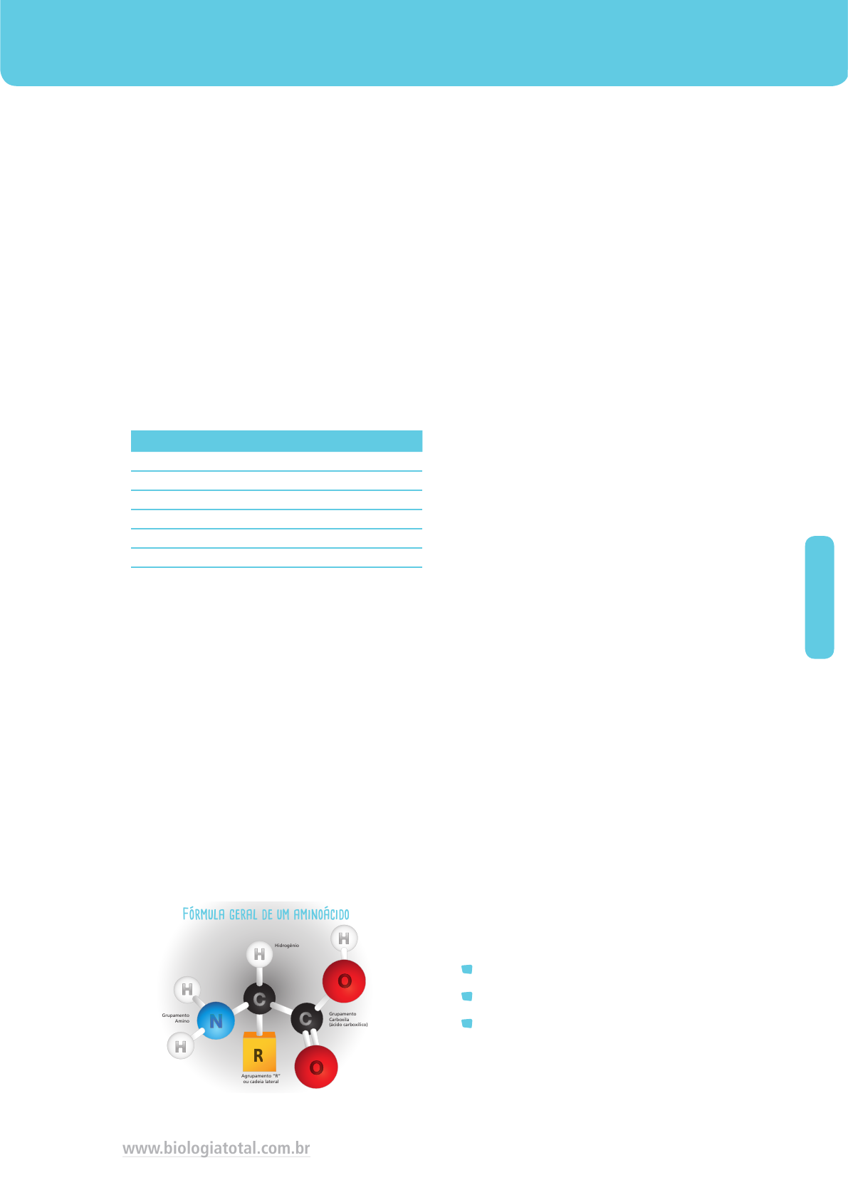 B IO Q U ÍM IC A 35www.biologiatotal.com.br R Grupamento Amino Hidrogênio Grupamento Carboxila (ácido carboxílico) Agrupamento “R” ou cadeia lateral Fórmula geral de um aminoácido PROTEÍNAS CLASSE EXEMPLO Enzimas tripsina, maltase Transporte hemoglobina, mioglobina Contrácteis actina, miosina Protetoras anticorpos, fibrinogênio Hormônios insulina, prolactina Estruturais colágeno, elastina As proteínas são macromoléculas, isto é, moléculas grandes, constituídas por unidades chamadas aminoácidos. Algumas propriedades importantes dos seres vivos estão associadas a elas: a facilitação para a ocorrência de reações químicas (enzimas), o transporte de oxigênio (hemoglobina), a transmissão de informações (hormônios), a composição estrutural das células (membranas, túbulos, etc.), a defesa orgânica (anticorpos), etc. Classificação das proteínas quanto à função biológica O que distingue O que distingue uma proteína da outra é o número de aminoácidos, o tipo de aminoácidos e a sequência na qual eles estão ligados. Todos os aminoácidos possuem um átomo de carbono central, ao qual se ligam um grupo carboxila (COOH), que confere caráter ácido, um grupo amina (NH2), que tem caráter básico, um átomo de hidrogênio e um radical R, variável de um aminoácido para outro. O radical R pode ser um átomo de hidrogênio, um grupo ou grupos mais complexos, contendo carbono, hidrogênio, oxigênio, nitrogênio e enxofre. Os animais podem sintetizar aminoácidos a partir de açúcar, graças à transferência do grupo NH2 das proteínas da dieta. Podem, ainda, transformar alguns aminoácidos em outros. Todavia, existem alguns aminoácidos que não podem ser produzidos pelos animais, e precisam ser conseguidos na alimentação. São os aminoácidos essenciais. Aqueles que podem ser sintetizados nas células animais são chamados aminoácidos naturais. AS REAÇÕES DE SÍNTESE E HIDRÓLISE DAS PROTEÍNAS As proteínas, ou cadeias polipeptídicas são formadas pela união entre aminoácidos. As ligações entre os aminoácidos são denominadas ligações peptídicas e ocorrem entre o grupo carboxila de um aminoácido e o grupo amina de outro aminoácido. Para o organismo aproveitar as proteínas como fonte de aminoácidos, deve ocorrer ação enzimática na digestão das proteínas, que ocorre no estômago e no intestino, para quebrar as ligações peptídicas. Como cada ligação peptídica é formada entre dois aminoácidos, uma proteína com 100 (cem) aminoácidos apresentará 99 (noventa e nove) ligações peptídicas. AS ESTRUTURAS DAS PROTEÍNAS O número de aminoácidos é muito variável de uma proteína para outra, veja os exemplos abaixo: Insulina bovina - 51 aminoácidos Hemoglobina humana - 574 aminoácidos Desidrogenase glutâmica - 8.300 aminoácidos A sequência linear de aminoácidos de uma proteína define sua estrutura primária. 36 B IO Q U ÍM IC A O filamento de aminoácidos se enrola ao redor de um eixo, formando uma escada helicoidal chamada alfa-hélice. É uma estrutura estável, cujas voltas são mantidas por ligações de hidrogênio. Tal estrutura helicoidal é a estrutura secundária da proteína. As proteínas estabelecem outros tipos de ligações entre suas partes. Com isto, dobram sobre si mesmas, adquirindo uma configuração espacial tridimensional chamada estrutura terciária. Essa configuração pode ser filamentar como no colágeno, ou globular, como nas enzimas. Tanto o estabelecimento de ligações de hidrogênio como o de outros tipos de ligações dependem da sequência de aminoácidos que compõem a proteína. Uma alteração na sequência de aminoácidos (estrutura primária) implica em alterações nas estruturas secundária e terciária da proteína. Como a função de uma proteína se relaciona com sua forma espacial, também será alterada. Muitas proteínas são formadas pela associação de dois ou mais polipeptídios (cadeias de aminoácidos). A maneira como estas cadeias se associam constitui a estrutura quaternária dessas proteínas. Estruturas das proteínas, começando pela primária (cadeia de aminoácidos), secundária (dobramentos devidos às ligações), terciária (enovelamento) e quaternária (conjugação de mais de uma proteína). DESNATURAÇÃO DAS PROTEÍNAS Quando as proteínas são submetidas à elevação de temperatura, a variações de pH ou a certos solutos como a ureia, sofrem alterações na sua configuração espacial, e sua atividade biológica é perdida. Este processo se chama desnaturação. Ao romper as ligações originais, a proteína sofre novas dobras ao acaso. Geralmente, as proteínas se tornam insolúveis quando se desnaturam. Na desnaturação, a sequência de aminoácidos não se altera e nenhuma ligação peptídica é rompida. Isto demonstra que a atividade biológica de uma proteína não depende apenas da sua estrutura primária, embora esta seja o determinante da sua configuração espacial. Algumas proteínas desnaturadas, ao serem devolvidas ao seu meio original, podem recobrar sua configuração espacial natural. Todavia, na maioria dos casos, nos processos de desnaturação por altas temperaturas ou por variações extremas de pH, as modificações são irreversíveis. Como é o caso da clara do ovo que se solidifica e se torna branca, ao ser cozida, mas não se liquefaz nem volta a ser transparente, quando esfria. B IO Q U ÍM IC A 37www.biologiatotal.com.br A importância das proteínas no organismo humano. AS FUNÇÕES DAS PROTEÍNAS As proteínas desempenham quatro funções importantes para os seres vivos: As proteínas estruturais estão presentes em estruturas esqueléticas, como ossos, tendões e cartilagens, unhas, cascos, etc., além da membrana celular. As proteínas hormonais atuam no metabolismo como mensageiros químicos, como a insulina e o glucagon que controlam a glicemia do sangue e o hormônio de crescimento denominado somatotrofina, secreta