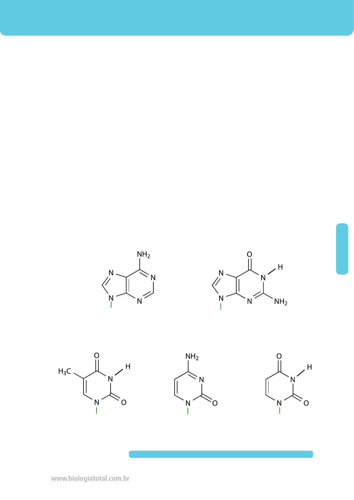 B IO Q U ÍM IC A 49www.biologiatotal.com.br ÁCIDOS NUCLEICOS São moléculas formadas por unidades complexas chamadas nucleotídeos. Cada nucleotídeo é um grupamento molecular formado por três subunidades: uma base nitrogenada, uma pentose e um grupamento fosfato. Nos seres vivos há dois tipos de ácidos nucleicos: o ácido desoxirribonucleico (DNA) e o ácido ribonucleico (RNA). O DNA dirige a síntese de proteínas, controla as atividades metabólicas e a arquitetura das células e dos seres vivos como um todo. O RNA recebe as informações contidas nas moléculas de DNA e as transfere para os ribossomos, onde as enzimas e outras proteínas são produzidas. Em ambos os ácidos nucleicos, as ligações entre os nucleotídeos sempre acontecem da mesma 7 8 9 5 6 1 2 3 4 5 4 3 2 1 6 5 4 3 2 1 6 5 4 3 2 1 6 7 8 9 5 6 2 3 4 Citosina aTimina GuaninaAdenina R R RRR Purinas Pirimidinas maneira. O grupo fosfato de um nucleotídeo se liga à pentose de um outro nucleotídeo, com a saída de uma molécula de água. O grupo fosfato desse outro nucleotídeo pode se ligar à pentose de um terceiro nucleotídeo e assim sucessivamente. Os nucleotídeos vão se enfileirando e formando longos filamentos chamados polinucleotídeos. As bases nitrogenadas que integram os nucleotídeos são classificadas em dois grupos: purinas ou púricas (adenina e guanina) e pirimidinas ou pirimídicas (citosina, timina e uracila). Os açúcares que entram na formação dos ácidos nucleicos são pentoses (monossacarídeos com cinco carbonos): ribose (RNA) e desoxirribose (DNA). O grupamento fosfato origina-se do ácido fosfórico, e é o mesmo para os dois ácidos. Os nucleotídeos são os blocos formadores das moléculas de ácidos nucleicos. Uracilo 50 B IO Q U ÍM IC A ÁCIDO DESOXIRRIBONUCLEICO (DNA) O DNA é o material genético das células. É grande e complexo e contém uma enorme quantidade informações. Pode se duplicar, gerando cópias perfeitas de si mesmo. Comandando a síntese de proteínas, controla o metabolismo e a arquitetura da célula. Nas moléculas de DNA, o número de nucleotídeos com adenina é igual ao número de nucleotídeos com timina, e os nucleotídeos com guanina existem na mesma quantidade que os nucleotídeos com citosina. O modelo de Watson e Crick mostra molécula de DNA como uma escada retorcida (ou dupla hélice), formada por dois filamentos paralelos de DNA. As bases complementares se mantêm próximas graças ao emparelhamento por meio de ligações de hidrogênio, que se formam sempre da mesma maneira: adenina com timina (2 ligações) e citosina com guanina (3 ligações). A = T e C ≡ G O DNA tem capacidade de autoduplicação, o que permite a geração de cópias idênticas de si mesmo. Durante a sua autoduplicação, ou replicação, os dois filamentos de DNA se separam. A enzima DNA polimerase usa cada filamento como molde para a montagem de um filamento novo. Quando o processo se completa, à frente de cada filamento antigo surge um filamento novo. A replicação do DNA é semiconservativa, ou seja, toda vez que uma molécula se duplica, metade da fita dupla é proveniente da molécula original e a outra metade é nova, assim como vemos na imagem. Em cada molécula nova de DNA, apenas um filamento é realmente recém-formado, enquanto o outro filamento foi preservado da molécula inicial. Por isso, dizemos que a replicação do DNA é semiconservativa. Piadinha biológica para os Jubialunos e Jubialunas! Durante a duplicação do DNA, fundamental para a divisão celular (Mitose e Meiose), a DNA polimerase - principal enzima envolvida - sitentiza as fitas de DNA no sentido 5’ - 3’, produzindo fitas complementares. B IO Q U ÍM IC A 51www.biologiatotal.com.br A DESCOBERTA DO DNA A descoberta do DNA ocorreu em 1869, pelo bioquímico alemão Johann Friedrich Miescher (1844 - 1895). Miescher buscava determinar os componentes químicos do núcleo celular e usava os glóbulos brancos contidos no pus para as pesquisas, eles são células que apresentam núcleos grandes e fáceis de serem isolados do citoplasma. Analisando os núcleos, Miescher descobriu a presença de um composto de natureza ácida que era desconhecido até o momento. Esse composto foi denominado, por Miescher, nucleína. Em 1880, um outro pesquisador alemão, Albrecht Kossel (1883 - 1927), demonstrou que a nucleína continha bases nitrogenadas em sua estrutura, explicando o fato da nucleína ser rica em nitrogênio. Nove anos depois, Richard Altmann (1852 - 1900), que era aluno de Miescher, obteve a nucleína com alto grau de pureza, comprovando sua natureza ácida e dando-lhe, então, o nome de ácido nucleico. A partir daí, o material mais utilizado para estudo e obtenção do ácido nucleico passou a ser o timo de bezerro, cujo tecido apresenta células com núcleos grandes. Foi descoberto que a degradação do ácido nucléico do timo, chamado de ácido timonucleico, liberava quatro tipos de bases nitrogenadas: - dois tipos de bases - purinas: adenina e guanina - dois tipos de bases pirimidinas: citosina e timina Em 1912, Phoebus Levine (1869 - 1940) e Walter Jacobs (1883 - 1967) concluíram que o componente básico dos ácidos nucleicos era uma estrutura composta por uma unidade que se constituía numa base nitrogenada ligada a uma pentose, que por sua vez, ligada a um fosfato. Esta unidade foi denominada de nucleotídeo. Um ácido nucleico seria então uma molécula composta por vários nucleotídeos unidos entre si, ou seja, um polinucleotídeo. Os estudos dos ácidos nucleicos continuaram por muitos anos sem que os cientistas soubessem de sua importância como material hereditário, descoberta que só foi realizada muitos anos depois. Francis Crick e James Watson foram os primeiros a resolver o problema e propor um modelo tridimensional do DNA, uma “estrutura com duas cadeias helicoidais que se enrolam em torno do mesmo eixo”, escreveram, imaginando, ao mesmo tempo, “um possível mecanism