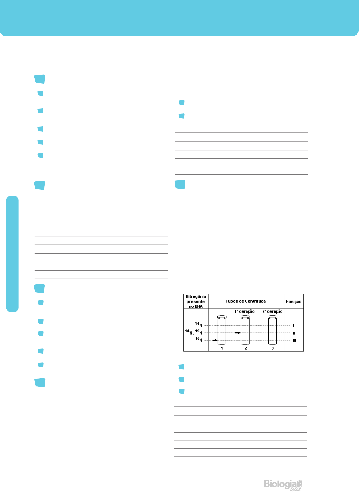 22 EX ER CÍ CI O S A PR O FU N D A D O S ÁCIDOS NUCLEICOS 01 02 04 08 16 (UEM 2015) Sobre os ácidos nucleicos, assinale o que for correto. As cadeias de RNA mensageiros são formadas por enzimas que complementam a sequência de bases de um segmento da cadeia do DNA. Uma cadeia polipeptídica é sintetizada por um ribossomo que se desloca sobre o RNA. mensageiro desde um códon AUG até um códon de parada. A duplicação do DNA é considerada conservativa uma vez que cada molécula filha é formada pelos filamentos antigos. Todas as fases do processo de síntese proteica ocorrem no interior do nucleoplasma. As ligações existentes entre os nucleotídeos para formação dos polinucleotídeos ocorrem entre a amina de uma unidade e a carboxila de outra. (UERJ 2015) Considere uma molécula de DNA sem qualquer mutação e que apresente 16% de bases nitrogenadas de citosina. Determine os percentuais de guanina e de timina encontrados nessa molécula, justificando suas respostas. (UFRRJ 2006) RADICAIS LIVRES - UM ASSUNTO DA MODA Há muito tempo que a Medicina já reconhece os radicais livres como verdadeiros vilões do nosso organismo. Eles são átomos ou moléculas livres dotados de cargas elétricas, resultantes, muitas vezes, das próprias reações intracelulares, ou provenientes do meio externo, que se mostram prejudiciais à saúde. São consequências do estresse, dos desvios alimentares, do fumo, das atividades físicas exageradas e da poluição ambiental. Atualmente, (UEPG 2012) Com relação às biomoléculas de DNA e RNA, assinale o que for correto. O RNA mensageiro carreia a informação do gene, na forma de RNA mensageiro, para os ribossomos, onde a informação é traduzida em proteína. O DNA tem funções de hereditariedade e armazenamento das informações genéticas. O DNA é constituído por duas fitas de nucleotídeos e as ligações do tipo pontes de hidrogênio mantêm as duas fitas de DNA unidas. O DNA é uma fita simples e possui adenina, citosina, guanina e uracila. O RNA transportador ou de transferência auxilia no transporte dos hormônios durante a secreção. 64 65 67 66 01 02 04 08 16 estão sendo muito comentados, tendo em vista os avanços da Medicina Ortomolecular. A partir do exposto, responda: De que maneira os radicais livres agem no organismo humano? Cite um exemplo de local e forma de ação dos radicais livres no organismo do homem. a b Com relação aos dados apresentados, responda: Após a segunda geração em meio com 14N, o DNA extraído das bactérias irá ocupar qual(is) posição(ções) no Tubo 3? Qual conclusão pode ser tirada a partir da realização deste experimento? Qual é a principal enzima envolvida no processo descrito? (UFU 2006) Em 1958, Meselson e Stahl cultivaram bactérias ‘Escherichia coli’ por 14 gerações em meio de cultura, onde a única fonte de nitrogênio era o 15N (isótopo pesado). No desenho a seguir, a seta do Tubo 1 indica a posição (Ill) ocupada pelo DNA com 15N após ultracentrifugação em meio de cloreto de césio. Uma amostra de bactérias contendo DNA com 15N foi transferida para meio de cultura onde a única fonte de nitrogênio era o14N (isótopo normal). Após cada geração, foram retiradas amostras de DNA e verificada(s) a(s) posição(ões) ocupada(s) por estas amostras em meio de cloreto de césio. A seta do Tubo 2 indica a posição (II) ocupada pelo DNA, após a primeira geração em meio com 14N. 68 a b c EX ER CÍ CI O S A PR O FU N D A D O S 23www.biologiatotal.com.br (UFRN 2005) O teste de paternidade usando o DNA tornou-se muito frequente hoje. No entanto, as pessoas têm muitas dúvidas a respeito desse tipo de exame. As frases a seguir constam numa lista de “mitos e verdades sobre o teste de DNA” encontrada na internet (http://www.gene.com.br). I. “O exame de DNA só pode ser feito com sangue.” II. “Sou primo da mãe e estou com medo do resultado ser positivo, mesmo que eu não seja o verdadeiro pai.” III. “Ele já morreu e não deixou nenhum outro parente vivo. Nunca poderei provar que ele era o pai do meu filho.” Justifique por que cada uma das frases constitui um “mito”. (UNESP 2004) Os biólogos moleculares decifraram o código genético no começo dos anos 60 do século XX. No modelo proposto, códons constituídos por três bases nitrogenadas no RNA, cada base representada por uma letra, codificam os vinte aminoácidos. Considerando as quatro bases nitrogenadas presentes no RNA (A, U, C e G), responda. Por que foram propostos no modelo códons de três letras, ao invés de códons de duas letras? Um dado aminoácido pode ser codificado por mais de um códon? Um único códon pode especificar mais de um aminoácido? (UFSC 2004) Neste ano de 2003, são comemorados os 50 anos da “descoberta” da estrutura tridimensional do DNA. Com relação às características dessa molécula, ao papel que ela desempenha nos seres vivos e aos processos em que se encontra envolvida é CORRETO afirmar que: É formada por duas fileiras de nucleotídeos torcidas juntas em forma de hélice. Em sua composição é possível encontrar quatro bases nitrogenadas diferentes: a adenina, a citosina, o aminoácido e a proteína. Ela tem a capacidade de se autoduplicar. Nela está contida a informação genética necessária para a formação de um organismo. A mensagem nela contida pode ser transcrita para uma outra molécula denominada RNA. Nos organismos procariontes, ela fica estocada dentro do núcleo das células. Em alguns organismos primitivos, ela apresenta apenas uma fileira de nucleotídeos. (UEM 2004) Sobre a atividade e a expressão dos genes, assinale o que for correto. Durante a transcrição de um gene normal e funcional, as fitas opostas servem de molde para a síntese de RNA mensageiros com sequências diferentes, mas complementares. O código genético é degenerado porque o mesmo códon especifica aminoácidos diferentes em organismos procariotos e eucariotos. Tanto em 