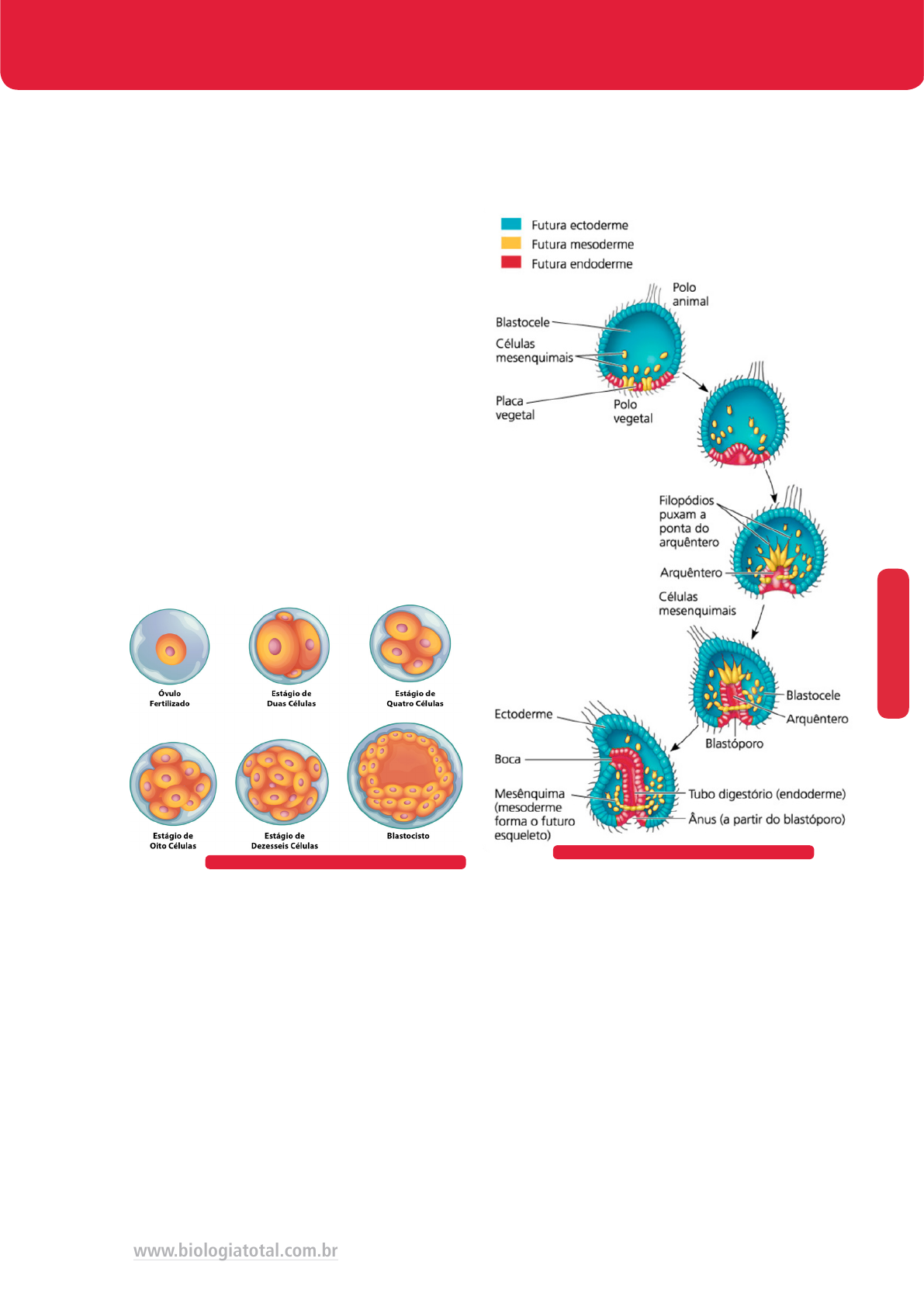 EM B R IO LO G IA 15www.biologiatotal.com.br DESENVOLVIMENTO EMBRIONÁRIO Após a fecundação, o zigoto começa a fazer mitoses, que resultam em células denominadas blastômeros. À medida que as mitoses se sucedem os blastômeros vão se tornando cada vez menores de modo que o tamanho total do embrião com 32 ou mais células é praticamente o mesmo do ovo inicial. O embrião agora é denominado gástrula e se caracteriza por apresentar uma cavidade chamada arquêntero que se comunica com o meio externo através de uma abertura – o blastóporo. Este, no correr do desenvolvimento embrionário originará o ânus (deuterostômios) ou a boca (protostômios) do embrião. Diferentes estágios da divisão celular após fecundação Formação da gástrula em embrião de ouriço-do-mar Após sucessivas divisões, o aspecto do embrião é de um maciço celular semelhante a uma amora, daí receber o nome de mórula. As células da mórula dispõem-se de uma tal maneira que acabam circundando uma cavidade cheia de líquido. Essa fase chama-se blástula e a cavidade que apresenta recebe o nome de blastocele. Em seguida, as células sofrem um rearranjo, diferenciando-se em duas camadas celulares: a ectoderme (externa) e a endoderme (interna). Esse processo chama-se gastrulação. O aparecimento do terceiro folheto embrionário na gástrula (mesoderme) determina a formação de uma cavidade embrionária – o celoma. Quando a gástrula não forma a mesoderme, o animal é dito diblástico e não apresenta celoma (acelomado). Alguns animais podem apresentar um esboço de celoma (pseudocelomados) mas, somente aqueles nos quais a mesoderme reveste o celoma podemos denominar celomados verdadeiros. O aparecimento da mesoderme também determina a denominação de triblásticos para esses embriões. 16 EM B R IO LO G IA A gástrula é caracterizada pela formação do esboço do sistema digestivo do animal. Na fase seguinte, a nêurula começa a se delinear no sistema nervoso. A partir da gástrula ocorrem evaginações e invaginações que levam à formação da nêurula. Blastocele Macrômeros Micrômeros Blástula: a blástula é uma estrutura dotada de cavidade e não apresenta orifício comunicando o interior com o meio externo. Desenvolvimento fetal humano Esquema mostrando o processo de neurulação Quando o embrião entra neste último estágio, inicia-se a organogênese, ou seja, a formação dos órgãos e sistemas. Os três folhetos embrionários formarão os tecidos e os órgãos. ECTODERME MESODERME ENDODERME Epiderme e fâneros (pelos, unhas, chifres, penas) Glândulas sudoríparas, sebáceas, mamárias, lacrimais e hipófise Sistema nervoso Cristalino e córnea do olho O revestimento do nariz, boca e ânus Esmalte dos dentes Músculos Tecidos conjuntivos Sistema circulatório e sangue Sistema urinário e reprodutor Pericárdio, pleura e peritônio Marfim dos dentes Esqueleto Revestimento do tubo digestório (exceto boca e ânus) Revestimento do sistema respiratório Fígado, pâncreas, timo, tireoide e paratireoides O revestimento da uretra, da bexiga urinária e das glândulas e tubos dos órgãos reprodutivos 4 semanas 10 semanas 16 semanas 20 semanas A imagem abaixo mostra um bebê humano em diferentes fases do desenvolvimento. Até o terceiro mês de gestação ele é chamado de embrião. A partir de então, até o nascimento, é chamado de feto. EM B R IO LO G IA 17www.biologiatotal.com.br Ovo Amniota e suas membranas extraembrionárias Detalhe da placenta humana ANEXOS EMBRIONÁRIOS São estruturas que surgem durante o desenvolvimento embrionário dos vertebrados e que têm por finalidade auxiliar o desenvolvimento. Há quatro anexos embrionários fundamentais: 1) SACO VITELÍNICO: envolve a gema, absorvendo os nutrientes da própria gema e da clara, estes nutrientes são transportados até o embrião pelos vasos sanguíneos. 2) ALANTOIDE: recebe e acumula os excretas nitrogenados gerados pelo embrião. 3) ÂMNIO: envolve o embrião, acumulando grande quantidade de liquido (a cavidade amniótica). Protege o embrião contra desidratação e abalos mecânicos. 4) CÓRION: envolve o embrião e todos os demais anexos; acaba por encostar na membrana da casca. O cório é um elemento de proteção. Nos mamíferos existe outro anexo embrionário, a placenta, que é por onde são feitas trocas gasosas, alimentação e excreção do embrião em desenvolvimento. ANIMAL ANEXO EMBRIONÁRIO Répteis Saco vitelínico Alantoide Âmnio Córion Aves Saco vitelínico Alantoide Âmnio Córion Mamíferos Saco vitelínico Alantoide Âmnio Córion Placenta e Cordão Umbilical 18 EM B R IO LO G IA Cientistas criam primeiro embrião artificial de rato usando células-tronco Em um estudo publicado na revista científica Science, pesquisadores da Universidade de Cambridge relataram que conseguiram criar, pela primeira vez, embriões artificiais de ratos. Para formar um embrião naturalmente, o óvulo (gameta feminino) precisa ser fecundado por um espermatozoide (gameta masculino). A estrutura formada após a fertilização, o zigoto, passa por diversas etapas de desenvolvimento. Os cientistas da Universidade de Cambridge, entretanto, não utilizaram gametas, mas sim células-tronco – que são aquelas células capazes de se diferenciar em outros tipos celulares – e uma plataforma 3D.Eles usaram dois tipos de células-tronco: células- tronco embrionárias e do trofoblasto (a camada externa do blastocisto). Elas foram misturadas e colocadas numa cultura de um gel semissólido que permitiu que a estrutura crescesse em três dimensões. Conforme as células foram se multiplicando, as células do trofoblasto – que dão origem à placenta – e as embrionárias – que dão origem ao embrião – foram agrupadas em duas seções. Então, as células começaram a se diferenciar e uma porção das células embrionárias formou a mesoderme, folheto embrionário que dá origem aos ossos, músculos e coração. As 