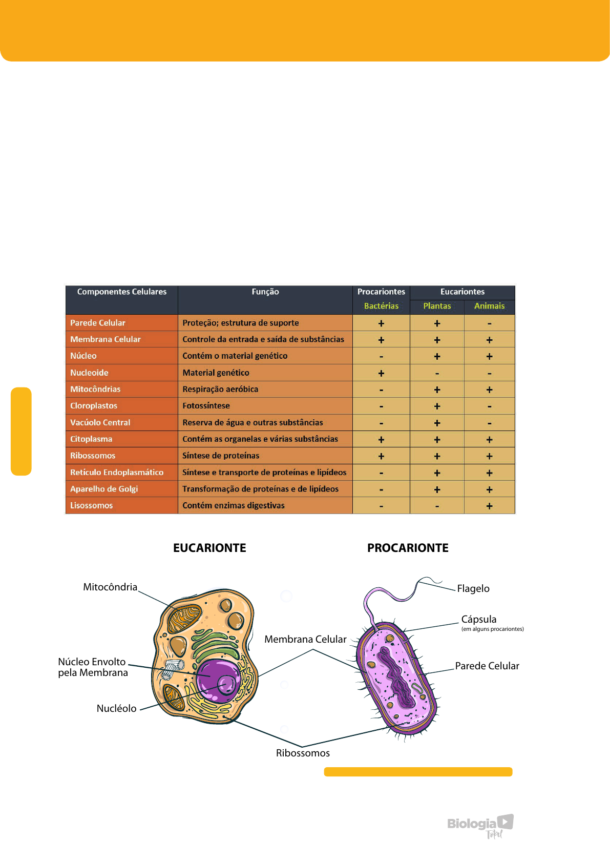 38 CI TO LO G IA Diferenças entre uma célula eucariótica e procariótica PROCARIONTE X EUCARIONTE Esta divisão é feita quanto a organização da célula. As células procarióticas apresentam organização mais simples, sem núcleo organizado e sem organelas membranosas, como retículo endoplasmático, complexo de Golgi, etc. Possuem células procarióticas os organismos do reino Monera (bactérias e cianobactérias) Flagelo Nucléolo Núcleo Envolto pela Membrana Mitocôndria EUCARIONTE PROCARIONTE Ribossomos Parede Celular Membrana Celular Cápsula (em alguns procariontes) A célula eucariótica apresenta inúmeros compartimentos e estruturas membranosas internas. Além disso, também possuem um núcleo, no qual se localiza o material genético. Protozoários, algas, fungos, plantas e animais possuem células eucarióticas. CI TO LO G IA 39www.biologiatotal.com.br CÉLULA ANIMAL X CÉLULA ANIMAL Na célula animal eucariótica existem três componentes básicos: membrana, citoplasma e núcleo. A existência de um núcleo bem diferenciado é a principal característica da célula eucariótica. A célula vegetal apresenta membrana plasmática e uma parede celular que confere proteção e sustentação mecânica. A parede celular não existe em células animais. VEGETAL ANIMAL Centríolo Ausentes Presentes Peroxissomos Presentes Presentes Aparelho de Golgi Vesículas Isoladas Vesículas Empilhadas Cloroplastos Presentes Ausentes Vácuolos Maiores Menores Plasmodesmos Presentes Ausentes Parede Celular Presentes Ausentes Reserva Amido Glicogênio Diferenças entre células animais e vegetais TEORIA ENDOSSIMBIÓTICA A teoria endossimbiótica foi proposta por Lynn Margulis, em 1981, e admite que algumas organelas (mitocôndrias e cloroplastos) existentes nas células eucarióticas surgiram graças a uma associação simbiótica. Acredita- se que mitocôndrias e cloroplastos são descendentes de organismos procariontes autotróficos que foram capturados e adotados por alguma célula, vivendo, assim, em simbiose. A partir dessa teoria, podemos considerar que os ancestrais das mitocôndrias e cloroplastos eram organismos endossimbiontes, ou seja, organismos que vivem dentro de outro organismo. Possivelmente, a célula hospedeira era uma espécie de fagócito heterotrófico capaz de englobar partículas. Após englobar a célula procariótica autotrófica, ela permaneceu mantida no citoplasma da célula hospedeira sem que houvesse degradação. Os dois organismos, então, começaram a viver em simbiose e, posteriormente, ficaram incapacitados de viver isoladamente. O que apoia esta teoria? Cloroplastos e mitocôndrias assemelham- se a bactérias em tamanho e forma, além da semelhança genética e bioquímica, o que sugere que possam ter ancestrais procarióticos; Cloroplastos e mitocôndrias possuem DNA e ribossomos próprios; DNA de cloroplastos e mitocôndrias são bastante diferentes daquele existente no núcleo da célula; As duas organelas possuem o seu próprio sistema de membranas internas e a presença de duas membranas revestindo-as; Tanto cloroplastos quanto mitocôndrias possuem capacidade de autoduplicação. 40 CI TO LO G IA Etapas da endossimbiose, os passos para o surgimento dos cloroplastos e mitocôndrias. LEITURA COMPLEMENTAR COMO É A RESPIRAÇÃO CELULAR NAS BACTÉRIAS? Todos os organismos necessitam de energia em suas células para manter a ordem biológica que os mantêm vivos. Para isso, as células são capazes de obter energia através de uma ampla variedade de maneiras, incluindo a respiração celular.Basicamente, a respiração celular consiste na quebra de moléculas orgânicas para a produção de energia na forma de ATP e ela pode ocorrer na presença de oxigênio – respiração aeróbia – ou na ausência – respiração anaeróbia. A respiração aeróbia é a rota de produção de energia mais eficiente e ocorre na maioria das células eucarióticas e em alguns organismos procarióticos – e é sobre estes últimos que iremos falar.Muitas pessoas pensam que procariontes (grupo que inclui as bactérias) podem realizar apenas respiração anaeróbia, como a fermentação, mas na verdade eles também podem realizar respiração celular. Nas plantas, animais, por exemplo, parte da respiração celular ocorre no citosol e parte nas mitocôndrias. No entanto, as células procariontes não possuem organelas – lembre-se que as mitocôndrias provavelmente evoluíram de bactérias que foram fagocitadas por células eucarióticas ancestrais há bilhões de anos. Então, o processo de respiração celular difere nestas células com relação aos locais em que ocorrem cada uma das etapas. A primeira fase da respiração celular – chamada de glicólise – ocorre no citoplasma da célula tanto em células eucariontes como procariontes. Esta é a fase em que ocorre a quebra da glicose em piruvato e ela é o ponto de partida tanto da respiração celular como da fermentação.A etapa seguinte, denominada oxidação do piruvato, ocorre na membrana interna da mitocôndria em eucariontes e na face interna da membrana plasmática em procariontes. Nesta etapa, o piruvato é convertido a Acetil-CoA, que é utilizado na etapa seguinte, o ciclo de Krebs.No ciclo de Krebs – que ocorre na matriz mitocondrial em eucariontes e no citoplasma em procariontes – a quebra das moléculas de glicose é completada, resultando na formação de gás carbônico, entre outras moléculas.Por fim, a cadeia respiratória (ou cadeia transportadora de elétrons) – etapa em que ocorre a produção de ATP a partir da energia derivada de reações de redução e oxidação de uma cadeia transportadora de elétrons – acontece na membrana interna da mitocôndria em eucariontes e na face interna da membrana plasmática em procariontes. Locais onde ocorrem as etapas da respiração celular em eucariontes e procariontes. EX ER CÍ CI O S 41www.biologiatotal.com.br A alternativa contendo a asso