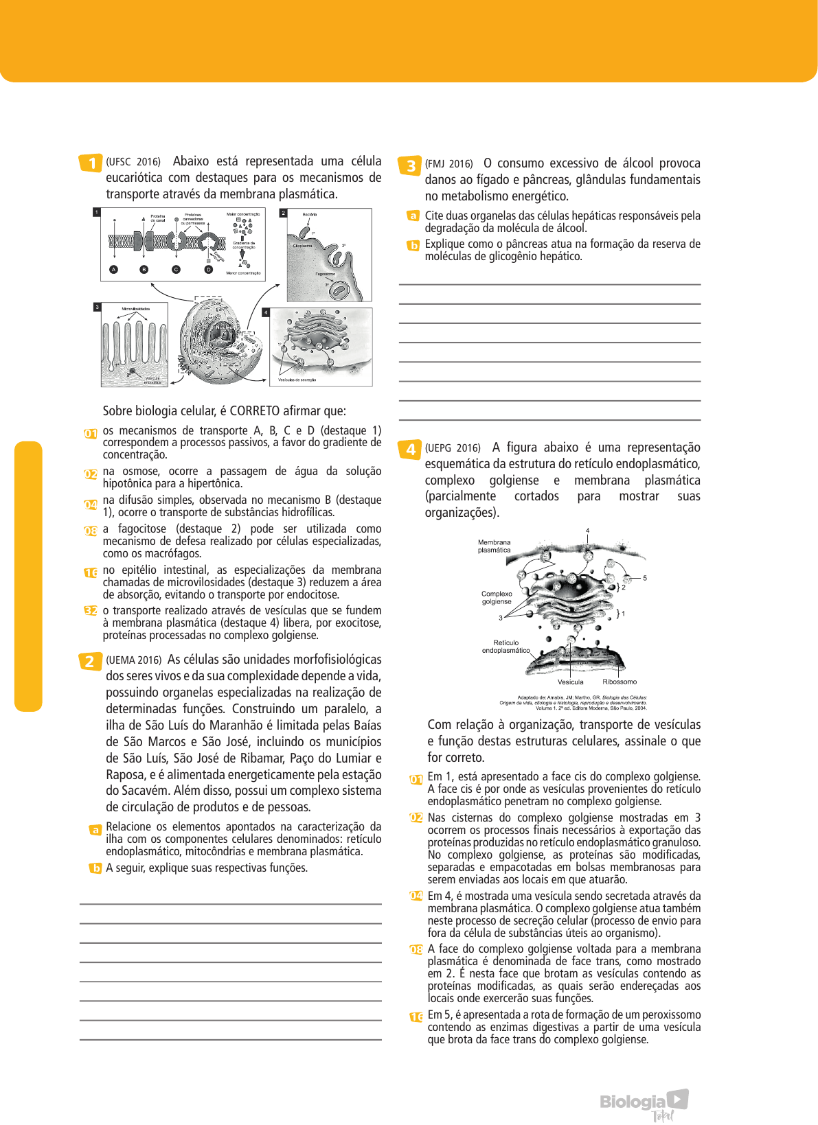 6 EX ER CÍ CI O S A PR O FU N D A D O S 81www.biologiatotal.com.br 01 01 a 02 02 b 04 04 a 08 08 b 16 16 32 (UFSC 2016) Abaixo está representada uma célula eucariótica com destaques para os mecanismos de transporte através da membrana plasmática. (UEMA 2016) As células são unidades morfofisiológicas dos seres vivos e da sua complexidade depende a vida, possuindo organelas especializadas na realização de determinadas funções. Construindo um paralelo, a ilha de São Luís do Maranhão é limitada pelas Baías de São Marcos e São José, incluindo os municípios de São Luís, São José de Ribamar, Paço do Lumiar e Raposa, e é alimentada energeticamente pela estação do Sacavém. Além disso, possui um complexo sistema de circulação de produtos e de pessoas. Relacione os elementos apontados na caracterização da ilha com os componentes celulares denominados: retículo endoplasmático, mitocôndrias e membrana plasmática. A seguir, explique suas respectivas funções. (FMJ 2016) O consumo excessivo de álcool provoca danos ao fígado e pâncreas, glândulas fundamentais no metabolismo energético. Cite duas organelas das células hepáticas responsáveis pela degradação da molécula de álcool. Explique como o pâncreas atua na formação da reserva de moléculas de glicogênio hepático. 1 2 3 Sobre biologia celular, é CORRETO afirmar que: os mecanismos de transporte A, B, C e D (destaque 1) correspondem a processos passivos, a favor do gradiente de concentração. na osmose, ocorre a passagem de água da solução hipotônica para a hipertônica. na difusão simples, observada no mecanismo B (destaque 1), ocorre o transporte de substâncias hidrofílicas. a fagocitose (destaque 2) pode ser utilizada como mecanismo de defesa realizado por células especializadas, como os macrófagos. no epitélio intestinal, as especializações da membrana chamadas de microvilosidades (destaque 3) reduzem a área de absorção, evitando o transporte por endocitose. o transporte realizado através de vesículas que se fundem à membrana plasmática (destaque 4) libera, por exocitose, proteínas processadas no complexo golgiense. (UEPG 2016) A figura abaixo é uma representação esquemática da estrutura do retículo endoplasmático, complexo golgiense e membrana plasmática (parcialmente cortados para mostrar suas organizações). 4 Com relação à organização, transporte de vesículas e função destas estruturas celulares, assinale o que for correto. Em 1, está apresentado a face cis do complexo golgiense. A face cis é por onde as vesículas provenientes do retículo endoplasmático penetram no complexo golgiense. Nas cisternas do complexo golgiense mostradas em 3 ocorrem os processos finais necessários à exportação das proteínas produzidas no retículo endoplasmático granuloso. No complexo golgiense, as proteínas são modificadas, separadas e empacotadas em bolsas membranosas para serem enviadas aos locais em que atuarão. Em 4, é mostrada uma vesícula sendo secretada através da membrana plasmática. O complexo golgiense atua também neste processo de secreção celular (processo de envio para fora da célula de substâncias úteis ao organismo). A face do complexo golgiense voltada para a membrana plasmática é denominada de face trans, como mostrado em 2. É nesta face que brotam as vesículas contendo as proteínas modificadas, as quais serão endereçadas aos locais onde exercerão suas funções. Em 5, é apresentada a rota de formação de um peroxissomo contendo as enzimas digestivas a partir de uma vesícula que brota da face trans do complexo golgiense. CITOPLASMA 7www.biologiatotal.com.br EX ER CÍ CI O S A PR O FU N D A D O S 82 (FUVEST 2015) Em certa doença humana, enzimas digestivas intracelulares (hidrolases) são transportadas do complexo golgiense para a membrana celular e secretadas, em vez de serem encaminhadas para as organelas em que atuam. Nos indivíduos clinicamente normais, em que organelas celulares essas enzimas digestivas atuam? 9 01 01 02 02 04 04 08 08 08 (UEPG 2016) Em relação às funções desempenhadas pelos lisossomos, assinale o que for correto. Lisossomos podem desempenhar função autofágica, digerindo partes desgastadas da própria célula; ou função heterofágica, digerindo material capturado por fagocitose ou pinocitose. Lisossomos são pequenas vesículas esféricas repletas de enzimas responsáveis pela digestão, além de participar de processos de respiração celular e fotossíntese. Em muitas células normais, a função autofágica ocorre por um processo de digestão de estruturas citoplasmáticas que não estão mais realizando suas funções, o que contribui para a renovação do material citoplasmático. Lisossomos armazenam substâncias que irão agir em outras partes do corpo, tais como as enzimas digestivas, produzidas e secretadas pelas células do pâncreas e que irão atuar no intestino. (UNICID - MEDICINA 2016) A figura representa o desenvolvimento dos sapos. (UFPR 2015) Embora a célula eucariota seja altamente compartimentalizada, os processos necessários para a vida estão integrados em redes. Por exemplo, apenas uma parte do ATP sintetizado numa organela conversora de energia é utilizada na própria organela, sendo o restante do ATP exportado da organela e utilizado por outros compartimentos celulares, como os especializados na biossíntese, processamento e distribuição de proteínas. (UEM 2015) Sobre as estruturas e organelas citoplasmáticas de uma célula eucariótica animal, é correto afirmar que o citoesqueleto, formado por microtúbulos, microfilamentos e filamentos intermediários, dá suporte e forma para as células, além de colaborar em vários movimentos. os centríolos colaboram na formação dos cílios e flagelos e na organização do fuso acromático. os ribossomos são responsáveis pela síntese de proteína, mecanismo determinado pelo RNA produzido no núcleo da célula, con