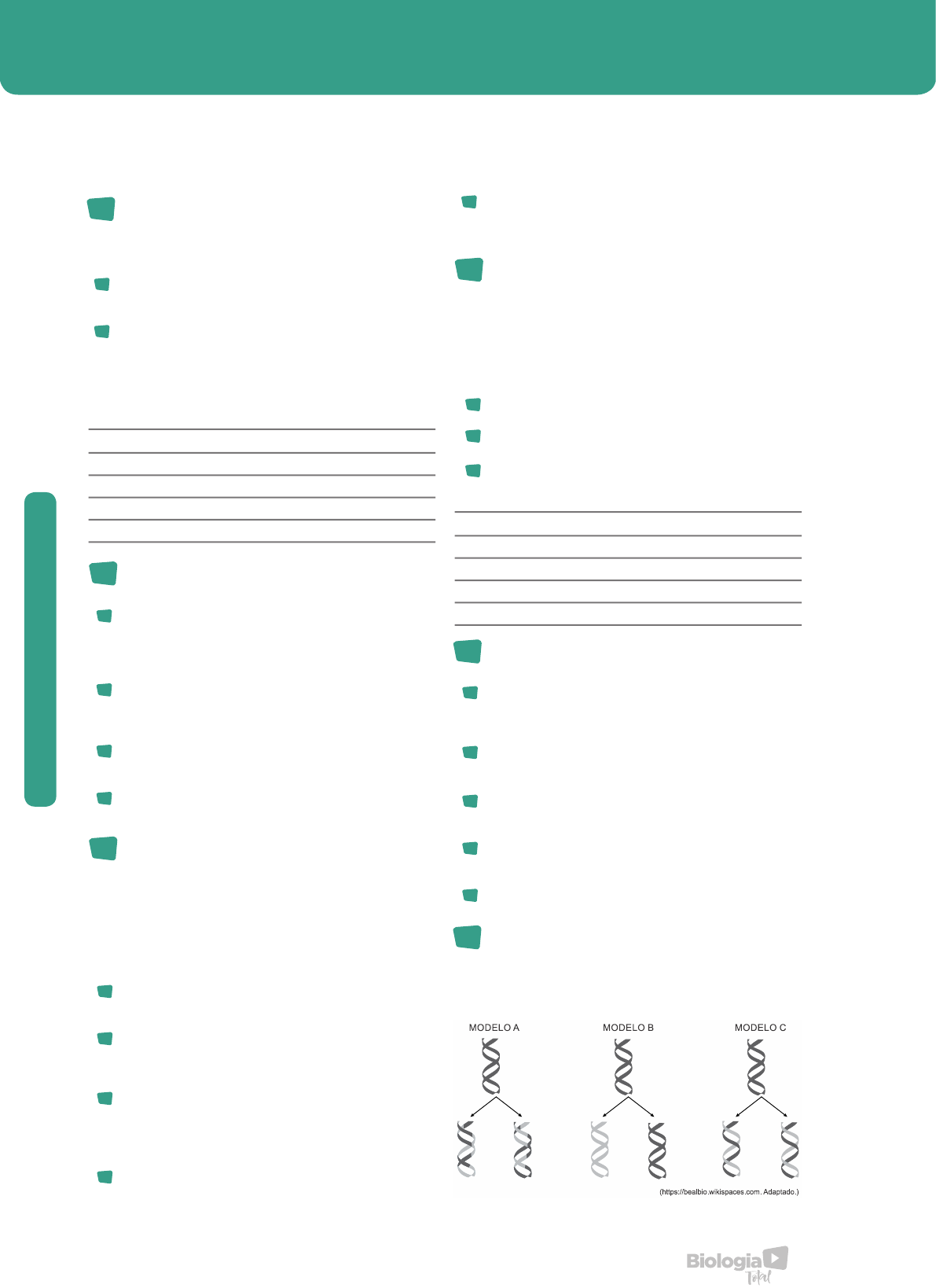 6 EX ER CÍ CI O S A PR O FU N D A D O S MITOSE a a 01 01 01 b b c 02 02 0204 04 0408 08 08 16 16 (FUVEST 2017) O sulfato de vincristina é uma substância usada para o tratamento de tumores. Esse quimioterápico penetra nas células e liga-se à tubulina, impedindo a formação de microtúbulos. Que processo celular, importante para o tratamento, é bloqueado, quando não se formam microtúbulos? Como os microtúbulos participam desse processo? Para o tratamento, o quimioterápico pode ser colocado dentro de lipossomos, vesículas limitadas por bicamada de constituição lipoproteica. Que estrutura celular tem composição semelhante à do lipossomo, o que permite que ambos interajam, facilitando a ação do quimioterápico na célula? (UEPG 2016) Sobre os processos envolvidos nas etapas de divisão celular, assinale o que for correto. Nos seres eucariotos e sexuados ocorrem dois tipos de divisão celular: mitose, que forma células com o mesmo número de cromossomos e com informações genéticas idênticas à célula-mãe; e meiose, que reduz o número de cromossomos à metade (haploide). A célula permanece em interfase na maior parte do tempo, período em que os cromossomos permanecem em um intenso grau de compactação e com baixa atividade das organelas. Na fase de prófase da meiose I, o crossing-over permite trocas de pedaços entre os cromossomos homólogos, fazendo surgir novas combinações genéticas. Na primeira etapa da meiose, os cromossomos homólogos se separam durante a anáfase I. (UEPG 2016) A divisão da célula faz parte do que os biólogos denominam ciclo celular. Este é um período que se inicia com a origem da célula, a partir de uma célula preexistente, e termina quando ela se divide em duas células-filhas. Com relação ao ciclo celular, assinale o que for correto. Os citologistas dividem o ciclo celular em duas etapas: divisão celular e interfase. A divisão celular compreende a mitose e a citocinese (divisão do citoplasma). A interfase é definida como o período entre duas divisões celulares consecutivas. Durante a interfase, os filamentos cromossômicos permanecem descondensados e distribuídos no interior do núcleo, constituindo a cromatina. Na interfase, a célula está em plena atividade, produzindo moléculas de RNA que são utilizadas na síntese proteica. É também durante a interfase que a célula cresce e que as moléculas de DNA dos cromossomos se duplicam, preparando a célula para a próxima divisão. As fases da mitose são, em sequência: prófase, metáfase, anáfase, telófase. (UEM-PAS 2016) Sobre a divisão celular nos eucariotos, assinale o que for correto. A meiose e a fecundação são fenômenos opostos, pois a meiose, sendo uma divisão reducional, produz gametas com metade do número de cromossomos, típico de uma espécie, enquanto a fecundação restitui a diploidia. A interfase é um período do ciclo celular que antecede a mitose e a meiose. Nela não ocorrem eventos importantes para a geração de novas células. Na meiose, os cromossomos homólogos separam-se durante a anáfase I e, durante a anáfase II, separam-se as cromátides. Ao final da mitose, a citocinese das células vegetais ocorre do centro para a periferia, recebendo o nome de citocinese centrífuga. Em células animais, o crossing-over ocorre na prófase, em cromossomos não homólogos da mitose ou da meiose. (UNICID - MEDICINA 2016) Após a descoberta da estrutura da molécula de DNA, surgiram três modelos para explicar como ocorre sua duplicação. A figura ilustra três possíveis modelos de duplicação da molécula de DNA. 14 15 16 18 19 (UFJF-PISM 1 2016) As divisões celulares, mitose e meiose, são processos importantes para a manutenção e perpetuação das espécies. Durante o ciclo celular, nos dois tipos de divisões celulares, o período em que a célula não está se dividindo (intérfase), é conhecido como período de “repouso” celular. Com base no seu conhecimento sobre o ciclo celular responda: Por que o termo “repouso” celular é inapropriado para a intérfase? Em qual período da intérfase observa-se uma maior quantidade de DNA? Quantas cromátides apresentam os cromossomos no período G2 da intérfase? 17 Na prófase ocorre o desaparecimento da carioteca. A lâmina nuclear se desfaz e as membranas componentes da carioteca fragmentam-se em pequenas vesículas, que se espalham pelo citoplasma. EX ER CÍ CI O S A PR O FU N D A D O S 7www.biologiatotal.com.br a 01 01 a b 02 02 b C 04 04 08 08 16 16 32 32 Dos modelos apresentados, qual deles representa a duplicação da molécula de DNA proposto por Watson e Crick? Justifique sua resposta. Em que fase do ciclo celular mitótico ocorre a duplicação da molécula de DNA? Por que a célula precisa realizar esse processo? (UFSC 2015) A figura abaixo representa a chegada e a proliferação de células tumorais no tecido hepático provenientes do tecido pulmonar. (IFSC 2015) Considerando a figura abaixo e sobre o ciclo celular, assinale a soma da(s) proposição(ões) CORRETA(S): (UFJF-PISM 1 2015) Sabemos que cada tipo de célula possui um período específico para a realização do ciclo celular e que há dois tipos de divisão celular: mitose e meiose. De acordo com as etapas abaixo, responda: Qual a principal diferença encontrada entre metáfase mitótica e a metáfase I da meiose? Na mitose, em quais fases ocorrem os seguintes fenômenos? (1) desaparecimento do núcleo, (2) divisão dos centrômeros e (3) migração das cromátides irmãs. (UFSC 2014) O gráfico indica, em escala logarítmica, a relação dos casos de câncer em diversos órgãos com a idade dos indivíduos. Com relação ao gráfico e ao desenvolvimento de câncer, indique a soma da(s) proposição(ões) CORRETA(S) 22 20 21 23 A origem das células cancerosas está associada a anomalias na regulação do ciclo celular e à perda de controle da mitose. A mitose é um processo de divisão celular característico