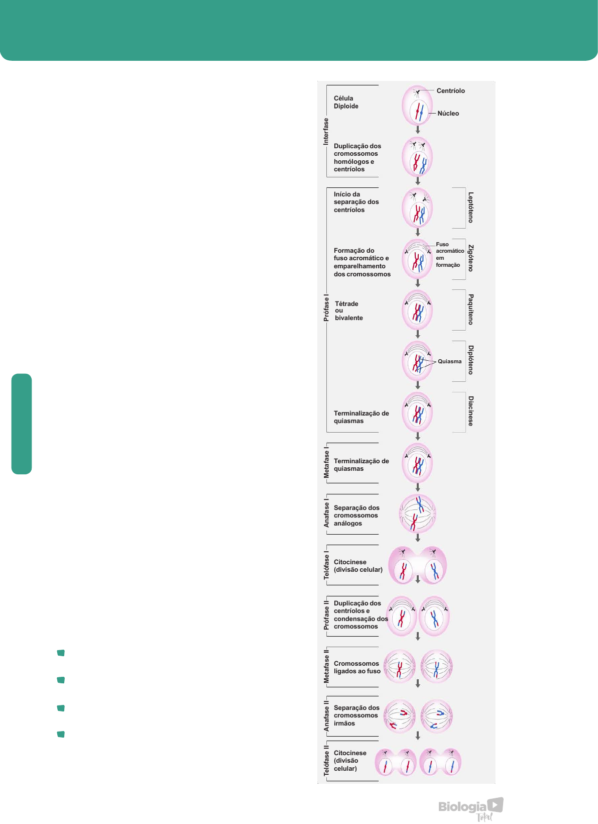 30 CI TO G EN ÉT IC A Esquema com todas as fases da mitose. Centríolo Célula Núcleo Duplicação dos cromossomos homólogos e centríolos Início da separação dos centríolos Formação do fuso acromático e emparelhamento dos cromossomos Fuso acromático em formação Tétrade ou bivalente Quiasma Terminalização de quiasmas Terminalização de quiasmas Separação dos cromossomos análogos Citocinese (divisão celular) Duplicação dos centríolos e condensação dos cromossomos Cromossomos ligados ao fuso Separação dos cromossomos irmãos Citocinese (divisão celular) Leptóteno Zigóteno Paquíteno Diplóteno D iacinese Te ló fa se II A na fa se II M et af as e II Pr óf as e II Te ló fa se I A na fa se I M et af as e I Pr óf as e I In te rf as e MEIOSE A meiose (sigla = R!) é um processo de divisão celular pelo qual uma célula diploide (2n) origina quatro células haploides (n), reduzindo à metade o número de cromossomos constante de uma espécie. Desta forma, a meiose somente ocorre em células diploides e tem por objetivo a formação de células reprodutivas. A meiose é dividida em duas etapas: a primeira divisão meiótica (meiose I) e a segunda divisão meiótica (meiose II). Na primeira etapa, também denominada reducional, ocorre a diminuição no número de cromossomos. Na segunda, equacional, o número de cromossomos das células que se dividem é mantido igual aos das células que se formam. Dependendo do grupo de organismos, a meiose pode ocorrer em diferentes momentos do ciclo de vida: na formação de gametas (meiose gamética), na produção de esporos (meiose espórica) e logo após a formação do zigoto (meiose zigótica). Seguem agora as fases da meiose o os principais eventos que ocorrem em cada etapa: MEIOSE I 1. Prófase I → Principais eventos: Condensação dos cromossomos Desaparecimento da carioteca Desaparecimento do nucléolo Duplicação e migração dos centríolos para os polos da célula. CI TO G EN ÉT IC A 31www.biologiatotal.com.br É uma fase muito extensa, constituída por 5 subfases: a) Leptóteno – inicia-se a individualização dos cromossomos estabelecendo a condensação (espiralização), com maior compactação dos cromonemas; b) Zigóteno – aproximação dos cromossomos homólogos, sendo esse denominado de sinapse; c) Paquíteno – máximo grau de condensação dos cromossomos na prófase I, os braços curtos e longos ficam mais evidentes e definidos, dois desses braços, em respectivos homólogos, se ligam formando estruturas denominadas bivalentes ou tétrades. Crossing-over ou recombinação genética, fenômeno que acontece durante a meiose e garante a variabilidade genética das populações de espécies. Momento em que ocorre o crossing-over, isto é, troca de segmentos (permutação de genes) entre cromossomos homólogos; d) Diplóteno – começo da separação dos homólogos, configurado de regiões quiasmas (ponto de intercessão existente entre os braços entrecruzados, portadores de características similares); e) Diacinese – finalização da prófase I, com separação definitiva dos homólogos, já com segmentos trocados. A carioteca (envoltório membranoso nuclear) desaparece temporariamente. 2. Metáfase I → os cromossomos ficam agrupados na região equatorial da célula, associados às fibras do fuso. Como principal evento: Pareamento dos cromossomos homólogos na placa equatorial da célula. 3. Anáfase I → Tem como principais eventos: Encurtamento das fibras do fuso; Separação dos cromossomos homólogos para os polos da célula. Nessa fase não há separação do centrômero (ponto de ligação das cromátides irmãs em um cromossomo). 4. Telófase I → Principais eventos: Desespiralização dos cromossomos, retornando ao aspecto filamentoso; Reaparecimento do nucléolo bem como da carioteca; Divisão do citoplasma (citocinese), originando duas células haploides. 32 CI TO G EN ÉT IC A Normalmente, logo após a meiose I terminar, ocorre a citocinese I, resultando na separação de duas células-filhas, que logo iniciam a meiose II. Nesse pequeno intervalo entre a meiose I e II, os centrossomos se duplicam em cada uma das células-filhas recém-formadas. MEIOSE II 1. Prófase II → Principais eventos: Os cromossomos voltam a se condensar; O nucléolo e a carioteca desaparecem novamente; Os centríolos se duplicam e se dirigem para os polos, formando o fuso acromático. 2. Metáfase II → Principais eventos: Os cromossomos se organizam no plano equatorial, com suas cromátides ainda unidas pelo centrômero, ligando-se às fibras do fuso. 4Q 2Q G1 S G2 Q 0 PI MI AI AII MIIPIITI TII Tempo 2n n n Interfase Meiose I Meiose II 3. Anáfase II → Principais eventos: Separação das cromátides irmãs, puxadas pelas fibras em direção a pólos opostos. 4. Telófase II → Principais eventos: Reaparecimento da carioteca; Reorganização do nucléolo; Divisão do citoplasma completando a divisão meiótica, totalizando 4 células filhas haploides. Ao final, a análise que deve ser feita é que o produto final da meiose são células haploides, ou seja, ocorre a redução da carga cromossômica original da espécie. O gráfico abaixo mostra a variação da quantidade de DNA em uma única célula durante a meiose. A meiose I é chamada de reducional, porque não muda a quantidade de DNA da célula original. Já a meiose II é considerada equacional porque a quantidade de DNA resultante é menor (sempre metade, se não houver erro na separação de cromossomos) do que a célula que deu origem à divisão. CI TO G EN ÉT IC A 33www.biologiatotal.com.br Na tabela a seguir você pode comparar as diferenças entre Mitose e Meiose. 34 CI TO G EN ÉT IC A LEITURA COMPLEMENTAR Terapia anti-idade: método de alongamento de telômeros Por mais que pintemos nossos cabelos e utilizemos tratamentos para manter a pele livre de rugas, é inevitável: a idade chega para todos! E mesmo que ela possa ser disfarçad