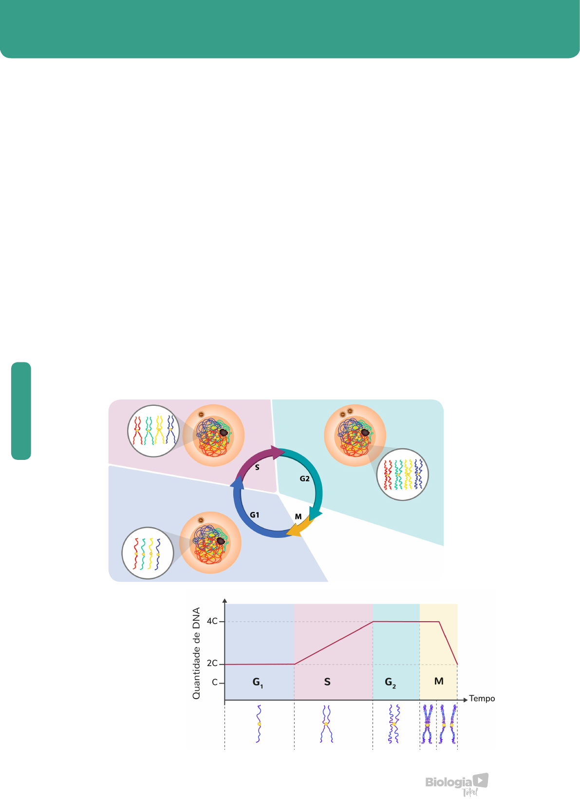16 CI TO G EN ÉT IC A CICLO CELULAR Compreende todo o período que vai desde o surgimento da célula até o momento em que ela se divide. O ciclo celular é dividido em duas etapas principais: divisão celular e interfase. A divisão compreende a mitose, divisão do núcleo, e é normalmente seguida imediatamente pela citocinese, divisão do citoplasma. INTERFASE O período que antecede a divisão celular é chamado de interfase. Este período é caracteriza- se por intensa atividade metabólica. A interfase é dividida em três períodos: 1) Período G1: a letra G vem da palavra gap, que significa “intervalo”, em inglês. Nesse período, A quantidade de DNA que a célula possui num determinado momento do ciclo celular varia de acordo com os períodos sendo mínima no período G1, dobra em S, atinge o valor máximo em G2 e volta a ser mínima na telófase, como mostrado no gráfico abaixo. ocorre crescimento da célula até alcançar seu tamanho normal. Há intensa produção de RNA no núcleo, e síntese de proteínas no citoplasma. 2) Período S: vem de synthesis. Nele, a célula duplica seu material genético, graças à replicação do DNA da cromatina. Após a duplicação, o cromossomo, que era formado por um cromonema, passa a ter dois filamentos unidos pelo centrômero. São duas cromátides- irmãs. 3) Período G2: duplicado todo o material hereditário, a célula entra em outro período de crescimento, semelhante ao G1, mas com menor produção de RNA e de proteínas. É o momento de aparecimento das proteínas que irão constituir o fuso mitótico, assumindo um arranjo especial organizado pelos centríolos. CI TO G EN ÉT IC A 17www.biologiatotal.com.br MITOSE É o processo de divisão que origina duas células- filhas com o mesmo número de cromossomos da célula-mãe. A mitose para os seres unicelulares, significa reprodução. Quando um protozoário se divide, está, na verdade, originando 2 novos indivíduos. Para os pluricelulares, divisão celular se relaciona com 1) Crescimento: o aumento do tamanho do indivíduo se dá pelo aumento do número e do tamanho das células. 2) Renovação celular: certos tecidos substituem periodicamente suas células graças às divisões de células precursoras. Assim ocorre a renovação dos glóbulos vermelhos do sangue e da camada superficial da epiderme. 3) Regeneração: alguns tecidos, como o tecido hepático, têm grande poder de substituir células mortas graças às divisões das células restantes. 4) Cicatrização: nos casos de perda de células devido a lesões acidentais ou provocadas, ocorre substituição do tecido original por outro, formando o que chamamos de cicatriz. Isto ocorre quando se faz uma cirurgia, por exemplo. 5) Manutenção do número de cromossomos da célula: a mitose pode ocorrer em células haploides (N), diploides (2N), triploides (3N), etc. Todas originam 2 células-filhas com o mesmo número de cromossomos. As pesquisas mostram que, com o crescimento da célula, a relação entre o volume celular e a área da sua membrana se torna desproporcional até alcançar um valor crítico, que desencadeia a divisão celular. Como a superfície da membrana é importante para as trocas com o meio externo, se essa superfície fica pequena em relação ao volume interno a ser mantido, a célula entra em divisão originando duas células-filhas menores e, portanto, capazes de absorver os nutrientes necessários à sobrevivência da célula ou tecido. Na mitose, verificamos comportamentos característicos dos cromossomos, mudanças na estrutura do núcleo, da membrana nuclear, dos centríolos e do nucléolo. As fases da mitose são em número de quatro e são denominadas como: prófase, metáfase, anáfase e telófase. A. PRÓFASE É a mais longa. Tem início com um discreto aumento de volume do núcleo. A cromatina começa a se espiralizar. Os nucléolos desaparecem. Os centríolos já duplicados migram para os polos da célula. Durante a migração, fibras proteicas se colocam como raios ao redor dos centríolos, formando o áster. Surgem, também, fibras que ligam um par de centríolos ao outro, formando o fuso mitótico ou fuso acromático. No final da prófase, a carioteca se rompe e os cromossomos, através dos centrômeros, ligam- se às fibras do fuso mitótico. B. METÁFASE Os cromossomos se colocam na região equatorial da célula. As cromátides-irmãs, ainda unidas pelo centrômero, atingem seu grau máximo de condensação, tornando-se bem visíveis ao microscópio. É nesta fase que melhor se visualiza os cromossomos. C. ANÁFASE Seu início é marcado pela divisão dos centrômeros e separação das cromátides-irmãs. As fibras do fuso mitótico se encurtam e tracionam os cromossomos arrastando as cromátides-irmãs para polos opostos (metacinese). No final dessa fase, em cada polo há número de cromossomos igual ao que havia na célula que iniciou a divisão, embora agora com apenas um filamento cada um. Tem início a desespiralização dos cromossomos. 18 CI TO G EN ÉT IC A D. TELÓFASE Os cromossomos desespiralizados estão dispostos em dois conjuntos, um em cada polo. Cada conjunto é envolvido por uma nova carioteca, que surge pela fusão de segmentos do retículo endoplasmático. Desaparecem os filamentos do áster e do fuso mitótico. 1. Prófase Cromossomos duplicados em condensação Cromátides irmãs Fibras cromossômicas Cromossomos condensados alinhados no equador (placa metafásica) Carioteca Nucléolo em desaparecimento 2. Metáfase 3. Anáfase 4. Telófase Encurtamento das fibras cromossômicas Reaparecimento dos nucleólos Reorganização das cariotecas Divisão citoplasmática (citocinese) Cromossomos irmãos migrando para polos opostos Na região equatorial, em toda a circunferência da célula, surge o sulco de divisão, e, à medida que se aprofunda, aumenta o estrangulamento nesta região. Ocorre a separação das duas células-filhas. É a citocinese. LEITURA COMPLEMENTAR