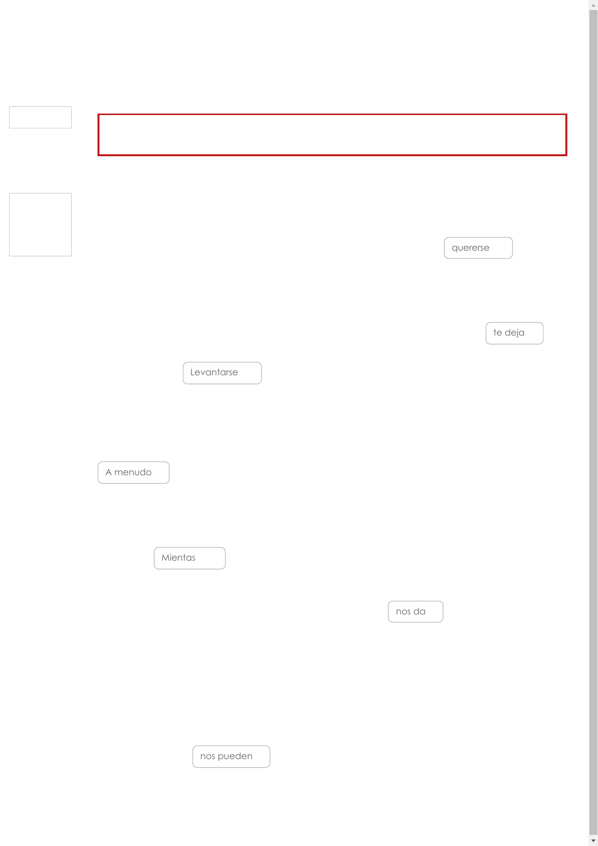 Informação Questão 1 Correto Atingiu 1,00 de 1,00 Iniciado em quarta-feira, 10 jan. 2024, 09:51 Estado Finalizada Concluída em quarta-feira, 10 jan. 2024, 09:53 Tempo empregado 1 minuto 35 segundos Notas 1,00/1,00 Avaliar 10,00 de um máximo de 10,00(100%) Rellena los huecos con la alternativa correcta utilizando los verbos reflexivos y los adverbios seg[un el contexto. Cómo ser feliz (adaptado) Lee con atención cuáles son las doce reglas para ser feliz. 12. Aceptación: Uno de los pasos más importantes para saber cómo ser feliz es a ti mismo y recordar lo importante que eres, lo mucho que vales, lo inteligente, y capaz, no hay obstáculo que no puedas vencer. 11. Cero envidias: No debes envidiar a nadie por lo que tiene o por lo que es. Ellos alcanzaron su meta, logra tú las tuyas y así sabrás como ser feliz. 10. Sin rencor: Como ser feliz incluye no guardar rencor hacia nadie, este sentimiento no ser feliz. tú perdona y olvida. 9. Con una sonrisa: siempre con una sonrisa, observar a tu alrededor y descubrir en todas las cosas el lado bueno y bonito y poco a poco sabrás como ser feliz. 8. Ayuda a los demais: Sin pensar que vas a recebir nada a cambio; mira a las personas y descubre en ellas sus cualidades y dales también a ellos el secreto para ser triunfadores y que de esta manera, sepan cómo ser feliz. 7. Momentos: La felicidad no está en los años, meses, en las semanas, ni siqueira en los días. la podemos encontrar en los momentos. La vida siempre tiene derecho a sorprendermos, así que aprende a vivir el presente sin los traumas del pasado ni las expectativas del futuro. 6. El humo: La sonrisa es muy importante para mejorar la autoestima. Tomar las cosas con serenidad por muy malas que parezcan, son solo momentos y lo mejor es recordarlas con humor y como experiencia para saber cómo ser feliz. 5. El perdón: tengas resentimientos y odios, será imposible ser feliz. Lo maravilloso del perdón no es que libera al otro de su eventual culpa, sino que te libera a ti de un sufrimiento y así comenzaras a saber cómo ser feliz. 4. La few: Cómo ser feliz significa tener few, la few crea confianza, paz mental y libera al alma de sus dudas, las preocupaciones, la ansiedad y el miedo. Dicen que el hombre llega a ser sabio cuando aprende a reír de sí mismo. Ríe, ríe alegremente... y el mundo reirá contigo. 3. La actitud: La felicidad es una ellección que puedo hacer en cualquier momento y en cualquier lugar. Los pensamientos son los que me hacen sentir feliz o desgraciado, no mis circunstancias. Así se aprende a cómo ser feliz con una actitud positiva. 2. Con lo que se tiene: Cómo ser feliz y no desear lo de otros, hay que aprender a vivir con lo que se tiene y no con lo que se carece, eso nos ayudará a que la felicidad siempre esté de nuestro lado. 1. Esperanza: La esperanza es una clave importante de cómo ser feliz. no todos los días son iguales muchas vecez hay cosas que doler mucho, problemas por resolver y que nos afectan lo único que nos queda es tener esperanza y las cosas poco a poco cambiarán. quererse te deja Levantarse A menudo Mientas nos da nos pueden
