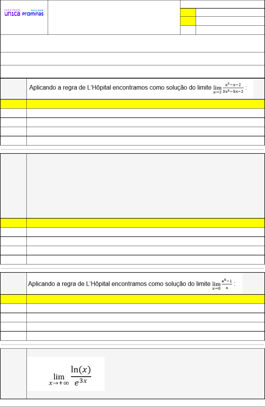 Pincel Atômico - 05/03/2024 21:29:12 1/3 ALAN MICHEL MENDONÇA RIBEIRO Exercício Caminho do Conhecimento - Etapa 4 (19353) Atividade finalizada em 03/02/2024 19:37:37 (1244934 / 1) LEGENDA Resposta correta na questão # Resposta correta - Questão Anulada X Resposta selecionada pelo Aluno Disciplina: PRÁTICA PEDAGÓGICA INTERDISCIPLINAR: EQUAÇÕES DIFERENCIAIS ORDINÁRIAS [935548] - Avaliação com 8 questões, com o peso total de 3,33 pontos [capítulos - 2] Turma: Segunda Graduação: Segunda Graduação 6 meses - Licenciatura em Matemática - Grupo: FPD-OUTUBRO/2023 - SGegu0A041023 [101341] Aluno(a): 91516869 - ALAN MICHEL MENDONÇA RIBEIRO - Respondeu 8 questões corretas, obtendo um total de 3,33 pontos como nota [360347_1741 09] Questão 001 X 3/7 2/7 4/7 1/7 5/7 [360349_1107 43] Questão 002 Sobre os limites no infinito foram feitas três afirmações: I. Todo limite no infinito pode ser calculado mediante a substituição direta da variável pelo extremo do intervalo superior. II. Quando no limite resultar uma indeterminação dos tipos 0/0 ou (±∞)/(±∞) deve-se considerar a regra de L’Hôpital. III. Os gráficos dos limites no infinito não contribuem para modelos matemáticos de situações reais. É correto o que se afirma em: X II, apenas. II e III, apenas. I e II, apenas. III, apenas. I, apenas. [360347_1740 99] Questão 003 X -1 -2 2 3 1 [360347_1107 38] Questão 004 Analise o limite abaixo: Resolvendo-o, chega-se em: Pincel Atômico - 05/03/2024 21:29:12 2/3 X 0 +∞ -∞ 3 -3 [360348_1107 42] Questão 005 Veja a situação abaixo: De acordo as informações apresentadas, avalie as afirmativas abaixo: I. A situação apresentada traz dois limites que resultam em indefinições. II. O limite da esquerda na expressão converge para 0, enquanto o segundo diverge para -∞. III. O resultado da expressão acima será uma divergência para +∞. É correto o que se afirma em: I, apenas. I e II, apenas. X III, apenas. I e III, apenas. II, apenas. [360347_1741 04] Questão 006 3 4 1 2 X 0 [360347_1741 06] Questão 007 2 0 -1 X -2 3 Pincel Atômico - 05/03/2024 21:29:12 3/3 [360347_1107 39] Questão 008 Analise a situação abaixo: Considerando a situação apresentada, avalie a seguintes asserções e a relação proposta entre elas. I. A soma dos limites da situação será 0. PORQUE II. O primeiro limite resultará em uma indefinição, sendo necessária a regra de L’Hôpital. Já o segundo converge para 0 na medida em que x aumenta seu valor para infinito. A respeito destas asserções, assinale a opção correta. As asserções I e II são proposições falsas. As asserções I e II são proposições verdadeiras, mas a II não é uma justificativa da I. A asserção I é uma proposição verdadeira e, a II é uma proposição falsa. A asserção I é uma proposição falsa e, a II é uma proposição verdadeira. X As asserções I e II são proposições verdadeiras, e a II eÌ• uma justificativa da I.