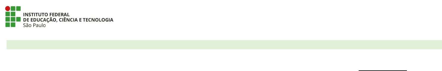 1ª CONVOCAÇÃO PARA MATRÍCULA – Edital 674/2019 ATENÇÃO: As informações sobre o Câmpus Guarulhos não constam neste documento. Os candidatos devem consultar, a partir das 17h, o endereço eletrônico http://portal.ifspguarulhos.edu.br/. Para maiores informações, entrar em contato pelos telefones: 2304-4251 / 2304-4252 / 2304-4256. Considerando o Edital IFSP N° 674, de 16 de setembro de 2019, Após a publicação da Classificação e de acordo com os critérios de ocupação das vagas, todos os candidatos em seguida listados estão convocados para efetivar a matrícula, a partir do dia 13/01/2020. Os endereços e os horários de comparecimento estão dispostos nas páginas a seguir. Os documentos necessários para efetivar a matrícula também estão listados a seguir e devem ser apresentados em cópias autenticadas ou cópias simples, acompanhadas de originais para conferência. Na condição do candidato ser menor de idade, o comparecimento é obrigatório para seu responsável (pai, mãe, curador ou tutor) ou representante legal, que deverá apresentar, nesse caso, procuração simples. No caso de pai e/ou mãe, será necessária apenas a apresentação de documentação oficial de identificação. Será permitida a matrícula por procuração para candidatos maiores de idade, destinada especificamente a este fim, mediante a entrega do respectivo documento, em uma das seguintes modalidades: a) procuração registrada em cartório competente ou b) procuração particular, com firma reconhecida. As matrículas dos candidatos serão realizadas mediante entrega dos documentos exigidos e atendimento aos pré-requisitos constantes no Edital, de acordo com o curso escolhido e as respostas fornecidas no ato da inscrição. A prestação de informação falsa pelo estudante, apurada durante ou posteriormente à matrícula, em procedimento que lhe assegure o contraditório e a ampla defesa, ensejará o cancelamento de sua matrícula, sem prejuízo das sanções penais eventualmente cabíveis. A ausência do candidato convocado, de seu responsável ou representante legal, ao endereço destinado, na data e horário da matrícula, será considerada renúncia expressa à vaga, não cabendo recurso. Caso não sejam preenchidas todas as vagas em 1ª chamada, as próximas convocações serão divulgadas nos endereços eletrônicos dos Câmpus, juntamente com o número de vagas restantes. Cabe dedicar, ainda, atenção ao disposto na versão integral do Edital, disponível no endereço eletrônico www.ifsp.edu.br. ESCALA DE MATRÍCULAS CAMPUS CURSOS TURNO DIAS / HORÁRIOS ENDEREÇOS 13/01 14/01 15/01 16/01 17/01 ARARAQUARA Informática Vespertino 08h às 14h 08h às 14h 08h às 14h 08h às 14h Rua Drº Aldo Benedito Pierri, 250 - Jardim Paulo Freire – Araraquara/SP CEP: 14804-296 Telefone: (16) 3303-2330 http://arq.ifsp.edu.br/portal/ Mecânica Vespertino 08h às 14h 08h às 14h 08h às 14h 08h às 14h Informática Noturno 08h às 14h 08h às 14h 08h às 14h 08h às 14h Mecatrônica Noturno 08h às 14h 08h às 14h 08h às 14h 08h às 14h AVARÉ Agroindústria Integral 12h às 19h 12h às 19h 12h às 19h 12h às 19h Av. Professor Celso Ferreira da Silva, 1333 – Jardim Europa – Avaré/SP - CEP: 18707-150 Telefone: (14) 3731-0300 http://avr.ifsp.edu.br Lazer Integral 12h às 19h 12h às 19h 12h às 19h 12h às 19h Mecatrônica Integral 12h às 19h 12h às 19h 12h às 19h 12h às 19h Eventos Noturno 12h às 19h 12h às 19h 12h às 19h 12h às 19h Mecânica Noturno 12h às 19h 12h às 19h 12h às 19h 12h às 19h BARRETOS Agropecuária Integral 08h às 14h 08h às 14h 08h às 14h 08h às 14h Avenida C-1, 250 – Bairro Ide Daher - Barretos/SP CEP: 14781- 502 Telefone: (17) 3312-0700 http://brt.ifsp.edu.br Alimentos Integral 08h às 14h 08h às 14h 08h às 14h 08h às 14h Informática Integral 08h às 14h 08h às 14h 08h às 14h 08h às 14h Agronegócio Noturno 08h às 14h 08h às 14h 08h às 14h 08h às 14h BIRIGUI Administração Integral 13h30 às18h30 13h30 às18h30 13h30 às18h30 13h30 às18h30 Rua Pedro Cavalo, 709 – Portal da Pérola II - Birigui/SP CEP: 16201-407 Telefone: (18) 3643-1166 https://bri.ifsp.edu.br/portal2/ Informática Integral 13h30 às18h30 13h30 às18h30 13h30 às18h30 13h30 às18h30 Administração Noturno 13h30 às18h30 13h30 às18h30 13h30 às18h30 13h30 às18h30 Automação Industrial Noturno 13h30 às18h30 13h30 às18h30 13h30 às18h30 13h30 às18h30 BOITUVA Automação Industrial Integral 13h30 às 19h 13h30 às 19h 13h30 às 19h 13h30 às 19h Av. Zélia de Lima Rosa, 100 - Portal dos Pássaros CEP: 18540-000 Boituva-SP Telefone: (15) 3363-8610 btv.ifsp.edu.br Redes de Computadores Integral 13h30 às 19h 13h30 às 19h 13h30 às 19h 13h30 às 19h Logística Vespertino 13h30 às 19h 13h30 às 19h 13h30 às 19h 13h30 às 19h Logística Noturno 13h30 às 19h 13h30 às 19h 13h30 às 19h 13h30 às 19h Automação Industrial Noturno 13h30 às 19h 13h30 às 19h 13h30 às 19h 13h30 às 19h BRAGANÇA PAULISTA Eletroeletrônica Integral 14h às 20h 14h às 20h 14h às 20h 14h às 20h Av. Major Fernando Valle, 2013 - Jardim São Miguel - Bragança Paulista/SP - CEP 12903-000 Telefone: (11) 4034-7800 http://bra.ifsp.edu.br/ Informática Integral 14h às 20h 14h às 20h 14h às 20h 14h às 20h Mecânica Integral 14h às 20h 14h às 20h 14h às 20h 14h às 20h Mecatrônica Vespertino 14h às 20h 14h às 20h 14h às 20h 14h às 20h Mecatrônica Noturno 14h às 20h 14h às 20h 14h às 20h 14h às 20h CAMPINAS Eletrônica Matutino 13h às 17h 13h às 17h 13h às 17h 13h às 17h Av. Heitor de Lacerda Guedes, n° 1000, Bairro Jardim Satélite Íris, Campinas/SP Informática Vespertino 13h às 17h 13h às 17h 13h às 17h 13h às 17h Eletroeletrônica Noturno 13h às 17h 13h às 17h 13h às 17h 13h às 17h Informática Matutino 13h às 17h 13h às 17h 13h às 17h 13h às 17h CAMPOS DO JORDÃO Edificações Noturno 10 às 16h 10 às 16h 10 às 16h 10 às 16h Rua Monsenhor José Vit