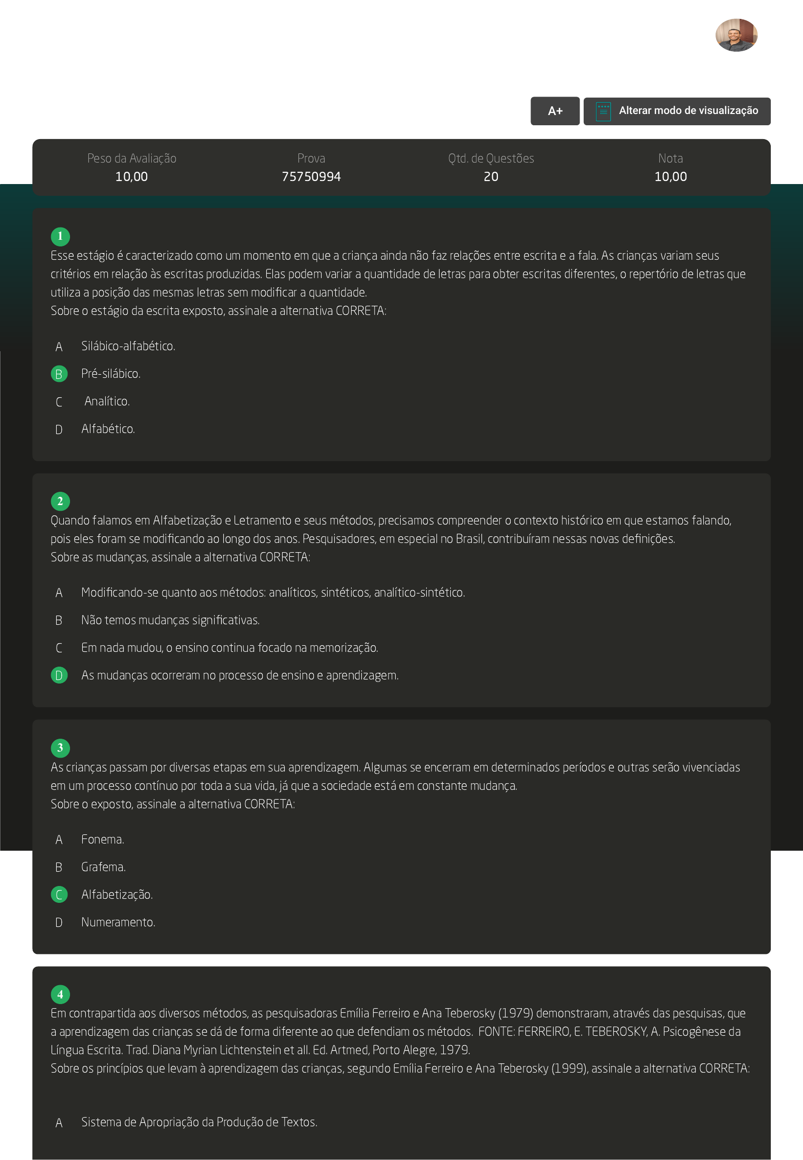 08/03/2024, 13:28 AVA https://ava2.uniasselvi.com.br/subject/grades-and-tests/answer-book/eyJ0ZXN0Ijp7InRlc3RDb2RlIjoiNzQ0Njg5IiwiZGVzY3JpcHRpb24iOiJBdmFsaWHDp8OjbyBkYSBEaXNjaXBsaW5hIiwicGFyYW1ldGVyIjpudWxsL… 1/5 GABARITO | Avaliação da Disciplina (Cod.:744689) Peso da Avaliação 10,00 Prova 75750994 Qtd. de Questões 20 Nota 10,00 Esse estágio é caracterizado como um momento em que a criança ainda não faz relações entre escrita e a fala. As crianças variam seus critérios em relação às escritas produzidas. Elas podem variar a quantidade de letras para obter escritas diferentes, o repertório de letras que utiliza a posição das mesmas letras sem modificar a quantidade. Sobre o estágio da escrita exposto, assinale a alternativa CORRETA: A Silábico-alfabético. B Pré-silábico. C Analítico. D Alfabético. Quando falamos em Alfabetização e Letramento e seus métodos, precisamos compreender o contexto histórico em que estamos falando, pois eles foram se modificando ao longo dos anos. Pesquisadores, em especial no Brasil, contribuíram nessas novas definições. Sobre as mudanças, assinale a alternativa CORRETA: A Modificando-se quanto aos métodos: analíticos, sintéticos, analítico-sintético. B Não temos mudanças significativas. C Em nada mudou, o ensino continua focado na memorização. D As mudanças ocorreram no processo de ensino e aprendizagem. As crianças passam por diversas etapas em sua aprendizagem. Algumas se encerram em determinados períodos e outras serão vivenciadas em um processo contínuo por toda a sua vida, já que a sociedade está em constante mudança. Sobre o exposto, assinale a alternativa CORRETA: A Fonema. B Grafema. C Alfabetização. D Numeramento. Em contrapartida aos diversos métodos, as pesquisadoras Emília Ferreiro e Ana Teberosky (1979) demonstraram, através das pesquisas, que a aprendizagem das crianças se dá de forma diferente ao que defendiam os métodos. FONTE: FERREIRO, E. TEBEROSKY, A. Psicogênese da Língua Escrita. Trad. Diana Myrian Lichtenstein et all. Ed. Artmed, Porto Alegre, 1979. Sobre os princípios que levam à aprendizagem das crianças, segundo Emília Ferreiro e Ana Teberosky (1999), assinale a alternativa CORRETA: A Sistema de Apropriação da Produção de Textos. VOLTAR A+ Alterar modo de visualização 1 2 3 4 Marilson Matos de Jesus Metodologia de Ensino de Língua Portuguesa e Literatura (6448520) 08/03/2024, 13:28 AVA https://ava2.uniasselvi.com.br/subject/grades-and-tests/answer-book/eyJ0ZXN0Ijp7InRlc3RDb2RlIjoiNzQ0Njg5IiwiZGVzY3JpcHRpb24iOiJBdmFsaWHDp8OjbyBkYSBEaXNjaXBsaW5hIiwicGFyYW1ldGVyIjpudWxsL… 2/5 B Sistema de Apropriação da Oralidade. C Sistema de Leitura e Escrita. D Sistema de Escrita Alfabético. Sabemos que, antes de iniciar uma leitura, podemos realizar um planejamos para que possamos atingir nossos objetivos. Conforme Solé (1998), “procedimentos que auxiliam o leitor a alcançar os objetivos pretendidos com a leitura e a construir o sentido do texto”. FONTE: SOLÉ, I. Estratégias de Leitura. 6.ed. Porto Alegre: Artmed, 1998. Sobre as ligações necessárias para que isso ocorra, assinale a alternativa CORRETA: A Objetivos da leitura, diversos gêneros, estratégias de leitura. B Gêneros, leitura, repetições. C Textos, leitura, repetições. D Objetivos, oralidade, produções textuais. Diferentes métodos de alfabetização foram sendo adotados no Brasil, ao longo da história, com o objetivo de auxiliar o indivíduo no processo de aquisição da escrita. Tradicionalmente podemos dividir os métodos em três grupos. Sobre estes três grupos, assinale a alternativa CORRETA: A Métodos analíticos, Método de fônico e Método de oralidade. B Métodos sintéticos, Métodos analíticos e os Analíticos-sintéticos. C Métodos analíticos, Método de leitura e Método de texto. D Método fônico, Método gráfico e Método de fluência. A escola costuma se organizar e sistematizar o ensino de acordo com as diversas atividades presentes no seu dia a dia. Diversos materiais e atividades podem contribuir para uma melhor aprendizagem por parte dos estudantes. Sobre a função das atividades permanentes, assinale a alternativa CORRETA: A Levar as crianças a conhecer os gêneros textuais B Essa modalidade de organização é muito adequada aos objetivos atitudinais e procedimentais. C Ensinar a ler e escrever textos na modalidade oral. D É ensinar a alfabetizar e letrar as crianças no período da alfabetização. As estratégias de leitura são recursos que auxiliam no processo de construção de sentido. De acordo com SOLÉ (1998), é necessário ensinar as estratégias de leitura para que os estudantes possam fazer uso em suas vidas. FONTE: SOLÉ, I. Estratégias de Leitura. 6.ed. Porto Alegre: Artmed, 1998. De acordo com as estratégias para ensinar aos alunos, classifique V para as sentenças verdadeiras e F para as falsas: ( ) Compreender os propósitos da leitura. ( ) Ativar e relacionar os conhecimentos prévios relevantes para o conteúdo. ( ) Dirigir a atenção ao fundamental (Qual é a informação essencial proporcionada pelo texto, da qual preciso para atingir meus objetivos). ( ) Avaliar a consistência do texto e os conhecimentos prévios que disponho. Assinale a alternativa que apresenta a sequência CORRETA: A F – F – F – F. B V – F – V – F. C F – V – V – V. 5 6 7 8 Marilson Matos de Jesus Metodologia de Ensino de Língua Portuguesa e Literatura (6448520) 08/03/2024, 13:28 AVA https://ava2.uniasselvi.com.br/subject/grades-and-tests/answer-book/eyJ0ZXN0Ijp7InRlc3RDb2RlIjoiNzQ0Njg5IiwiZGVzY3JpcHRpb24iOiJBdmFsaWHDp8OjbyBkYSBEaXNjaXBsaW5hIiwicGFyYW1ldGVyIjpudWxsL… 3/5 D V – V – V – V. Segundo BUNZEN (2007), “Assim sendo, os textos estruturados nos gêneros textuais estão presentes na escola através de diferentes suportes e recursos, porém podemos destacar um dos recursos importantes de trazer essa diversidade de gêneros para dentro