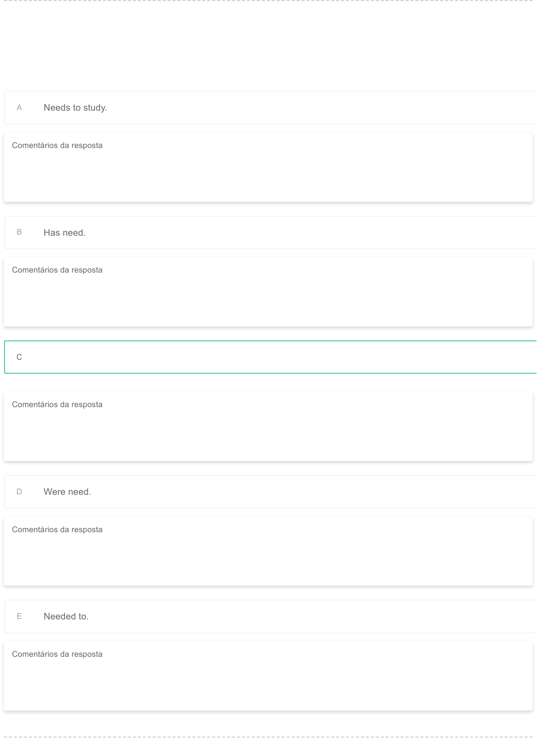 Questão 1 0,60/0,60 Selecione a resposta: Comentários da resposta Need to study completa a frase porque está no presente, combinando com o advérbio every day e apresentando a conjugação adequada para o sujeito I. Os demais verbos ou estão em terceira pessoa ou no passado. Comentários da resposta Need to study completa a frase porque está no presente, combinando com o advérbio every day e apresentando a conjugação adequada para o sujeito I. Os demais verbos ou estão em terceira pessoa ou no passado. C Need to study. Você acertou! Comentários da resposta Need to study completa a frase porque está no presente, combinando com o advérbio every day e apresentando a conjugação adequada para o sujeito I. Os demais verbos ou estão em terceira pessoa ou no passado. Comentários da resposta Need to study completa a frase porque está no presente, combinando com o advérbio every day e apresentando a conjugação adequada para o sujeito I. Os demais verbos ou estão em terceira pessoa ou no passado. Comentários da resposta Need to study completa a frase porque está no presente, combinando com o advérbio every day e apresentando a conjugação adequada para o sujeito I. Os demais verbos ou estão em terceira pessoa ou no passado. O verb phrase que completa a lacuna na frase I _________ English every day é: A Needs to study. B Has need. D Were need. E Needed to. Questão 2 0,60/0,60 Selecione a resposta: A É Uma expressão composta por substantivos. Você acertou! Comentários da resposta Um noun phrase é um grupo de palavras formado por um ou mais substantivos, constituindo uma expressão em que esse substantivo é a palavra mais importante. Comentários da resposta Um noun phrase é um grupo de palavras formado por um ou mais substantivos, constituindo uma expressão em que esse substantivo é a palavra mais importante. Comentários da resposta Um noun phrase é um grupo de palavras formado por um ou mais substantivos, constituindo uma expressão em que esse substantivo é a palavra mais importante. Comentários da resposta Um noun phrase é um grupo de palavras formado por um ou mais substantivos, constituindo uma expressão em que esse substantivo é a palavra mais importante. Comentários da resposta Um noun phrase é um grupo de palavras formado por um ou mais substantivos, constituindo uma expressão em que esse substantivo é a palavra mais importante. O que é um noun phrase? B É uma expressão composta por várias palavras. C É um sujeito simples em frases declarativas. D É um sujeito composto em frases declarativas. E É uma frase complexa. Questão 3 0,60/0,60 São exemplos de um adjective phrase: Selecione a resposta: Comentários da resposta Um adjective phrase é uma expressão formada por um adjetivo ou por um grupo de palavras que possui um adjetivo como palavra principal, podendo ser acompanhado por um advérbio. Comentários da resposta Um adjective phrase é uma expressão formada por um adjetivo ou por um grupo de palavras que possui um adjetivo como palavra principal, podendo ser acompanhado por um advérbio. Comentários da resposta Um adjective phrase é uma expressão formada por um adjetivo ou por um grupo de palavras que possui um adjetivo como palavra principal, podendo ser acompanhado por um advérbio. D Very good e very bad. Você acertou! Comentários da resposta Um adjective phrase é uma expressão formada por um adjetivo ou por um grupo de palavras que possui um adjetivo como palavra principal, podendo ser acompanhado por um advérbio. Comentários da resposta Um adjective phrase é uma expressão formada por um adjetivo ou por um grupo de palavras que possui um adjetivo como palavra principal, podendo ser acompanhado por um advérbio. A Total e totally. B Very well e very badly. C Quite e extremely. E Easy e simply. Questão 4 0,60/0,60 Selecione a resposta: Na frase My mother cooked very well for us, very e for us são respectivamente: Comentários da resposta Um adverb phrase traz como palavra principal um advérbi. Uma prepositional phrase é uma expressão que começa com preposição, geralmente acompanhando substantivos ou pronomes. Comentários da resposta Um adverb phrase traz como palavra principal um advérbi. Uma prepositional phrase é uma expressão que começa com preposição, geralmente acompanhando substantivos ou pronomes. Comentários da resposta Um adverb phrase traz como palavra principal um advérbi. Uma prepositional phrase é uma expressão que começa com preposição, geralmente acompanhando substantivos ou pronomes. Comentários da resposta Um adverb phrase traz como palavra principal um advérbi. Uma prepositional phrase é uma expressão que começa com preposição, geralmente acompanhando substantivos ou pronomes. E Uma adverb phrase e uma prepositional phrase. Você acertou! Comentários da resposta Um adverb phrase traz como palavra principal um advérbi. Uma prepositional phrase é uma expressão que começa com preposição, geralmente acompanhando substantivos ou pronomes. A Um adverb phrase e um adverbial phrase. B Um verb phrase e um noun phrase. C Um adverb phrase e um noun phrase. D Uma adjective phrase e um noun phrase. Questão 5 0,60/0,60 Selecione a resposta: Comentários da resposta Qual das frases a seguir contém um phrasal verb? A They keep saying it’s for you. Um phrasal verb é uma expressão verbal composta por um verbo e um advérbio e/ ou preposição. Quando usados nessa condição, o advérbio e a preposição mudam o sentido do verbo. Verbos seguidos de preposição, sem modificação no seu significado, não são exemplos de phrasal verbs. B I'm looking forward to seeing you again. Você acertou! Comentários da resposta Um phrasal verb é uma expressão verbal composta por um verbo e um advérbio e/ ou preposição. Quando usados nessa condição, o advérbio e a preposição mudam o sentido do verbo. Verbos seguidos de preposição, sem modificação no seu significado, não sã