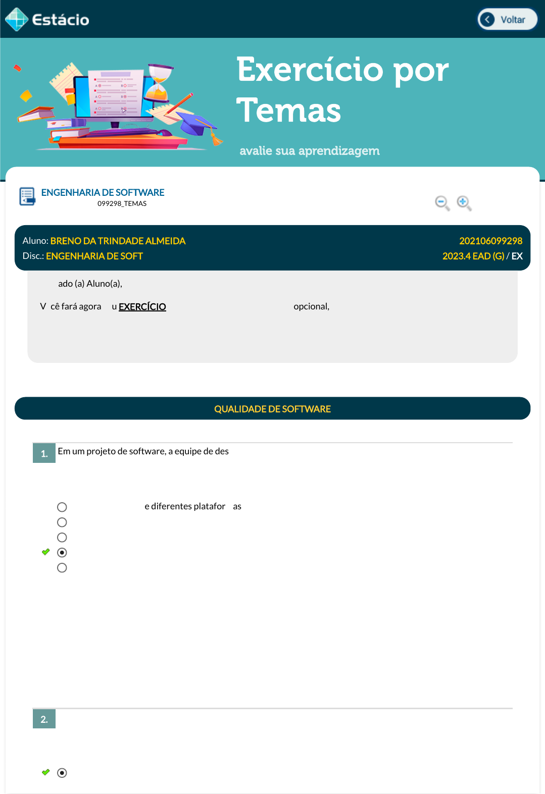 07/03/2024, 20:39 Estácio: Alunos https://simulado.estacio.br/alunos/ 1/4 Exercício por Temas avalie sua aprendizagem Em um projeto de software, a equipe de desenvolvimento se depara com a tarefa de medir a qualidade do produto �nal. Eles consideram diferentes métricas para avaliar aspectos como e�ciência, con�abilidade e usabilidade. Qual destas métricas é primordial para avaliar a e�ciência de um software? Durante o desenvolvimento de um software, a equipe se debruça sobre os padrões de qualidade. Eles buscam aderir a práticas que garantam a conformidade com normas estabelecidas, visando uma entrega de alto padrão. Qual padrão é frequentemente utilizado para garantir a qualidade em processos de desenvolvimento de software? ENGENHARIA DE SOFTWARE Lupa DGT0291_202106099298_TEMAS Aluno: BRENO DA TRINDADE ALMEIDA Matr.: 202106099298 Disc.: ENGENHARIA DE SOFT 2023.4 EAD (G) / EX Prezado (a) Aluno(a), Você fará agora seu EXERCÍCIO! Lembre-se que este exercício é opcional, mas não valerá ponto para sua avaliação. O mesmo será composto de questões de múltipla escolha. Após responde cada questão, você terá acesso ao gabarito comentado e/ou à explicação da mesma. Aproveite para se familiarizar com este modelo de questões que será usado na sua AV e AVS. QUALIDADE DE SOFTWARE 1. Portabilidade entre diferentes plataformas. Facilidade de manutenção. Frequência de erros encontrados. Tempo de resposta do sistema. Satisfação do usuário �nal. Data Resp.: 07/03/2024 20:37:34 Explicação: A métrica mais relevante para avaliar a e�ciência de um software é o tempo de resposta do sistema. Esta métrica re�ete diretamente a rapidez com que o software executa tarefas e responde às solicitações dos usuários, um aspecto crucial da e�ciência. 2. ISO 9001. javascript:voltar(); javascript:voltar(); javascript:voltar(); javascript:voltar(); javascript:diminui(); javascript:diminui(); javascript:aumenta(); javascript:aumenta(); 07/03/2024, 20:39 Estácio: Alunos https://simulado.estacio.br/alunos/ 2/4 Um gerente de projeto de software está analisando o impacto do controle de qualidade nos custos do projeto. Ele avalia como diferentes práticas de controle de qualidade podem afetar o custo total e a e�cácia do software entregue. Qual prática de controle de qualidade é mais efetiva para minimizar erros de software durante a fase de desenvolvimento? Uma indústria de alimentos compra sementes de vários fornecedores. No recebimento das cargas, as sementes passam por uma operação de classi�cação por cor, em uma esteira adquirida do fabricante MAQ, equipada com sensores e software de processamento de imagens. Na etapa seguinte do processo, as sementes são separadas em lotes, pelo critério de tamanho, e são, então, empacotadas. A separação dos lotes é realizada por um mecanismo robótico, controlado por computador e que, pelo fato de sofrer contínuo desgaste, necessita ser substituído a cada 1.000 horas de uso. Durante a última troca, em razão da indisponibilidade do equipamento produzido pela empresa MAQ, a indústria instalou, com sucesso, um equipamento robótico similar. Considerando o processo descrito, julgue os itens a seguir, relacionados aos fatores de qualidade. I- As operações de classi�cação e separação de sementes se interrelacionam e não podem falhar, pois essa falha acarretaria prejuízos. O atributo de qualidade correspondente a essas operações, e que deve ser observado pelo software, é a interoperabilidade. II- Caso o responsável pela instalação do sistema robotizado não tenha encontrado di�culdade em fazê-lo comunicar-se com o equipamento de outra marca, é correto concluir que o sistema que controla o robô é portável. III- A maneira como ocorre a interação com o sistema computacional sugere que alguns requisitos, como ergonomia, sejam observados na interface. Por isso, é correto concluir que o software utilizado pela indústria contempla o fator denominado usabilidade. Assinale a opção correta. ISO/IEC 27001. CMMI. ITIL. IEEE 830. Data Resp.: 07/03/2024 20:37:22 Explicação: O padrão ISO 9001 é amplamente reconhecido e utilizado para garantir a qualidade em processos de desenvolvimento de software. Este padrão foca em processos de gestão da qualidade, estabelecendo requisitos para sistemas de gestão da qualidade que, se seguidos, resultam em produtos e serviços consistentes e de alta qualidade. 3. Redução de revisões de código. Implementação tardia de testes de sistema. Limitação da interação com o cliente. Uso frequente de auditorias de qualidade. Adoção de uma abordagem Waterfall. Data Resp.: 07/03/2024 20:39:25 Explicação: O uso frequente de auditorias de qualidade é uma prática efetiva para minimizar erros de software durante a fase de desenvolvimento. Estas auditorias permitem identi�car e corrigir problemas no início, garantindo que o produto �nal atenda aos padrões de qualidade estabelecidos e reduzindo o risco de falhas signi�cativas após o lançamento. 4. 07/03/2024, 20:39 Estácio: Alunos https://simulado.estacio.br/alunos/ 3/4 Uma empresa de software decide implementar metodologias ágeis em seus processos de desenvolvimento. O objetivo é melhorar a e�ciência e a adaptabilidade às mudanças de requisitos durante o projeto. Qual metodologia ágil é conhecida por seu enfoque em ciclos de desenvolvimento curtos e adaptativos? Uma das classi�cações mais utilizadas para o acompanhamento da qualidade de software corresponde à categorização dos fatores de qualidade de McCall. Essa categorização estabelece as seguintes três categorias: Uma empresa de tecnologia enfrenta desa�os ao medir a usabilidade de seu software. Eles buscam identi�car parâmetros claros para avaliar a facilidade de uso e a satisfação do usuário. Qual métrica é essencial para medir a usabilidade de um software? Apenas os itens II e III estão certos. Apenas um i