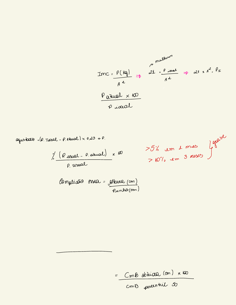Avaliação nutricional de adultos Peso atual : peso do momento Peso usual: peso de costume Peso ideal : peso estimado padrão PESO IDEAL Homens; 22kg/m Mulher; 21 kg/m IMC: 18,5-24,9 Kg/m2 : eutrófico Adequação do peso : Valor entre 90-110 normal Calculo de dieta não se usa peso ideal se usa o peso ajustado Peso ajustado é utilizado pra grupos aos extremos ( obeso, desnutrição) P Mudança de peso = Compleição óssea = tamanho do osso esta diretamente ligada ao peso Estatura do joelho Masculino: Altura = (2,02 X AJ)cm - (0,04 X Idade) + 64,19 Feminino: Altura = ( 1,83 x AJ)cm - (0,24 X idade) +84,88 Estatura da envergadura ( Braços esticados de dedo medio a dedo medio) Adequação da CB = CB obtida (CM) x 100 CB Percentil 50 Adequação da CMB ( considerando o osso ) - mulher Ima=PKg ↳ Ronal = 21 n A Pl A 2 / Patual< 100 O ideal afustado. P . Ideal - P. Atual) x 9 ,23 &P . grave >5% em 1 mes .Pusual-P. atual) x 1 > 10% em 3 mesas Y P . usual complicão ossea= (cm) Punho(cm) - -Obtida(em)<100 CmB percentil So
