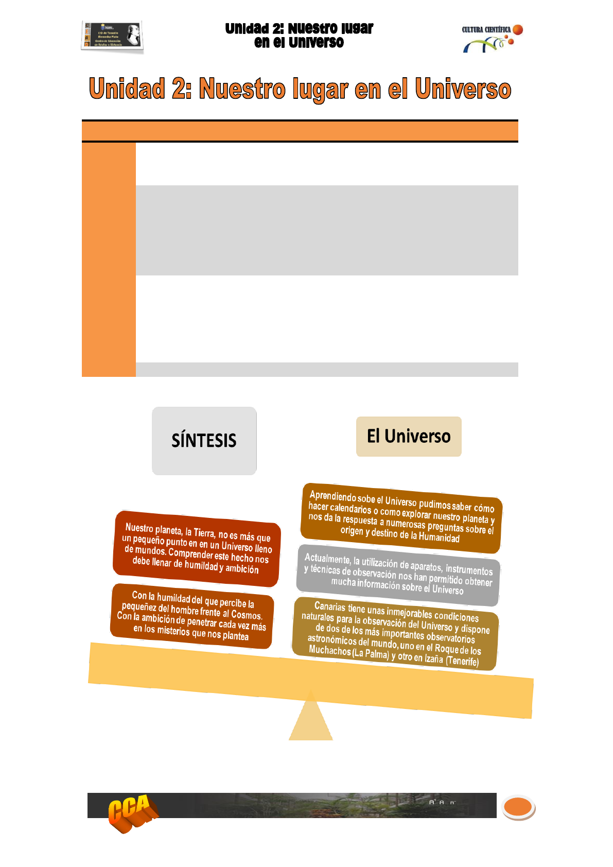 1 CAP. CONTENIDO PÁG 1 INTRODUCCIÓN 2 2 EL UNIVERSO 2.1. Origen, estructura y componentes del Universo 2.2. Medios para el estudio del Universo 2.3. Las galaxias 2.4. Las estrellas 2 3 4 4 3 EL SISTEMA SOLAR 3.1. Características del Sistema Solar 3.2. Los planetas. 3.3. Los satélites 4.4. Los asteroides y cometas. 6 7 8 8 2 El Universo conocido se estima que contiene unas cien mil millones de galaxias y cada una de ellas tiene cientos de miles de estrellas. En una de esas galaxias, a la que llamamos Vía Láctea, se encuentra una estrella de tamaño y brillo medio a la que llamamos Sol. A su alrededor giran ocho planetas y otros cuerpos celestes, formando una gran familia, el Sistema Solar. A uno de esos planetas le denominamos Tierra, en él hace millones de años, apareció la vida, así como la evolución de esa vida para engendrar organismos cada vez más complejos. Mucho más tarde apareció el ser humano. Nuestro planeta Tierra, nuestro Sol, nuestra Galaxia, todo lo que constituye nuestro entorno más inmediato no es más que una minúscula fracción en la inmensidad del Cosmos. 2.1. Origen, estructura y componentes del Universo Llamamos Universo a todo aquello de lo cual nos llega alguna información y que es observable y medible. El Universo es el conjunto de toda la materia y de toda la energía que existe en un espacio determinado y que se están intercambiando constantemente una en otra. Nuestro mundo constituye una parte muy pequeña de esa materia y de esa energía. Todo lo que no es materia y energía es vacío cósmico. En todas las épocas, la humanidad ha tratado de entender la naturaleza del Universo en su conjunto y de comprender nuestro lugar en él. Desde los orígenes de la civilización todas las culturas han propuesto representaciones del Universo, de tipo mitológico o religioso primero y desde un punto de vista científico después. Según los conocimientos actuales, el universo puede haberse originado a partir de una pequeña masa única de materia concentrada a gran temperatura y densidad. Esa masa se dispersó como consecuencia de una gran explosión ocurrida hace unos 13.700 millones de años, conocida también por la expresión inglesa Big Bang. Según esta teoría, la dispersión o expansión del universo no habría finalizado aún. 1. INTRODUCCIÓN 2. EL UNIVERSO 3 Durante los primeros momentos de vida del universo se formaron los átomos más sencillos, como los de hidrógeno (que actualmente puede representar las tres cuartas parte de la masa visible del universo) y helio (que representa casi la cuarta parte restante). El resto de los elementos químicos ligeros o pesados, abundantes en la Tierra (como el oxígeno, silicio, aluminio, hierro, etc.), muy escasos considerado el conjunto del universo, se fueron formando con posterioridad. El universo conocido está formado por los siguientes componentes: Materia visible u ordinaria: comprende la materia que forma las galaxias, estrellas, planetas y estructuras celestes capaces de emitir luz, o de reflejarla. Se supone que representa sólo entre el 5 % y el 10 % de la masa total del universo. Materia oscura: puede constituir entre el 90 % y el 95 % de la materia del universo. Su naturaleza y composición es poco conocida. Podría estar formada por partículas subatómicas. No emite luz ni la refleja de forma significativa (de ahí la denominación de materia oscura). Su existencia se deduce, no obstante, por su capacidad de ejercer fuerza gravitatoria sobre otros cuerpos celestes.. La materia visible está organizada formando estructuras muy variadas: cometas, satélites, planetas, estrellas, nebulosas, galaxias. 2.2. Medios para el estudio del Universo La Astronomía es la parte de la ciencia que estudia todo lo que se encuentra más allá de la atmósfera de la Tierra. Se ocupa de la naturaleza de los objetos que pueblan el espacio, los astros, de los procesos físicos y químicos que tiene lugar en ellos y de sus movimientos y las causas que los producen. La observación del cielo a simple vista sólo permitía estudiar una pequeña parte del Universo. Por esta razón se desarrollaron aparatos, instrumentos y técnicas de observación que han permitido obtener información de zonas muy lejanas del Universo o detalles de los astros más cercanos. Entre ellos destacan: los telescopios y radiotelescopios, las sondas espaciales y las naves tripuladas. 4 Las islas Canarias, además de sus inmejorables características naturales, disponen de una Ley de Protección de la Calidad del Cielo, que pretende que los cielos canarios se mantengan limpios de contaminación lumínica y en óptimo estado para la observación astronómica. Los programas espaciales actuales tienen como principal objetivo la creación de estaciones que hagan posible la permanencia de las personas en el espacio exterior durante largos periodos de tiempo. La primera gran estación espacial fue la MIR (paz en ruso) que estuvo en órbita desde 1986 hasta el 2001. Todo el trabajo realizado en la MIR sirvió para construir la Estación Espacial Internacional (ISS), que será el punto de partida de las conquistas espaciales en el siglo XXI. 2.3. Las Galaxias Las galaxias son acumulaciones de estrellas y de otros cuerpos celestes. Se calcula que en el universo pueden existir en la actualidad en torno a 100.000 millones de galaxias formadas a su vez cada una de ellas por miles de millones de estrellas y otros cuerpos. La forma de una galaxia puede ser elíptica, lenticular (forma de lente), espiral (normal o barrada) o irregular. El sistema solar del que forma parte el Sol, el planeta Tierra y otros planetas y cuerpos celestes, está situado en una galaxia espiral denominada Vía Láctea, de tamaño medio por el número de estrellas que contiene: más de 100.000 millones. Pose e un diámetro aproximado de 110.000 años luz: es decir, 110.000 veces la distancia que recorrería la luz en un año, viajando a la velocidad de 300.000 kilómetros por se