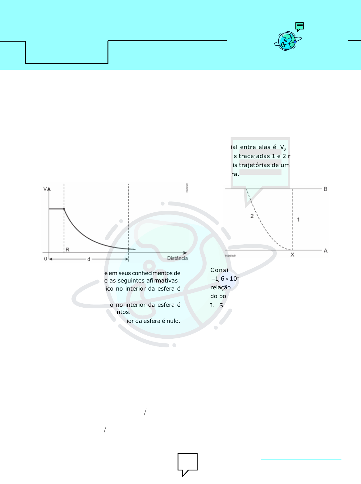 NARRADOUNIVERSO 01. (G1 - ifsul 2019) A figura a seguir ilustra, graficamente, o comportamento do Potencial Elétrico V, em função da Distância até o centro, de uma esfera condutora de raio R, eletrizada com carga positiva Q e em equilíbrio eletrostático. Considere a origem do sistema de coordenadas localizado no centro da esfera. Com base no gráfico e em seus conhecimentos de eletrostática, analise as seguintes afirmativas: I. O potencial elétrico no interior da esfera é nulo. II. O potencial elétrico no interior da esfera é igual em todos os pontos. III. O campo elétrico no interior da esfera é nulo. Estão corretas as afirmativas a) I e II, apenas. b) II e III, apenas. c) I e III, apenas. d) I, II e III. 02. (Uece 2018) Seja o sistema composto por duas cargas elétricas mantidas fixas a uma distância d e cujas massas são desprezíveis. A energia potencial do sistema é a) inversamente proporcional a 1 2d . b) proporcional a d2. c) proporcional a 1 d. d) proporcional a d. 03. (Fuvest 2018) Na figura, A e B representam duas placas metálicas; a diferença de potencial entre elas é V V VB A� � �2 0 10 4, . As linhas tracejadas 1 e 2 representam duas possíveis trajetórias de um elétron, no plano da figura. Considere a carga do elétron igual a � � �1 6 10 19, C e as seguintes afirmações com relação à energia cinética de um elétron que sai do ponto X na placa A e atinge a placa B : I. Se o elétron tiver velocidade inicial nula, sua energia cinética, ao atingir a placa B, será 3 2 10 15, .� � J II. A variação da energia cinética do elétron é a mesma, independentemente de ele ter percorrido as trajetórias 1 ou 2. III. O trabalho realizado pela força elétrica sobre o elétron na trajetória 2 é maior do que o realizado sobre o elétron na trajetória 1. Apenas é correto o que se afirma em a) I. b) II. c) III. d) I e II. e) I e III. 1 www.universonarrado.com.br C-04FRENT E Potencial Elétrico 2 www.universonarrado.com.br Lições de Física 04. (Mackenzie 2017) A intensidade do campo elétrico ( )E e do potencial elétrico ( )V em um ponto P gerado pela carga puntiforme Q são, respectivamente, 50 N C e 100 V. A distância d que a carga puntiforme se encontra do ponto P, imersa no ar, é a) 1 0, m b) 2 0, m c) 3 0, m d) 4 0, m e) 5 0, m 05. (Eear 2016) São dadas duas cargas, conforme a figura: Considerando E1 o módulo do campo elétrico devido à carga Q1, E2 o módulo do campo elétrico devido à carga Q2, V1 o potencial elétrico devido à carga Q1 e V2 o potencial elétrico devido à carga Q2. Considere Ep o campo elétrico e Vp o potencial resultantes no ponto P. Julgue as expressões abaixo como verdadeiras (V) ou falsas (F). ( ) Ep E E1 2 ( ) V V Vp 1 2 ( ) E E Ep 1 2 ( ) V V Vp 1 2 Assinale a alternativa que apresenta a sequência correta. a) V – V – F – F b) V – F – F – V c) F – F – V – V d) F – V – V – F 06. (Uece 2016) Os aparelhos de televisão que antecederam a tecnologia atual, de LED e LCD, utilizavam um tubo de raios catódicos para produção da imagem. De modo simplificado, esse dispositivo produz uma diferença de potencial da ordem de 25 kV entre pontos distantes de 50 cm um do outro. Essa diferença de potencial gera um campo elétrico que acelera elétrons até que estes se choquem com a frente do monitor, produzindo os pontos luminosos que compõem a imagem. Com a simplificação acima, pode-se estimar corretamente que o campo elétrico por onde passa esse feixe de elétrons é a) 0 5, .kV m b) 25 kV. c) 50 000. .V m d) 1 250, .kV cm⋅ 07. (G1 - ifsul 2016) Analise as seguintes afirmativas, relacionadas aos conceitos e aos fenômenos estudados em Eletrostática. I. O potencial elétrico aumenta, ao longo de uma linha de força e no sentido dela. II. Uma partícula eletrizada gera um campo elétrico na região do espaço que a circunda. Porém, no ponto onde ela foi colocada, o vetor campo elétrico, devido à própria partícula, é nulo. III. Uma partícula eletrizada com carga positiva quando abandonada sob a ação exclusiva de um campo elétrico, movimenta-se no sentido da linha de força, dirigindo-se para pontos de menor potencial. IV. A diferença de potencial elétrico (ddp) entre dois pontos quaisquer de um condutor em equilíbrio eletrostático é sempre diferente de zero. Estão corretas apenas as afirmativas a) I e III. b) II e IV. c) II e III. d) I e IV. 08. (Ueg 2015) Considere uma esfera condutora carregada com carga Q, que possua um raio R. O potencial elétrico dividido pela constante eletrostática no vácuo dessa esfera em função da distância d, medida a partir do seu centro, está descrito no gráfico a seguir. 3 www.universonarrado.com.br Frente: C-04 NARRADOUNIVERSO Qual é o valor da carga elétrica Q, em Coulomb? a) 2 0 104, × b) 4 0 103, × c) 0 5 106, × d) 2 0 106, × 09. (Mackenzie 2015) Uma carga elétrica de intensidade Q C� 10 0, ,� no vácuo, gera um campo elétrico em dois pontos A e B, conforme figura acima. Sabendo- se que a constante eletrostática do vácuo é k Nm C0 9 2 29 10� � / o trabalho realizado pela força elétrica para transferir uma carga q C� 2 00, � do ponto B até o ponto A é, em mJ, igual a a) 90 0, b) 180 c) 270 d) 100 e) 200 10. (Espcex (Aman) 2013) Duas esferas metálicas de raios RA e RB, com R RA B< , estão no vácuo e isoladas eletricamente uma da outra. Cada uma é eletrizada com uma mesma quantidade de carga positiva. Posteriormente, as esferas são interligadas por meio de um fio condutor de capacitância desprezível e, após atingir o equilíbrio eletrostático, a esfera A possuirá uma carga QA e um potencial VA, e a esfera B uma carga QB e um potencial VB. Baseado nas informações anteriores, podemos, então, afirmar que a) V VA B< e Q QA B= b) V VA B= e Q QA B= c) V VA B< e Q QA B< d) V VA B= e Q QA B< e) V VA B> e Q QA B= 11. (Upe 2013) Considere a Terra como uma esfera condutora, carregada uniformemente,