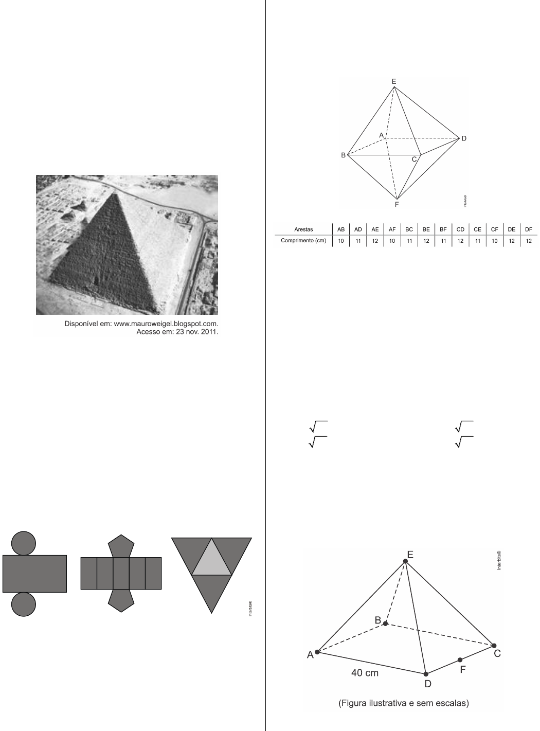 Lista de Exercícios (Mínima) – Geometria Espacial Módulo 5 – Aula 6: Pirâmides waldematica.com.br Nível: Droid 1. (Enem PPL) A figura mostra a pirâmide de Quéops, também conhecida como a Grande Pirâmide. Esse é o monumento mais pesado que já foi construído pelo homem da Antiguidade. Possui aproximadamente 2,3 milhões de blocos de rocha, cada um pesando em média 2,5 toneladas. Considere que a pirâmide de Quéops seja regular, sua base seja um quadrado com lados medindo 214 m, as faces laterais sejam triângulos isósceles congruentes e suas arestas laterais meçam 204 m. O valor mais aproximado para a altura da pirâmide de Quéops, em metro, é a) 97,0. b) 136,8. c) 173,7. d) 189,3. e) 240,0. 2. (Enem) Maria quer inovar em sua loja de embalagens e decidiu vender caixas com diferentes formatos. Nas imagens apresentadas estão as planificações dessas caixas. Quais serão os sólidos geométricos que Maria obterá a partir dessas planificações? a) Cilindro, prisma de base pentagonal e pirâmide. b) Cone, prisma de base pentagonal e pirâmide. c) Cone, tronco de pirâmide e prisma. d) Cilindro, tronco de pirâmide e prisma. e) Cilindro, prisma e tronco de cone. 3. (UERJ) A figura a seguir representa um objeto com a forma de um octaedro. Admita que suas arestas, feitas de arames fixados nos vértices, possuem os comprimentos indicados na tabela. Calcule o menor comprimento do arame, em centímetros, necessário para construir esse objeto. Nível: Stormtrooper 4. (UECE) Considere uma pirâmide regular hexagonal reta cuja medida da altura é 30 m e cuja base está inscrita em uma circunferência cuja medida do raio é igual a 10 m. Desejando-se pintar todas as faces triangulares dessa pirâmide, a medida da área a ser pintada, em 2m , é a) 115 39. b) 150 39. c) 125 39. d) 140 39. 5. (UFU) Um designer de jogos virtuais está simulando alguns deslocamentos associados com uma pirâmide quadrangular regular, em que o lado do quadrado da base mede 40 cm. Lista de Exercícios (Mínima) – Geometria Espacial Módulo 5 – Aula 6: Pirâmides waldematica.com.br Ele simula a trajetória de um lagarto pelas faces da pirâmide. Inicialmente o lagarto desloca-se de A até E e, posteriormente, de E até F, em que F é o ponto médio de CD. Cada um desses dois trechos da trajetória ocorre em linha reta. A projeção perpendicular dessa trajetória em ABCD, presente no plano da base da pirâmide, descreve uma curva R, a qual é a união de dois segmentos. Nessas condições, o comprimento de R, em cm, é igual a a) 20 2 b) 40 2 c) 40(1 2)+ d) 20(1 2)+ 6. (UTFPR) Uma barraca de camping foi projetada com a forma de uma pirâmide de altura 3 metros, cuja base é um hexágono regular de lados medindo 2 metros. Assim, a área da base e o volume desta barraca medem, respectivamente: a) 26 3 m e 36 3 m . b) 23 3 m e 33 3 m . c) 25 3 m e 32 3 m . d) 22 3 m e 35 3 m . e) 24 3 m e 38 3 m . 7. (PUC-RJ) Numa pirâmide de base quadrada, todas as arestas medem x. Quanto vale o volume da pirâmide? a) 3 2 x 6 b) 2xπ c) 3 2x x x 1+ + + d) 3x e) 3 6 x 3 8. (Albert Einstein - Medicina) Para a feira cultural da escola, um grupo de alunos irá construir uma pirâmide reta de base quadrada. A pirâmide terá 3 m de altura e cada aresta da base medirá 2 m. A lateral da pirâmide será coberta com folhas quadradas de papel, que poderão ser cortadas para um melhor acabamento. Se a medida do lado de cada folha é igual a 20 cm, o número mínimo dessas folhas necessárias à execução do trabalho será Utilize 10 3,2 a) 285 b) 301 c) 320 d) 333 9. (UECE) A medida da altura de uma pirâmide é 10 m e sua base é um triângulo retângulo isósceles cuja medida da hipotenusa é 6 m. Pode-se afirmar corretamente que a medida do volume dessa pirâmide, em 3m , é igual a a) 60. b) 30. c) 15. d) 45. 10. (UCS) Aumentando-se a medida "a" da aresta da base de uma pirâmide quadrangular regular em 30% e diminuindo- se sua altura "h" em 30%, qual será a variação aproximada no volume da pirâmide? a) Aumentará 18%. b) Aumentará 30%. c) Diminuirá 18%. d) Diminuirá 30%. e) Não haverá variação. 11. (UEPG) Uma pirâmide quadrangular regular tem 236 cm de área da base. Sabendo que a altura da pirâmide tem 3 3 cm, assinale o que for correto. 01) A área lateral da pirâmide é o dobro da área da base. 02) A área total da pirâmide é o triplo da área da base. 04) A área de uma face lateral da pirâmide é a sexta parte de sua área total. 08) A razão das áreas total e lateral dessa pirâmide é um número fracionário. 16) O volume dessa pirâmide é 3108 3 cm . 12. (UFPR) Temos, abaixo, a planificação de uma pirâmide de base quadrada, cujas faces laterais são triângulos equiláteros. Qual é o volume dessa pirâmide? a) 3 16 3 cm . 3 b) 316 3 cm . c) 332 cm . d) 3 32 2 cm . 3 e) 3 64 cm . 3 Lista de Exercícios (Mínima) – Geometria Espacial Módulo 5 – Aula 6: Pirâmides waldematica.com.br Nível: Lorde Sith 13. Com a intenção de padronizar as barracas dos vendedores ambulantes, a prefeitura da cidade de Eulerópolis solicitou a uma empresa especializada no ramo que fizesse um orçamento do material a ser empregado e do custo para finalização das barracas. Segue um esboço do que foi apresentado pela empresa: O ponto O é a projeção ortogonal do ponto V sobre a base hexagonal regular da barraca. Considere: 7 2,6= e 2 1,4.= No modelo apresentado, a parte hachurada indica onde existe tecido, ou seja, no telhado e na parte de baixo da lateral, ao custo de R$ 2,00 o metro quadrado. Além disso, em cada aresta está uma barra de alumínio ao custo de R$ 4,00 o metro linear. Se a empresa cobra uma taxa de mão de obra equivalente a 30% do custo de todo o material gasto, então é correto afirmar que o custo total de uma barraca padrão, em reais, é um número compreendido entre a) 390 e 400 b) 401 e 410 c) 411 e 420 d) 421 e 430 14. (UERJ) A imagem a seguir ilustra um prisma triangular regul