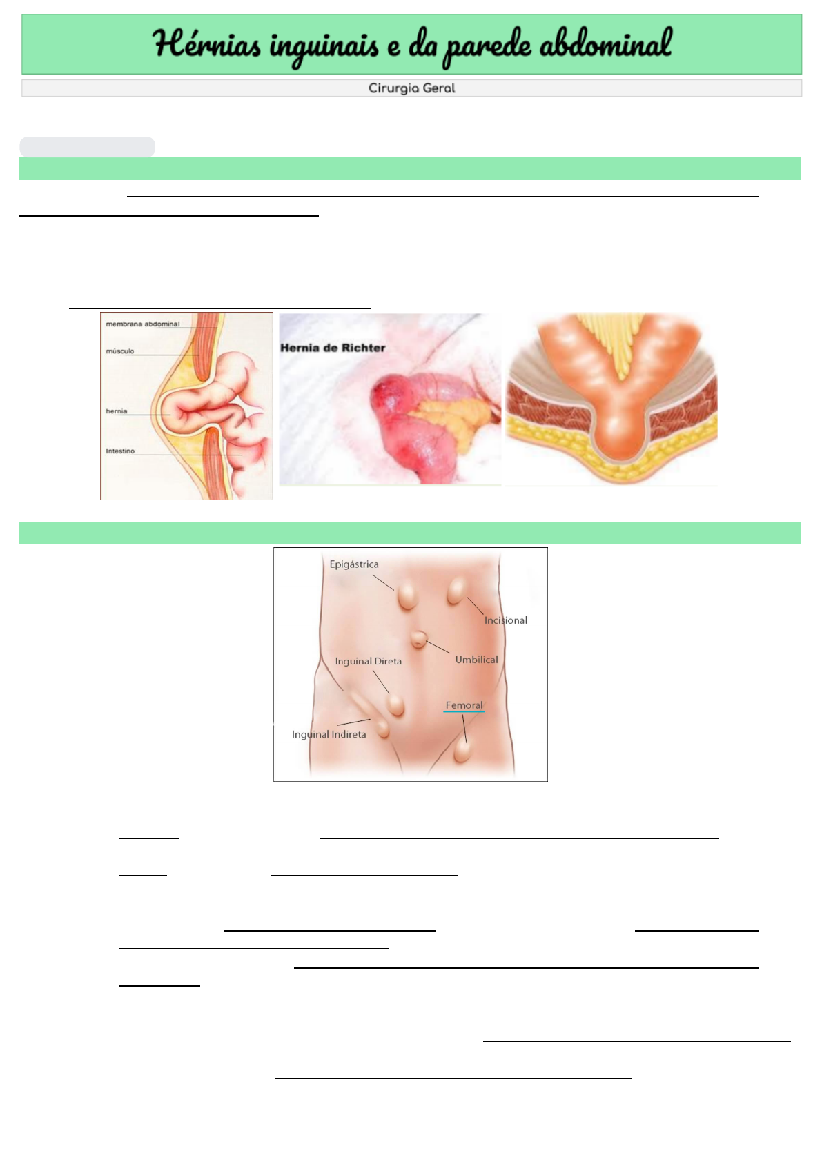 Medicina - 6º Semestre - Ana Paula Cuchera e Eduarda Costa Profº Sérgio Schettini 5 de set. de 2023 Definição - Hérnia → é a protrusão de uma estrutura ou víscera, que deixa seu local habitual, através de um orifício natural, congênito ou adquirido OBS! Não é apenas intestino - Hérnia de Richter → sempre que necrosada, cai fezes na cavidade. Paciente pode morrer de septicemia ● Pinçamento da borda da alça intestinal Classificação - LOCAL: 1. Inguinais (80%) ○ Indireta → desce pelo pelo cordão espermático e as vezes chega até o testículo ■ Congênita, comunicação do canal inguinal entre a barriga e o grande lábio. ○ Direta → não desce (sai para fora do músculo) ○ Há mais em homens 2. Crurais (femorais) ○ Espaço entre veia, artéria e nervo femoral, a artéria e veia tem uma bainha fica uma passagem onde uma víscera entrar e para na região crural ○ Hérnia que causa mais estrangulamento, 20 min depois o intestino costuma já está necrosado ○ Mais comum emmulher por causa da bacia mais larga 3. Umbilicais ○ Saliência na região do umbigo, que geralmente fica maior ao fazer esforços abdominais 4. Diafragmática ○ Ocorrem através de aberturas naturais ou adquiridas no diafragma ○ Hérnia de Bochdalek → congênita (geralmente intestino e estômago) 5. Paramedianas ou de Spiegel (entre a borda da linha semilunar e a do reto abdominal) 1 ○ Protrusão de um saco peritoneal ou gordura pré-peritoneal, por um defeito na aponeurose do transverso abdominal, entre a linha semilunar e a borda lateral do reto abdominal 6. Epigástricas ○ É assintomática ○ Notando-se apenas um inchaço na região acima do umbigo ○ Geralmente é apenas gordura 7. Lombares de Grynfeltt ou de Petit. ○ Espaço de Grynfelt ou triângulo lombar superior ○ Espaço de Petit ou triângulo lombar inferior 8. Obturadoras ○ Forame obturador é um orifício estreito cercado em parte pelo osso púbico e pela base do osso do quadril. ○ Quando parte da parede abdominal empurra através do forame obturador, é chamada de hérnia obturadora. 9. Perineais ○ Após prostatectomia ou amputação do reto ○ Pode ocorrer ainda em idosas grandes multíparas. ○ São muito raras 10. Hérnias internas paraduodenais, paracecais e transmesenteriais ○ Achado cirúrgico em obstrução intestinal 11. Hérnias internas pós-operatórias ○ Brecha no mesentério, quando não fechada corretamente 12. Hérnias incisionais ou ventrais ○ É um problema que surge em alguns pacientes após um procedimento cirurgico - ETIOLOGIA: congênitas, adquiridas e pós-operatórias (Incisional, hérnia interna pós-operatória) - REDUTIBILIDADE: redutíveis, encarceradas, estranguladas - EVOLUÇÃO: simples ou complicadas 2 - CONTEÚDO: hérnias do intestino delgado, hérnias do intestino grosso, hérnias da bexiga, apêndice cecal (Amyand), Divertículo de Meckel ( Littré) por pinçamento lateral (RICHTER), por deslizamento do colo ou da bexiga. - Hérnias muito raras: ● Lombares superiores pelo triângulo de Grynfeltt (12ª costela, oblíquo interno e músculo quadrado lombar) ● Lombar inferior ou triângulo de Petit: Crista ilíaca, grande dorsal e oblíquo externo. ● Interparietal: exemplo é a de Spiegel ● Obturatória: Pelo forame obturatório ● Perineais OBS! Nem toda hérnia dói, apenas quando encarcera e gera isquemia das vísceras Bases Embriológicas - Gônada primitiva desce até a bolsa escrotal → quando ela desce ela arrasta o peritônio primitivo e isso forma o canal inguinal - A descida do testículo direito é mais lenta em relação ao lado esquerdo fazendo com que as Hérnias inguinais sejammais comuns á Direita 3 - Hérnias inguinais congênitas (indiretas) ● Como o ovário não desce ao grande lábio, a persistência do conduto peritonio vaginal é 10 vezes mais comum no sexo masculino. ● As hérnias indiretas congênitas são 10 vezes mais comuns emmeninos. ● Na menina o conteúdo presente no saco herniário no grande lábio é o ovário OBS! Hidrocele Comunicante → unilateral - quando a criança fica em pé ele enche, quando ele deita fica vazio (opera sempre pois pode gerar uma hérnia) - Hidrocele não comunicante → é bilateral e regride até o final do primeiro ano Bases Anatômicas (SABER) 1- Espinha ilíaca ântero-superior 2- Ligamento inguinal (Poupart) 3- Pube 4 4- Ligamento Pectíneo (Cooper) 5- Ligamento lacunar (Gimbernat) → forma o triângulo da imagem 6- Acetábulo 7- Forame obturatório 8- Ísquio 9- Espinha Isquiática → nervo passa aqui 10- Crista Ilíaca OBS! Hiato femoral → é o buraco onde ocorre a hérnia femoral - Na mulher é maior porque a bacia é mais larga - NAV → passa de fora para dentro = Nervo, Artéria e Veia 5 OBS! Abaixo da linha Arqueada de Douglas a aponeurose que forra a cavidade abdominal é formada apenas pela fáscia Transversalis 6 - Trígono de Hesselbach: protusão das hérnia inguinais diretas ● Superolateral: Vasos epigástricos inferiores ● Medial: Bainha do reto abdominal ● Inferior: Ligamento Inguinal OBS!Músculo iliopsoas faz adução - Buraco na fáscia transversalis: anulo profundo, estruturas que descem e formam o funículo espermáticos (artéria, veias) - CANAL INGUINAL: ● 2 a 4 cm acima do lig inguinal ● Estende-se do anel inguinal interno ao anel inguinal externo (~ 4 cm de comprimento) 7 ● Conteúdo: ○ Homem - cordão espermático; ○ Mulher - ligamento redondo; Hérnias - Fatores de risco: ● Envelhecimento ● Hábitos de vida ● Sexo masculino ● Dieta inadequada ● Deficiência de vitamina C → faz um colágeno mais fraco - Fatores de risco: hérnias no adulto ● Obstipação: não confirmado ● Tabagismo: 6,4% ● Atividade esportiva moderada: reduz o risco ● Esforço elevado (levantamento de peso): 93,6% ● DPOC: 1,9% ● História Familiar: 9,4% - Síndrome de Ehler Danlos: fragilidade do conjuntivo com hipermobilidade articular (mulh