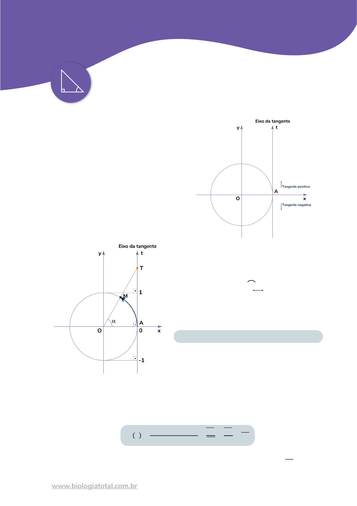 1www.biologiatotal.com.br CICLO TRIGONOMÉTRICO II TANGENTE Na geometria dizemos que uma reta é tangente à uma circunferência quando ela intersecta a circunferência em apenas um ponto. Essa definição se estende para a trigonometria, pois o eixo da tangente é o eixo que intersecta a circunferência trigonométrica somente no ponto A (1,0). Nesse ponto o arco tem medida zero radianos e, portanto, o valor da tangente no ponto A é zero. Acima do ponto A os valores da tangente são positivos e abaixo desse ponto os valores da tangente são negativos. Para ilustrarmos a tangente no ciclo trigonométrico, considere o ponto O(0,0) o centro da circunferência, A o ponto com coordenadas (1,0), M um ponto qualquer do primeiro quadrante e o arco formado por esses dois pontos. A reta 𝑂𝑀 é a reta que passa pelo ponto O e pelo ponto M, formando um ângulo α com o eixo horizontal e intersectando o eixo da tangente no ponto T. Definimos que: A tangente do ângulo α é a ordenada do ponto T. Em outras palavras, para obter o valor da tangente de um ângulo descrito no ciclo trigonométrico, basta projetá-lo no eixo da tangente. Vamos entender porque isso ocorre: Observe na imagem anterior que o triângulo formado pelos pontos O, A e T é um triângulo retângulo, com ângulo reto Â. Portanto podemos aplicar a definição da tangente no triângulo e obtemos: 𝑡𝑔 𝛼 = 𝑐𝑎𝑡𝑒𝑡𝑜 𝑜𝑝𝑜𝑠𝑡𝑜 𝑐𝑎𝑡𝑒𝑡𝑜 𝑎𝑑𝑗𝑎𝑐𝑒𝑛𝑡𝑒 = 𝐴𝑇 𝑂𝐴 = 𝐴𝑇 1 = 𝐴𝑇 Ou seja, a tangente do ângulo α é igual ao tamanho do segmento de reta 𝐴𝑇 . AM 2 Ci cl o Tr ig on om ét ric o II Observação: f A demonstração é análoga para os demais quadrantes, é possível concluir, portanto, que a definição de tangente vale para qualquer ângulo! Exemplo: Encontre a tangente do ângulo de 𝜋 4 𝑟𝑎𝑑𝑖𝑎𝑛𝑜𝑠 45° � . Solução: Para encontrarmos a tangente de 𝜋 4 𝑟𝑎𝑑𝑖𝑎𝑛𝑜𝑠 45° �, encontramos na circunferência o ponto B associado ao arco de 𝜋4 𝑟𝑎𝑑𝑖𝑎𝑛𝑜𝑠 45° �e traçamos a reta 𝑂𝐵 , que passa pelo centro da circunferência e pelo ponto B. Perceba que a reta 𝑂𝐵 intersecta o eixo da tangente em 1. Portanto dizemos que a tg 𝜋4 =1. Tangente Indefinida Conforme aumentamos o arco no primeiro quadrante, o valor da tangente vai aumentando até que a sua projeção sobre o eixo da tangente não exista mais, isso acontece quando as extremidades dos arcos estão exatamente sob o eixo das ordenadas. Para encontrar o valor da tangente desses arcos deveríamos traçar a reta que passa pela extremidade do arco e pelo centro da circunferência, mas essa reta coincidiria com o eixo das ordenadas, e como esses dois eixos são paralelos, não encontraríamos nenhum ponto de interseção. Portanto, para esses arcos dizemos que não existe valor de tangente. Na primeira volta isso ocorre para os arcos de 𝜋 2 𝑟𝑎𝑑𝑖𝑎𝑛𝑜𝑠 radianos e 3𝜋 2 𝑟𝑎𝑑𝑖𝑎𝑛𝑜s radianos. Outra forma de pensarmos nesses casos envolve o entendimento da tangente como uma razão trigonométrica do seno pelo cosseno. Os cossenos de 𝜋2 𝑟𝑎𝑑𝑖𝑎𝑛𝑜𝑠 radianos e 3𝜋 2 𝑟𝑎𝑑𝑖𝑎𝑛𝑜s radianos valem zero. E dividir por zero é uma indeterminação matemática. Portanto: A tangente não é definida para ângulos cujo cosseno vale zero. Sinal da tangente Você deve ter percebido que no primeiro quadrante os valores da tangente são sempre positivos. Porém seguindo para o segundo quadrante passamos a ter arcos cuja tangente é negativa. Isso ocorre porque a reta que passa pela extremidade do arco e pelo centro da circunferência intersecta o eixo da tangente na parte negativa. Note que o mesmo acontece para os arcos que possuem extremidade no quarto quadrante. Portanto: 3www.biologiatotal.com.br Ci cl o Tr ig on om ét ric o IIA tangente será negativa para todos os arcos do segundo e do quarto quadrantes. E no terceiro quadrante o que acontece? A reta que passa pelo centro da circunferência e pela extremidade de um arco do terceiro quadrante tocará o eixo da tangente onde seus valores são positivos, exatamente como um arco do primeiro quadrante. Resumindo: a tangente será positiva para arcos do 1° e 3° quadrantes e negativa para arcos do 2° e 4 quadrantes. Como ilustra a figura a seguir: 4 Ci cl o Tr ig on om ét ric o II RAZÕES TRIGONOMÉTRICAS INVERSAS Agora que já conhecemos as razões trigonométricas seno, cosseno e a tangente, estamos prontos para o próximo passo: conhecer as razões trigonométricas inversas. Elas são chamadas de secante, cossecante e cotangente, e recebem a notação de sec (𝛼), cossec(𝛼) e cotg(𝛼), sendo 𝛼 um ângulo qualquer. Secante, Cossecante e Cotangente no Triângulo Retângulo No estudo das razões trigonométricas no triângulo retângulo definimos o cosseno como a razão entre o cateto adjacente e a hipotenusa, o seno como a razão entre o cateto oposto e a hipotenusa e a tangente como a razão entre o cateto oposto e o cateto adjacente. As razões trigonométricas inversas também podem ser definidas no triângulo retângulo, como veremos a seguir. A razão trigonométrica inversa do cosseno é chamada de secante e a definimos como a razão entre a hipotenusa e o cateto adjacente. Já a razão inversa do seno é chamada de cossecante, e definida pela razão entre a hipotenusa e o cateto oposto e a inversa da tangente é chamada de cotangente e é a razão entre o cateto adjacente e o cateto oposto. sec (𝛼) = ℎ𝑖𝑝𝑜𝑡𝑒𝑛𝑢𝑠𝑎 𝑐𝑎𝑡𝑒𝑡𝑜 𝑎𝑑𝑗𝑎𝑐𝑒𝑛𝑡𝑒 = 𝑎 𝑐 cossec (𝛼) = ℎ𝑖𝑝𝑜𝑡𝑒𝑛𝑢𝑠𝑎 𝑐𝑎𝑡𝑒𝑡𝑜 𝑜𝑝𝑜𝑠𝑡𝑜 = 𝑎 𝑏 cotg (𝛼) = 𝑐𝑎𝑡𝑒𝑡𝑜 𝑎𝑑𝑗𝑎𝑐𝑒𝑛𝑡𝑒 𝑐𝑎𝑡𝑒𝑡𝑜 𝑜𝑝𝑜𝑠