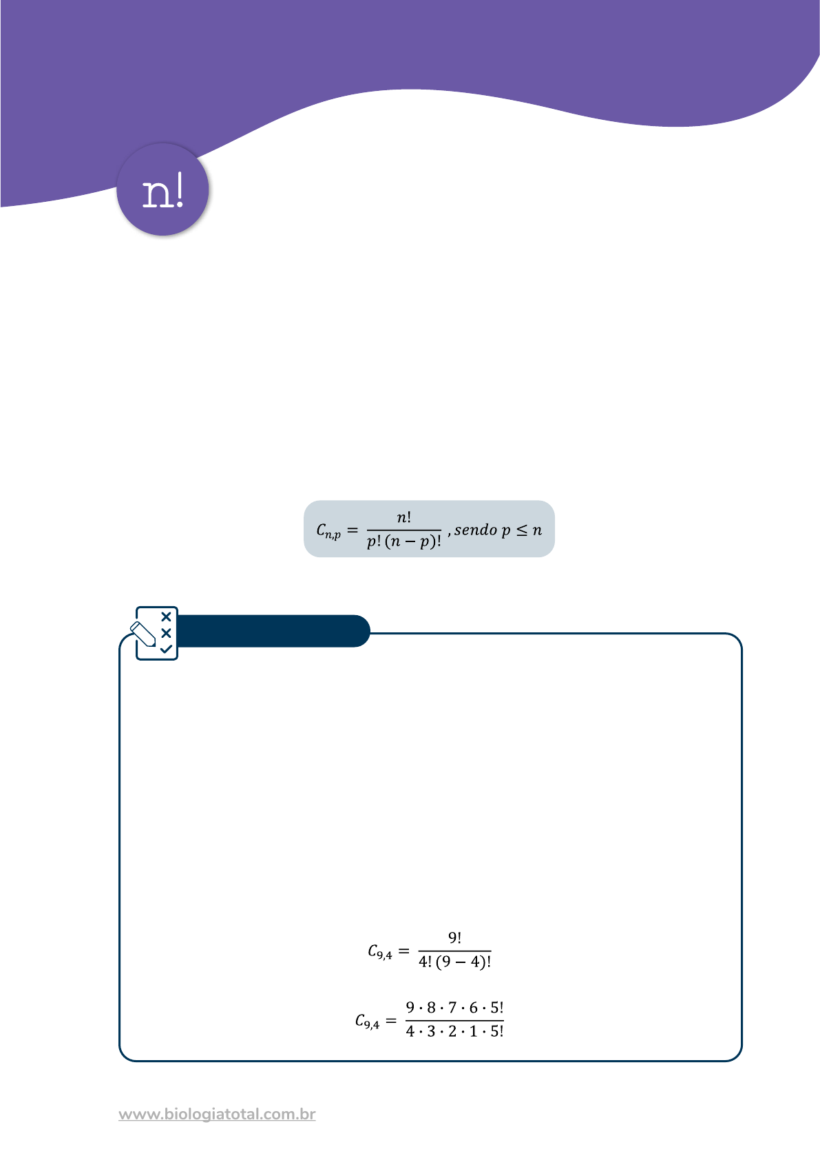 1www.biologiatotal.com.br COMBINAÇÃO E ARRANJO COMBINAÇÕES Chamam-se combinações simples todos os subconjuntos de p elementos que podemos formar com 𝑛 elementos distintos, sendo 𝑝≤𝑛. As combinações são subconjuntos que se caracterizam pela natureza dos elementos, ou seja, a ordem não é importante. A notação para o número de combinação simples de 𝑛 elementos tomados de 𝑝 a 𝑝 é: 𝐶𝑛, 𝑝 Assim, para calcularmos o número de combinações, utilizamos a seguinte expressão: Uma escola tem 9 professores de Matemática, e para um congresso precisa enviar 4 deles para representar a escola. Quantos grupos de 4 professores são possíveis? Resolução: Observe que neste caso não importa o ordem dos professores, pois invertendo a ordem dos professores não vai alterar o grupo. Os grupos irão se distinguir sempre que houver pelo menos uma pessoa diferente. Ou seja, neste caso interessa somente a natureza dos elementos. O total de professores é 9, então o número de elementos 𝑛 é 9, assim como queremos formar grupos de 4 professores o 𝑝 é 4. Aplicando na fórmula, temos: EXERCÍCIO RESOLVIDO 2 Co m bi na çã o e A rr an jo Simplificando a combinação, obtemos: grupos possíveis. ARRANJOS Chamam-se arranjos simples todos os agrupamentos simples de 𝑝 elementos que podemos formar com 𝑛 elementos distintos, sendo 𝑝≤𝑛. Cada um desses agrupamentos se diferencia pela ordem ou natureza de seus elementos. A notação para o número de arranjos simples de 𝑛 elementos tomados 𝑝 a 𝑝 é: 𝐴𝑛, 𝑝 Assim, para calcularmos o número de arranjos, utilizamos a seguinte expressão: a) Em um prova de atletismo 8 corredores disputam as 3 primeiras posições. De quantas maneiras possíveis o pódio pode ser formado? Resolução: Antes de aplicar a fórmula, vamos analisar as possibilidades para cada posição do pódio. Para o 1º lugar, os 8 corredores estão disputando a posição. Para o 2º lugar teremos 7 corredores já que um deles terá chegado em primeiro, assim como para o 3º lugar terá restado 6 corredores porque os dois primeiros lugares já foram ocupados. Assim podemos dizer que: possibilidades Note que tanto a ordem como a natureza é importante para a resolução. EXERCÍCIO RESOLVIDO 3www.biologiatotal.com.br Co m bi na çã o e A rr an jo Aplicando a fórmula, temos: Realizando a simplificação dos fatoriais: possibilidades b) Duas pessoas entram num ônibus que tem 7 lugares vagos. De quantas maneiras diferentes as 2 pessoas podem ocupar esses lugares? Resolução: Observe que temos uma questão em que tanto a natureza quanto a ordem importam, pois temos mais lugares do que pessoas para sentar e em dois lugares as duas pessoas podem se alternar. Dessa forma, muda-se tanto a natureza quanto a ordem dos elementos. Sabendo disso, temos um arranjo, portanto aplicando na fórmula, em que 𝑛 representa o número de lugares vagos e 𝑝 representa as pessoas que ocuparão os lugares, obtemos: Fazendo a simplificação dos fatoriais: maneiras distintas.