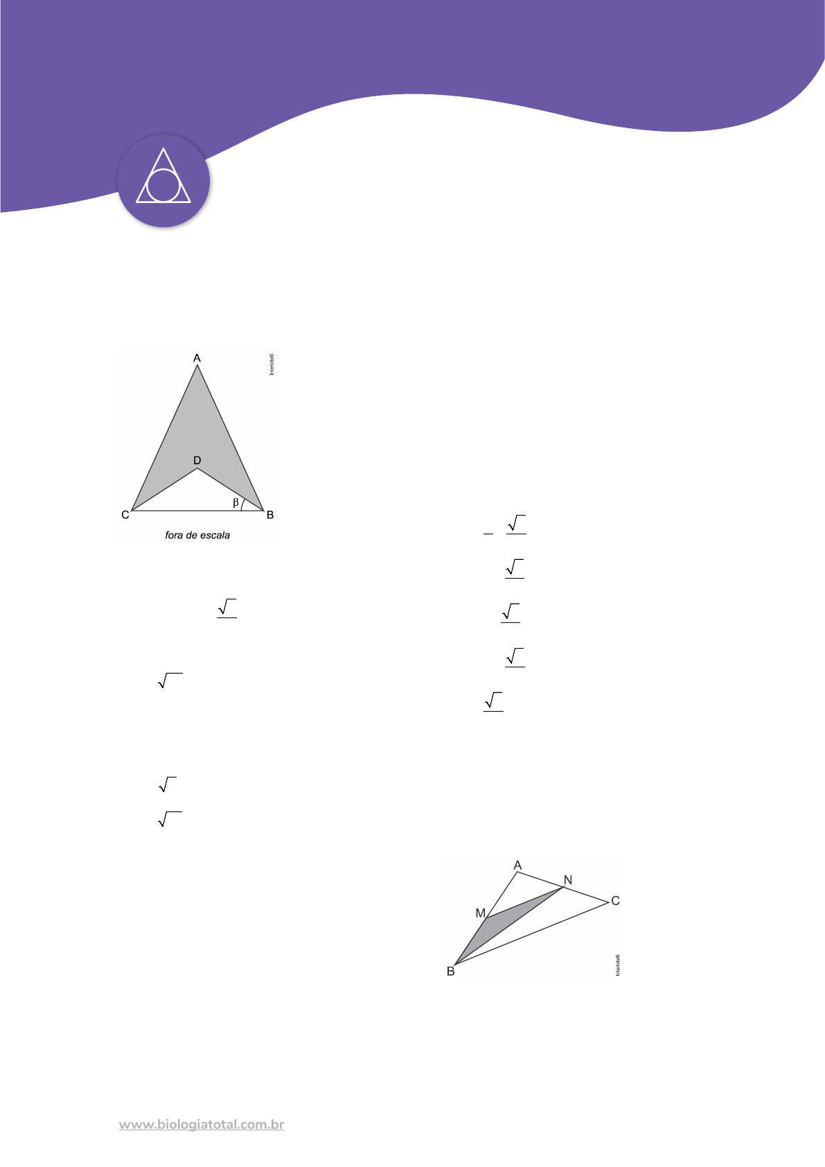 1www.biologiatotal.com.br CIRCUNFERÊNCIA, ÁREAS E POLÍGONOS REGULARES 1. (FAMEMA 2020) O triângulo ABC é isósceles com AB AC 4 cm,= = e o triângulo DBC é isósceles com DB DC 2 cm,= = conforme a figura. Seja β a medida do ângulo interno ˆDBC do triângulo DBC. Sabendo-se que 6sen ( ) , 4 β = a área, em 2cm , do quadrilátero ABDC é a. 35 b. 6 c. 4 d. 5 e. 15 2. (UECE 2019) Se a distância entre os centros de duas circunferências cujas medidas dos raios são respectivamente 6 m e 8 m é igual a 10 m, então, a medida, em metros, do comprimento da corda comum às duas circunferências é a. 9,4. b. 9,8. c. 9,2. d. 9,6. 3. (ESPCEX (AMAN) 2019) Considere uma circunferência de centro O e raio 1cm tangente a uma reta r no ponto Q. A medida do ângulo ˆMOQ é 30 ,° onde M é um ponto da circunferência. Sendo P o ponto da reta r tal que PM é paralelo a OQ, a área (em 2cm ) do trapézio OMPQ é a. 1 3 . 2 8 − b. 32 . 2 − c. 31 . 2 + d. 32 . 8 − e. 3 . 2 4. (UNICAMP 2019) No triângulo ABC exibido na figura a seguir, M é o ponto médio do lado AB, e N é o ponto médio do lado AC. Se a área do triângulo MBN é igual a t, então a área do triângulo ABC é igual a a. 3t. 2 Ex er cí ci os A pr of un da do s: C irc un fe rê nc ia , Á re as e P ol íg on os R eg ul ar es b. 2 3t. c. 4t. d. 3 2t. 5. (UFMS 2019) Para o projeto de reforma de uma casa, foi planejada a troca do piso da cozinha. Foi escolhido um modelo de piso representado pela Figura 1. No momento de assentar o piso, unindo quatro peças e invertendo a posição de três delas, obtém-se a Figura 2. Os lados da Figura 1 medem 2 cm cada. A estampa do piso é formada por arcos de circunferência, com centros nos pontos E, C e F, de tal forma que BE EC= e DF FC.= Quanto mede a área escura da Figura 2? a. 26 cm .π− b. 220 2 cm .π− c. 24 8 cm .π − d. 22 cm .π − e. 224 4 cm .π− 6. (UECE 2019) Considere o quadrado MNPQ, cuja medida do lado é igual a 5 cm. No interior desse quadrado, está o triângulo equilátero MJL, onde os vértices J e L estão respectivamente sobre os lados NP e PQ do quadrado. Nessas condições, pode-se afirmar corretamente que a medida, em 2cm , da área limitada pelo triângulo MJL é igual a a. 50 50 3.− + b. 25 25 3.+ c. 25 25 3.− + d. 75 50 3.− + 7. (IME 2019) Em um setor circular de 45 ,° limitado pelos raios OA e OB iguais a R, inscreve-se um quadrado MNPQ, onde MN está apoiado em OA e o ponto Q sobre o raio OB. Então, o perímetro do quadrado é: a. 4R b. 2R c. 2R 2 d. 4R 5 e. 54R 5 8. (EEAR 2019) O segmento AT é tangente, em T, à circunferência de centro O e raio R 8 cm.= A potência de A em relação à circunferência é igual a ______ 2cm . 3www.biologiatotal.com.br Ex er cí ci os A pr of un da do s: C irc un fe rê nc ia , Á re as e P ol íg on os R eg ul ar esa. 16 b. 64 c. 192 d. 256 9. (UPF 2018) Na figura abaixo, está representado um triângulo retângulo em que os vértices A e B pertencem ao gráfico da função f, definida por xf(x) 2 2.−= − Como indica a figura, a abscissa do ponto B é 1, a ordenada do ponto A é 2 e os pontos A e C têm a mesma abscissa. A medida da área do triângulo ABC é a. 21 2 b. 3 2 c. 6 d. 12 e. 21 4 10. (ESPCEX (AMAN) 2018) A curva do gráfico abaixo representa a função 4y log x= A área do retângulo ABCD é a. 12. b. 6. c. 3. d. 4 36log . 2 e. 4log 6. 11. (UEM 2018) Considerando um retângulo ABCD, assinale o que for correto. 01. Quaisquer que sejam P e Q pontos do segmento AB, os triângulos CDP e CDQ possuem a mesma área. 02. Quaisquer que sejam P e Q pontos do segmento AB, os triângulos CDP e CDQ possuem o mesmo perímetro. 04. Quaisquer que sejam P e Q pontos do segmento AB, os triângulos PQC e PQD possuem a mesma área. 08. Se o perímetro de ABCD é de 8 cm, então sua área não supera 24 cm . 16. Se a área de ABCD é de 28 cm , então seu perímetro não supera 16 cm. 12. (ESPM 2018) O quadrado e o retângulo da figura abaixo foram montados com as mesmas 4 peças. A medida x é igual a: http://www.biologiatotal.com.br 4 Ex er cí ci os A pr of un da do s: C irc un fe rê nc ia , Á re as e P ol íg on os R eg ul ar es a. 2 5 1− b. 5 1− c. 5 1+ d. 3 5 2− e. 3 5 2 13. (UERJ 2018) Considere na imagem abaixo: - os quadrados ACFG e ABHI, cujas áreas medem, respectivamente, 1S e 2S ; - o triângulo retângulo ABC; - o trapézio retângulo BCDE, construído sobre a hipotenusa BC, que contém o ponto X. Sabendo que CD CX= e BE BX,= a área do trapézio BCDE é igual a: a. 1 2S S 2 + b. 1 2S S 3 + c. 1 2S S d. 2 21 2(S ) (S )+ 14. (FAMEMA 2018) Considere o quadrado ABCD, de lado 4 cm, e o retângulo EFGH, com EF 2 cm, CF 1cm= = e os pontos B, G, C e F alinhados, conforme mostra a figura. Sabendo que G é ponto médio do lado BC, que o ponto K pertence ao lado HE e que os pontos A, K e F estão alinhados, a área do quadrilátero FGHK é a. 23,5 cm . b. 24,0 cm . c. 24,5 cm . d. 23,0 cm . e. 22,5 cm . 15. (ITA 2018) Os lados de um triângulo de vértices A, B e C medem AB 3 cm, BC 7 cm= = e CA 8 cm.= A circunferência inscrita no triângulo tangencia o lado AB no ponto N e o lado CA no ponto K. Então, o comprimento do segmento NK, em cm, é a. 2. b. 2 2. c. 3. d. 2 3. e. 7 . 2 16. (ITA 2018) Em um triângulo de vértices A, B e C são dados ˆB̂ , C 2 3 π π = = e o lado BC 1cm.= Se o lado AB é o diâmetro de uma circunferência, então a área da parte 5www.biologiatotal.com.br Ex er cí ci os A pr of un da do s: C irc un fe rê nc ia , Á re as e P ol íg on os R eg ul ar esdo triângulo ABC externa à circunferência, em 2cm , é a. 3 3 . 8 16 π − b. 5 3 . 4 2 π − c. 5 3 3 . 8 4 π − d. 5 3 . 16 8 π − e. 5 3 3 . 8 16 π − 17. (EPCAR (AFA) 2017) No plano cartesiano abaixo estão representados o gráfico da função real f definida por 2f(x) x x 2= − − + e o polígono ABCDE. Considere que: - o ponto C é vértice da função f. - os pontos B e D possuem ordenadas iguais.