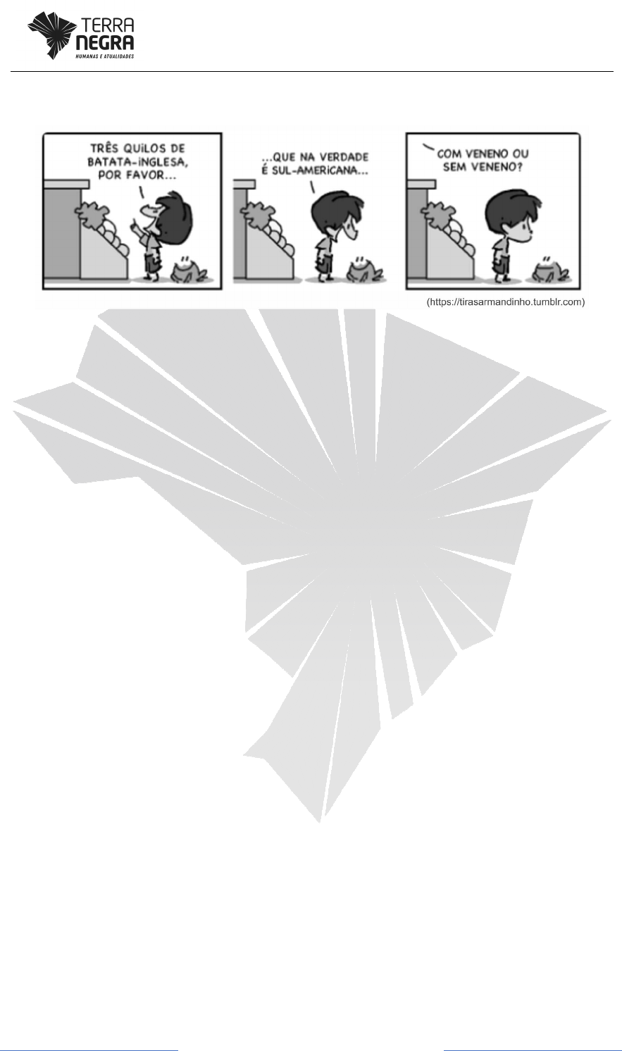 Página 1 www.terranegra.online 01. (Unesp 2018) Examine a tira Armandinho, do cartunista Alexandre Beck. A situação enfrentada pelo personagem faz alusão a) ao uso indiscriminado de agrotóxicos no processo tradicional de produção agrícola. b) ao precário monitoramento de resíduos de agrotóxicos em alimentos nos EUA e na União Europeia. c) ao protecionismo dos países centrais em relação aos produtos cultivados nos países periféricos. d) aos limites técnicos da agricultura familiar na produção de alimentos in natura. e) ao descumprimento das normas de cultivo orgânico propostas pela Revolução Verde. 02. (Unioeste 2017) “O estudo da agricultura brasileira deve ser feito no bojo da compreensão dos processos de desenvolvimento do modo capitalista de produção do território brasileiro. [...]. Esse processo deve ser entendido também no interior da economia capitalista atualmente internacionalizada, que produz e se reproduz em diferentes lugares do mundo, criando processos e relações de interdependência entre Estados, nações e sobretudo empresas” OLIVEIRA, A. U. de. Agricultura brasileira: transformações recentes. In__: ROSS, J. L. S. Geografia do Brasil. São Paulo: Edusp, 2003, p. 467-534. Considere a informação acima e assinale a alternativa INCORRETA. a) A evolução da agricultura capitalista ocorreu após a Revolução Industrial e o crescimento da população urbana e da população total global, o que demandou maior quantidade de produtos agrícolas. O aumento da produtividade, sem necessariamente ampliar a área de cultivo, foi possível devido à Revolução Agrícola. b) A Revolução Verde configurou-se como um pacote tecnológico com novas técnicas de cultivo, equipamentos para mecanização, fertilizantes, defensivos agrícolas e sementes selecionadas. Foi concebida pelos Estados Unidos da América e, por isso, ao ser implementada em outros países, trouxe uma série de problemas ambientais e inadequações quanto ao tipo de solo e clima. c) A Revolução Verde foi uma forma de expansão da indústria americana sobre países subdesenvolvidos, que passaram a ser dependentes de implementos agrícolas, sementes e defensivos. Todavia, isso não contribuiu para o aumento da produção agrícola e não influenciou a concentração fundiária dos países receptores desse pacote tecnológico. d) O processo de urbanização exerce pressão sobre os recursos naturais, pois as pessoas que residem nas cidades não produzem seus alimentos, os quais são Página 2 www.terranegra.online provenientes das áreas rurais. A produção em massa na área rural, sem manejo do solo ou uso de técnicas adequadas, por sua vez, resulta em problemas ambientais tais como erosão, assoreamento, eutrofização e salinização. e) Se o agronegócio (ou agrobusiness) no Brasil, por um lado, eleva a produtividade agrícola, gera superavit nas exportações e é responsável por cerca de 25% do PIB, por outro, pressiona a questão agrária, aumenta a monocultura e a concentração da propriedade rural além de deixar muitos trabalhadores rurais sem terra e sem condições para prover sua permanência na área rural. 03. (Uepa 2012) O capitalismo, em sua crescente penetração no mundo rural mediante modos de produção que se desenvolvem por meio da demanda de mercado externo (exportações), tem capitalizado cada vez mais a renda da terra. Os efeitos mais marcantes têm sido a geração ou aprofundamento da desigualdade social, evidenciando uma forma de violência, e a diferenciação quanto aos lucros oriundos da exploração da terra. Neste contexto, é verdadeiro afirmar que: a) os pequenos agricultores brasileiros constituem uma exceção no contexto rural do mundo, pois têm facilidade de inserção no mercado moderno, face às aplicações de políticas públicas que favorecem a aquisição de maquinário e estímulos financeiros que induzem à modernização agrícola e uma nova forma de apropriação do espaço agrícola. b) na maioria dos países latino-americanos a modernização da agricultura segue os moldes capitalistas e tende a beneficiar apenas determinados produtos e produtores. Com a modernização ocorre a chamada “industrialização da agricultura”, tornando-a uma atividade nitidamente empresarial, com fortalecimento das cooperativas agrícolas que administram grande parte dessas empresas. c) no mundo rural dos países capitalistas tecnologicamente desenvolvidos, o uso de novas técnicas e equipamentos modernos, faz com que o produtor dependa cada vez menos da “generosidade” da natureza, adaptando-a mais facilmente, de acordo com seus interesses. Tal fato aumentou percentualmente a produção agrícola, eliminando desses países a pobreza alimentar, a exemplo de que ocorreu na Índia nos últimos anos. d) o processo de capitalização do campo tem provocado gradualmente a mercantilização da vida social no campo, pois, de forma lenta, a autonomia que a agricultura (atividades agrícolas) até então tinha, tem sido levada a atender a uma subordinação de novos interesses, formas de vida e de consumo típicos de áreas urbanas. e) a revolução verde, presente na chamada agricultura modernizada no espaço rural capitalista, modelo baseado no uso intensivo de agrotóxicos e fertilizantes sintéticos na agricultura, tem evitado o aumento da concentração da terra e a exploração da mão de obra no campo. Página 3 www.terranegra.online Gabarito: 01. A A alternativa [A] está correta porque a referência ao veneno no produto remete à ideia do uso excessivo de agrotóxico na produção agrícola. As alternativas incorretas são: [B], [C] e [D], porque a tira critica o uso do agrotóxico e não o precário monitoramento, o protecionismo, os limites técnicos; [E], porque a tira não indica o produto como cultivo orgânico. 02. C A alternativa [C] está incorreta porque a Revolução Verde resultou em aumento da produtividade e da produção agríc