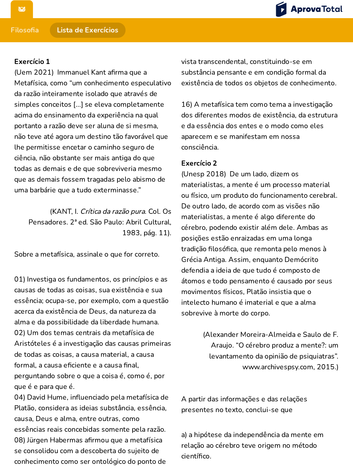 https://aprovatotal.com.br/medio/filosofia/exercicios/areas-da-filosofia/ex.1-metafisica?dificuldade=random&tentativa=ultima&respostas=todas 1/5 Filoso�a Lista de Exercícios Exercício 1 (Uem 2021) Immanuel Kant a�rma que a Metafísica, como “um conhecimento especulativo da razão inteiramente isolado que através de simples conceitos [...] se eleva completamente acima do ensinamento da experiência na qual portanto a razão deve ser aluna de si mesma, não teve até agora um destino tão favorável que lhe permitisse encetar o caminho seguro de ciência, não obstante ser mais antiga do que todas as demais e de que sobreviveria mesmo que as demais fossem tragadas pelo abismo de uma barbárie que a tudo exterminasse.” (KANT, I. Crítica da razão pura. Col. Os Pensadores. 2ª ed. São Paulo: Abril Cultural, 1983, pág. 11). Sobre a metafísica, assinale o que for correto. 01) Investiga os fundamentos, os princípios e as causas de todas as coisas, sua existência e sua essência; ocupa-se, por exemplo, com a questão acerca da existência de Deus, da natureza da alma e da possibilidade da liberdade humana. 02) Um dos temas centrais da metafísica de Aristóteles é a investigação das causas primeiras de todas as coisas, a causa material, a causa formal, a causa e�ciente e a causa �nal, perguntando sobre o que a coisa é, como é, por que é e para que é. 04) David Hume, in�uenciado pela metafísica de Platão, considera as ideias substância, essência, causa, Deus e alma, entre outras, como essências reais concebidas somente pela razão. 08) Jürgen Habermas a�rmou que a metafísica se consolidou com a descoberta do sujeito de conhecimento como ser ontológico do ponto de vista transcendental, constituindo-se em substância pensante e em condição formal da existência de todos os objetos de conhecimento. 16) A metafísica tem como tema a investigação dos diferentes modos de existência, da estrutura e da essência dos entes e o modo como eles aparecem e se manifestam em nossa consciência. Exercício 2 (Unesp 2018) De um lado, dizem os materialistas, a mente é um processo material ou físico, um produto do funcionamento cerebral. De outro lado, de acordo com as visões não materialistas, a mente é algo diferente do cérebro, podendo existir além dele. Ambas as posições estão enraizadas em uma longa tradição �losó�ca, que remonta pelo menos à Grécia Antiga. Assim, enquanto Demócrito defendia a ideia de que tudo é composto de átomos e todo pensamento é causado por seus movimentos físicos, Platão insistia que o intelecto humano é imaterial e que a alma sobrevive à morte do corpo. (Alexander Moreira-Almeida e Saulo de F. Araujo. “O cérebro produz a mente?: um levantamento da opinião de psiquiatras”. www.archivespsy.com, 2015.) A partir das informações e das relações presentes no texto, conclui-se que a) a hipótese da independência da mente em relação ao cérebro teve origem no método cientí�co. https://aprovatotal.com.br/medio/filosofia/exercicios/areas-da-filosofia/ex.1-metafisica?dificuldade=random&tentativa=ultima&respostas=todas 2/5 b) a dualidade entre mente e cérebro foi conceituada por Descartes como separação entre pensamento e extensão. c) o pensamento de Santo Agostinho se baseou em hipóteses empiristas análogas às do materialismo. d) os argumentos materialistas resgatam a metafísica platônica, favorecendo hipóteses de natureza espiritualista. e) o progresso da neurociência estabeleceu provas objetivas para resolver um debate originalmente �losó�co. Exercício 3 (Unesp 2018) Se um estranho chegasse de súbito a este mundo, eu poderia exempli�car seus males mostrando-lhe um hospital cheio de doentes, uma prisão apinhada de malfeitores e endividados, um campo de batalha salpicado de carcaças, uma frota naufragando no oceano, uma nação desfalecendo sob a tirania, fome ou pestilência. Se eu lhe mostrasse uma casa ou um palácio onde não houvesse um único aposento confortável ou aprazível, onde a organização do edifício fosse causa de ruído, confusão, fadiga, obscuridade, e calor e frio extremados, ele com certeza culparia o projeto do edifício. Ao constatar quaisquer inconveniências ou defeitos na construção, ele invariavelmente culparia o arquiteto, sem entrar em maiores considerações. (David Hume. Diálogos sobre a religião natural, 1992. Adaptado.) a) Explicite o tema �losó�co abordado no texto e sua relação com a criação do mundo. b) Explique como os argumentos do �lósofo evidenciam um ponto de vista empirista (fundamentado na experiência) e cético (baseado na dúvida), em contraste com uma concepção metafísica sobre o tema. Exercício 4 (Unesp 2017) Texto 1 É possível perguntar se a felicidade deve ser adquirida pela aprendizagem, pelo hábito ou por alguma espécie de adestramento ou se ela nos é conferida por alguma providência divina. Mesmo que a felicidade não seja dada pelos deuses, mas, ao contrário, venha como um resultado da virtude e de alguma espécie de aprendizagem ou adestramento, ela parece contar-se entre as coisas mais divinas; pois aquilo que constitui o prêmio e a �nalidade da virtude se nos a�gura o que de melhor existe no mundo, algo de divino e abençoado. A resposta à pergunta que estamos fazendo é evidente pela de�nição de felicidade, pois dissemos que ela é uma atividade virtuosa da alma. Aristóteles. Ética a Nicômaco, 1991. Adaptado. Texto 2 De acordo com estudo realizado por cientistas britânicos, nós somos mais felizes quando conseguimos um desempenho melhor do que o esperado diante do dilema risco-recompensa. Imagens escaneadas do cérebro embasaram a pesquisa, mostrando que o prazer é detectado em áreas do órgão ligadas ao bem-estar. Após correlacionar os dados, os pesquisadores chegaram a uma equação matemática. Para construir o modelo matemático, a equipe analisou os resultados de 26 pessoas que r