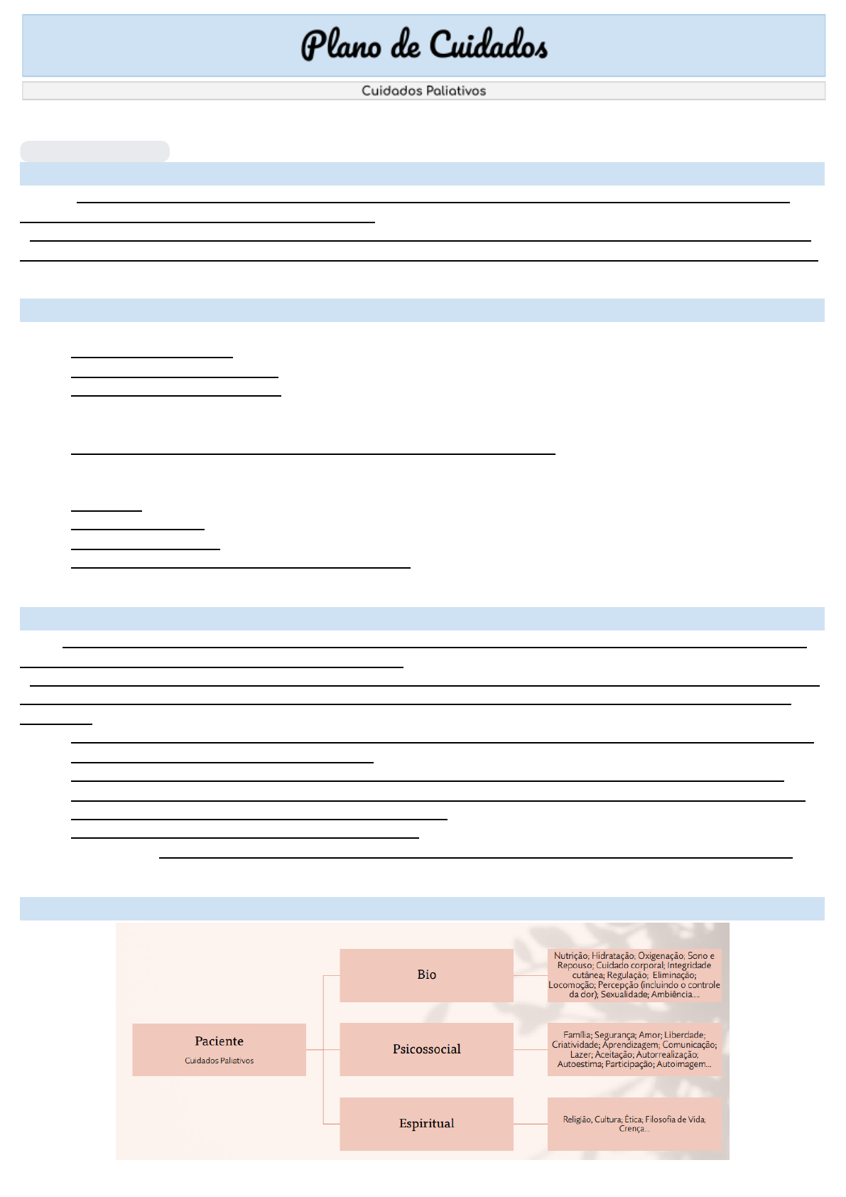Medicina - 6º Semestre - Ana Paula Cuchera e Eduarda Costa Profº Fábio 18 de out. de 2023 Plano de Cuidado/Terapêutico - É um plano com orientações/ intervenções feito com o paciente e/ou família, para o paciente, de acordo com as necessidades diagnosticadas. - Além das intervenções médicas, o paciente será acompanhado por uma equipe multiprofissional a qual será responsável por também prescrever e intervir com vistas na qualidade de vida e bem-estar. Atributos do Profissional - Criar Vínculo de Confiança: ● Fazer contato visual; ● Demonstrar competência; ● Ter disponibilidade e ação. - Comunicação: ● Ouvir muito – Falar pouco – Fazer silêncio e acolher emoções. - Sincronizar: ● Resumir; ● Definir objetivos; ● Alinhar o percurso; ● Registrar o plano de cuidados/ terapêutico. Aspectos Gerais da Criação do Plano - As abordagens devem ser centradas no paciente, considerando sua individualidade e a realidade do ambiente sociocultural em que está inserido. - É importante engajar as pessoas que residem na mesma casa (familiares/cuidadores) nos processos de mudança e evitando a acomodação familiar, e principalmente oferecendo apoio aos familiares também. ● Oferecer uma escuta qualificada, auxiliando o paciente e/ou família a resgatar sua posição de protagonista durante todo o processo; ● Construir uma relação de confiança, explicando sobre o curso da doença e explorando as opções de tratamento (quando houver) e contenção de sintomas, e o seu papel no cuidado e na promoção de sua saúde e qualidade de vida. ● Disponibilizar acompanhamento periódico. OBS! Importante preparar o paciente para a alta - ensinar este a se cuidar quando estiver em casa Elaborar um plano 1 OBS! Dentro dessas dimensões de bio, psico e espiritual tem diversas visões: pensando em nutrição: qual é a nutrição que esse paciente deve ter dentro do plano de cuidado ● Revolucionou esse cuidado numa forma multidimensional ● A regulação pode ser tanto térmica quanto eletrolítica ○ Como por exemplo: “como está a bomba de sódio e potássio do paciente?” ● A eliminação quer dizer por onde o paciente está evacuando ● A ambiência quer dizer que o ambiente em que o paciente está instalado tem que ser familiar, que traga paz ○ Como por exemplo: “paciente não gostou da cor cinza do quarto, disse que deveria ser uma parede com cor mais viva, ou com cor branca para que traga paz” ● A segurança quer dizer a instalação de grade para não cair enquanto está dormindo ● A liberdade quer dizer que o paciente pode ter vontade de sair, ver a rua, ou seja, ele tem o livre arbítrio da escolha, e não queria estar se sentindo preso no quarto OBS! Escutar o paciente e aprender o que está sendo passado por ele - Identificar se o paciente está aceitando ou recusando a doença ● Em caso de não aceitação é bom fazer uma psicoterapia ● Paciente ainda não passou pelo processo de realização pessoal → atraso na aceitação - Se reconhecer diante da situação que ela está passando. Ex: Paciente que tem que amputar - O aspecto espiritual → não fala sobre divindade, apenas o olhar de forma holística as dimensões que cada pessoa vê - Gastrostomia, dispositivo: Bottons → que faz interligação commeio interno e externo ● Quando faz gastrostomia coloca esse botton para não fechar o orifício, pois ele fecha muito rápido - Gastrojejunostomia →mais indicada porque atende via gástrica e jejunal - JJT → jejunostomia - Nutrição parenteral → quando não é possível fazer pelo sistema digestório - Colostomia X Ileostomia: acessos diferentes, pois na ileostomia geralmente tem fezes líquidas e na colostomia mais pastosas, pela absorção de água que ocorre no intestino grosso - Bricker: pedaço de intestino, onde reconstrói bexiga e liga se os ureteres neste, faz se um boton para que a urina tenha escape - Urostomia: para o paciente ter eliminação vesical. Ex: câncer da bexiga - Nefrostomia: boton ligado diretamente no rim - Sonda vesical de demora: quando o canal urinário está preservado e dura em torno de 3 a 4 meses , tem que ser retirada para evitar ITU - Paciente restrito ao leito: restrição em caso de fratura, uso de droga vasoativa, TCE - trauma crânio encefálico, hipotensão postural ● Quando não é esses casos, o paciente tem que deambular (caminhar) ● Hipotensão postural: o paciente precisa sentar por uns 10 min, depois eleva decúbito em 90º e depois vira o paciente e põe pernas para fora do leito ainda sentado, depois levanta o paciente e senta novamente algumas vezes (demora cerca de 30 minutos) 2 - Modelo Calgary → Trata-se de um referencial metodológico que permite analisar a família como um sistema, por meio dos diagnósticos de seus problemas de saúde, recursos para enfrentar os problemas familiares e sociais ● Consegue através de um instrumento validado, avaliar a a família em casos de conflito e resolver o problema, dando recursos de intervenção ● Com isso o profissional consegue ter recursos para intervir que não vai mexer na estrutura familiar. Política Nacional de Práticas Integrativas e Complementares (PNPIC) - As Práticas Integrativas e Complementares em Saúde (PICS) são recursos terapêuticos que buscam a prevenção de doenças e a recuperação da saúde, com ênfase na escuta acolhedora, no desenvolvimento do vínculo terapêutico e na integração do ser humano com omeio ambiente e a sociedade. - Medicina Tradicional Chinesa/Acupuntura, Medicina Antroposófica, Homeopatia, Plantas Medicinais e Fitoterapia, Termalismo Social/Crenoterapia, Arteterapia, Ayurveda, Biodança, Dança Circular, Meditação, Musicoterapia, Naturopatia, Osteopatia, Quiropraxia, Reflexoterapia, Reiki, Shantala, Terapia Comunitária Integrativa, Yoga, Apiterapia, Aromaterapia, Bioenergética, Constelação familiar, Cromoterapia, Geoterapia, Hipnoterapia, Imposição de mã