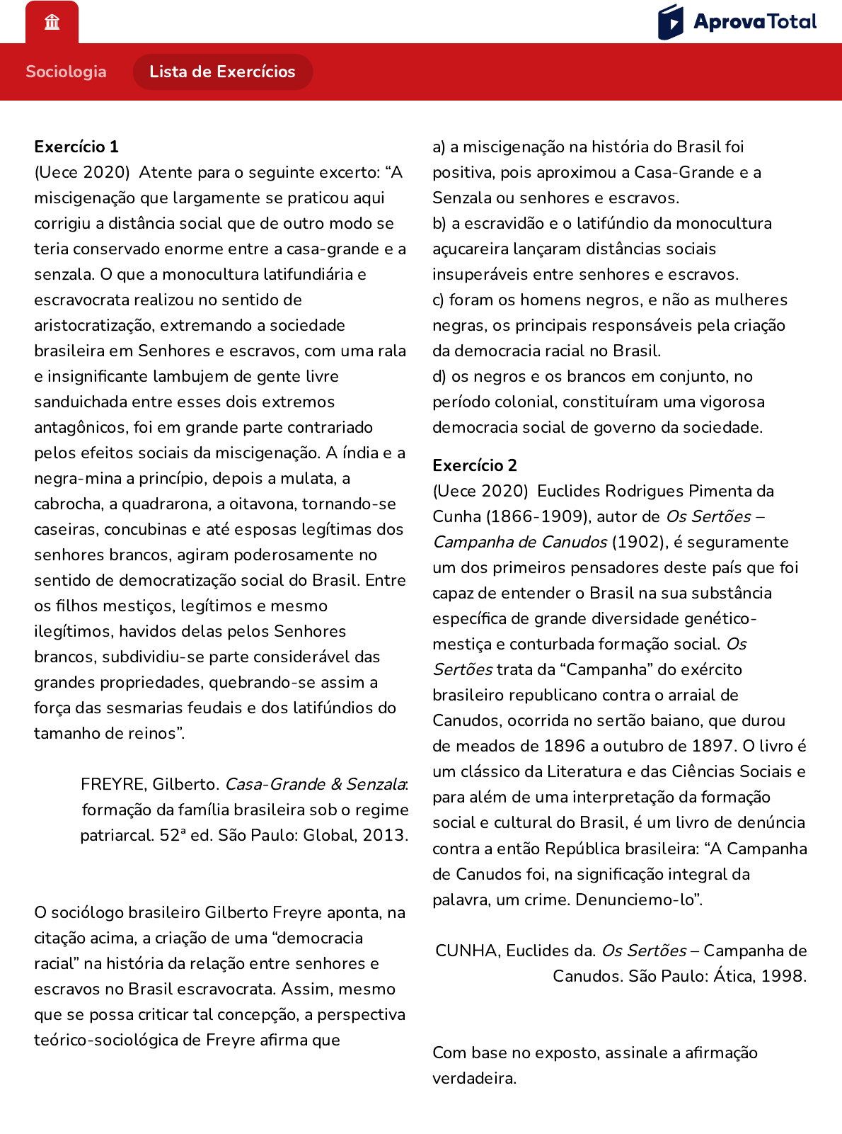 https://aprovatotal.com.br/medio/sociologia/exercicios/sociologia-brasileira/ex.1-sociologia-brasileira-i?dificuldade=random&tentativa=ultima&respostas… 1/27 Sociologia Lista de Exercícios Exercício 1 (Uece 2020) Atente para o seguinte excerto: “A miscigenação que largamente se praticou aqui corrigiu a distância social que de outro modo se teria conservado enorme entre a casa-grande e a senzala. O que a monocultura latifundiária e escravocrata realizou no sentido de aristocratização, extremando a sociedade brasileira em Senhores e escravos, com uma rala e insigni�cante lambujem de gente livre sanduichada entre esses dois extremos antagônicos, foi em grande parte contrariado pelos efeitos sociais da miscigenação. A índia e a negra-mina a princípio, depois a mulata, a cabrocha, a quadrarona, a oitavona, tornando-se caseiras, concubinas e até esposas legítimas dos senhores brancos, agiram poderosamente no sentido de democratização social do Brasil. Entre os �lhos mestiços, legítimos e mesmo ilegítimos, havidos delas pelos Senhores brancos, subdividiu-se parte considerável das grandes propriedades, quebrando-se assim a força das sesmarias feudais e dos latifúndios do tamanho de reinos”. FREYRE, Gilberto. Casa-Grande & Senzala: formação da família brasileira sob o regime patriarcal. 52ª ed. São Paulo: Global, 2013. O sociólogo brasileiro Gilberto Freyre aponta, na citação acima, a criação de uma “democracia racial” na história da relação entre senhores e escravos no Brasil escravocrata. Assim, mesmo que se possa criticar tal concepção, a perspectiva teórico-sociológica de Freyre a�rma que a) a miscigenação na história do Brasil foi positiva, pois aproximou a Casa-Grande e a Senzala ou senhores e escravos. b) a escravidão e o latifúndio da monocultura açucareira lançaram distâncias sociais insuperáveis entre senhores e escravos. c) foram os homens negros, e não as mulheres negras, os principais responsáveis pela criação da democracia racial no Brasil. d) os negros e os brancos em conjunto, no período colonial, constituíram uma vigorosa democracia social de governo da sociedade. Exercício 2 (Uece 2020) Euclides Rodrigues Pimenta da Cunha (1866-1909), autor de Os Sertões – Campanha de Canudos (1902), é seguramente um dos primeiros pensadores deste país que foi capaz de entender o Brasil na sua substância especí�ca de grande diversidade genético- mestiça e conturbada formação social. Os Sertões trata da “Campanha” do exército brasileiro republicano contra o arraial de Canudos, ocorrida no sertão baiano, que durou de meados de 1896 a outubro de 1897. O livro é um clássico da Literatura e das Ciências Sociais e para além de uma interpretação da formação social e cultural do Brasil, é um livro de denúncia contra a então República brasileira: “A Campanha de Canudos foi, na signi�cação integral da palavra, um crime. Denunciemo-lo”. CUNHA, Euclides da. Os Sertões – Campanha de Canudos. São Paulo: Ática, 1998. Com base no exposto, assinale a a�rmação verdadeira. https://aprovatotal.com.br/medio/sociologia/exercicios/sociologia-brasileira/ex.1-sociologia-brasileira-i?dificuldade=random&tentativa=ultima&respostas… 2/27 a) A Guerra de Canudos, como demonstra Euclides da Cunha em Os Sertões, foi uma luta entre monarquistas e republicanos. b) Em Os Sertões, Euclides da Cunha procura compreender a construção sociocultural brasileira e vinga a memória de Canudos. c) Em Os Sertões, é provado que a mestiçagem do povo brasileiro é uma das causas da perturbação social que formou o país. d) A Campanha de Canudos representou a justiça feita pelo exército republicano contra os criminosos do sertão baiano. Exercício 3 (Uem-pas 2017) A nação, a nacionalidade e a identidade nacional são construções sócio- históricas, portanto são resultado da ação de vários agentes sociais. O intelectual é um dos agentes sociais envolvidos na construção das ideias de nação, de nacionalidade e de identidade nacional. Para o caso brasileiro, no que diz respeito à criação da identidade nacional, um intelectual central foi Gilberto Freyre (1900- 1987). Em suas obras, Freyre sistematizou, divulgou e ajudou a sedimentar a ideia do Brasil como país mestiço, atrelando a identidade nacional brasileira à miscigenação, à mestiçagem. Sobre a identidade nacional brasileira assentada na miscigenação e na mestiçagem, é correto a�rmar: 01) A identidade nacional brasileira assentada nos ideais da mestiçagem e da miscigenação busca conciliar discursivamente uma sociedade altamente estrati�cada onde o racismo é um operador social importante. 02) A construção da identidade nacional brasileira favoreceu a expropriação do patrimônio cultural da população negra, uma vez que elementos da cultura negra foram transformados em cultura nacional, situação que colaborou para fortalecer a ideia da ausência de uma cultura da população negra no Brasil. 04) A identidade nacional alicerçada nos ideais da miscigenação e da mestiçagem é algo que foi e ainda é utilizado para encobrir o racismo existente no Brasil. 08) A construção da identidade nacional em torno do ideal da miscigenação e da mestiçagem favoreceu o desenvolvimento do mito da democracia racial e da ausência de racismo no Brasil. 16) A identidade nacional calcada nos ideais da miscigenação e da mestiçagem favoreceu o surgimento de con�ito racial explícito no Brasil. Exercício 4 De acordo com a professora Petronilha Beatriz Gonçalves e Silva, “é importante destacar que se entende por raça a construção social forjada nas tensas relações entre brancos e negros, muitas vezes simuladas como harmoniosas, nada tendo a ver com o conceito biológico de raça cunhado no século XVIII e hoje sobejamente superado. Cabe esclarecer que o termo raça é utilizado com frequência nas relações sociais brasileira