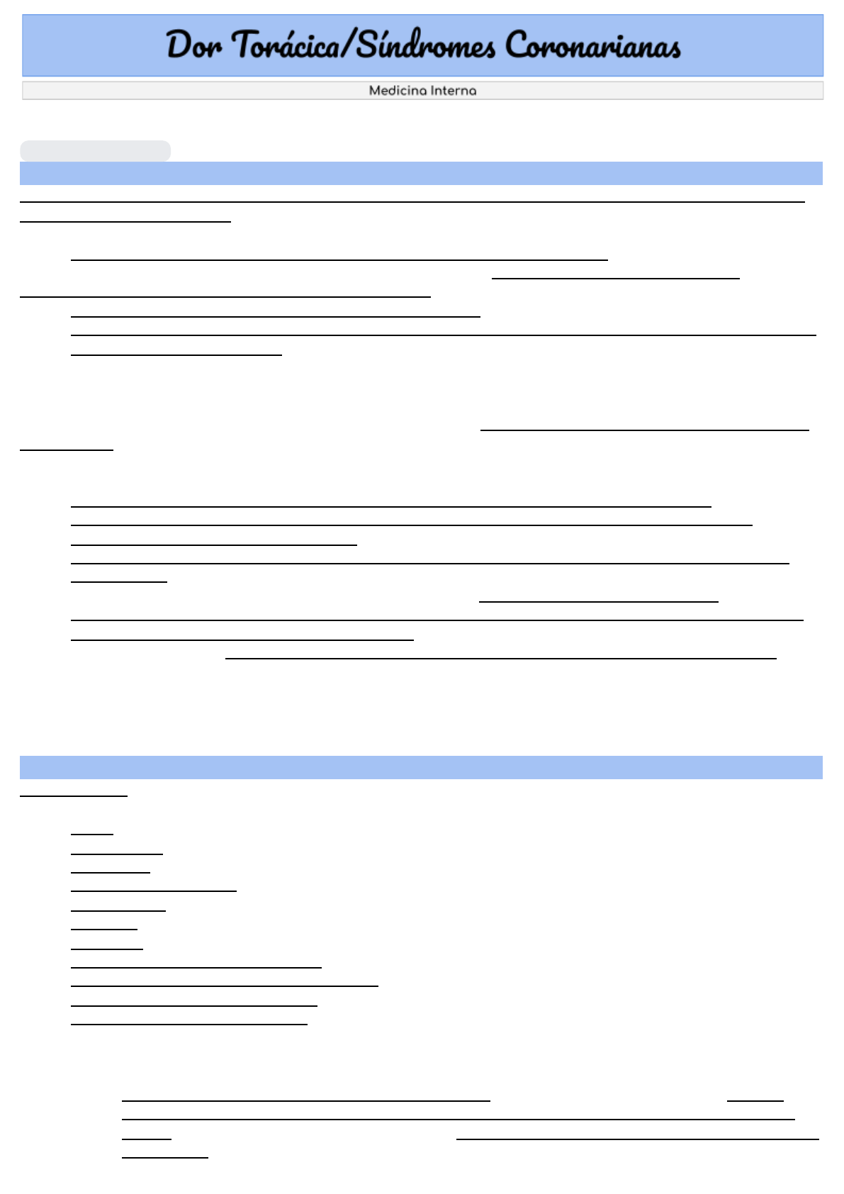 Medicina - 6º Semestre - Ana Paula Cuchera e Eduarda Costa Profº Mauro Kierpel 31 de ago. de 2023 Dor Torácica - Epidemiologia - A dor no peito é uma das causas mais frequentes da busca por atendimento médico em unidades de urgência e emergência. ● Uma das queixas de mais difícil manejo no pronto socorro ● Característica da dor para estratificação do risco é muito importante - Entretanto, tal sintoma, referido das mais diversas formas, nem sempre está relacionado à manifestação da síndrome coronariana aguda (SCA) ● A própria dor da SCA tem características específicas ● Os diabéticos podem não ter dor precordial no infarto, por conta da microangiopatia diabética → nervo também é irrigado - A relevância e a magnitude do tema vem sendo expressas pelas estatísticas mundiais. - Nos Estados Unidos, por exemplo, a dor torácica foi a queixa de 5,8 milhões de indivíduos, dos 113 milhões que deram entrada em serviços de pronto-atendimento (PA). - Consoante ao cenário mundial, no Brasil, anualmente há 4 milhões de atendimentos por queixa de dor torácica. - Conceito: ● Dor → Experiência sensorial e emocional desagradável relacionada a lesão tissular ● Somática superficial → receptores nociceptivos do tegumento, bem localizada(trauma queimadura e processo inflamatório ● Somática profunda → receptores nociceptivos dos músculos, tendões, fáscias, ligamentos e articulações ● Estruturas torácicas com sensibilidade dolorosa → Pleura parietal (apical, costal e diafragmática), traquéia, brônquios centrais, formações esqueléticas do tronco, seus nervos e vasos, fáscias musculares, coração, esôfago. ● Insensíveis à dor → brônquios intrapulmonares, parênquima pulmonar e a pleural visceral ○ Pleura visceral - importância: quando faz punção do derrame pleural uma das complicações é pneumotórax pela anestesia pode furar o parênquima, de um derrame passa para um pneumotórax Características Semiológicas da Dor - ILICIDIPFFF: - Saber esses para ter o que perguntar quando paciente chegar com dor torácica no pronto socorro: ● Início ● Localização ● Irradiação ● Qualidade ou caráter ● Intensidade ● Duração ● Evolução ● Relação com funções orgânicas ● Fatores desencadeantes ou agravantes ● Fatores atenuantes ou de alívio ● Manifestações concomitantes - Estudo CASS: ● Definitivamente anginosa-A ○ Dor ou desconforto retroesternal ou precordial, geralmente precipitada pelo esforço físico, podendo-se irradiar para ombro, mandíbula ou face interna do braço (ambos) e costas, com duração de alguns minutos, e aliviada pelo repouso ou nitrato emmenos de 10 minutos 1 ○ Caso: Paciente se submete a um esforço e começa uma dor com essas características, para de fazer esforço ou usa nitrato por recomendação e melhorou → dor definitivamente anginosa ● Provavelmente anginosa-B ○ Tem a maioria, mas não todas as características da dor definitivamente anginosa ● Provavelmente não anginosa-C ○ Tem poucas características da dor definitivamente anginosa (“dor atípica”, sintomas de “equivalente anginoso”) ● Definitivamente não anginosa-D ○ Nenhuma característica da dor anginosa, fortemente indicativa de diagnóstico não radiológico. OBS! Hiperventilação → paciente relata hiperventilação, por dor, ansiedade, etc. - Quando hiperventilamos → jogamos o excesso de CO2 para fora, tem uso exagerado da musculatura intercostal que gera acúmulo de ácido lático → pedir para o paciente se acalmar pois excesso de ácido lático dói - PVM = prolapso da valva mitral 2 OBS! Angina estável →melhora quando o repouso (cessa o estímulo = melhora) ● Se transforma em instável ● Dor com intensidade de 5 e dura aproximadamente 3 minutos - Angina instável → dor até em repouso ● Dor desencadeada com esforço menor, dura mais e demora para melhorar → obstrução está ficando maior ● Intensidade 7, duração de 5 min e demora mais para melhorar - Infarto agudo do miocárdio → não melhora ● Pode confundir com angina instável OBS! Angina instável resulta de obstrução aguda de uma artéria coronária sem infarto do miocárdio - Para diferenciar a angina instável do IAM: ● Eletrocardiograma diferencia infarto de angina → infarto tem supra de ST (mas pode ter o infarto sem supra de ST) ○ Sem supra: diferencia pelos marcadores de necrose miocárdica → infarto sem supra ● Diferença de infarto com supra e sem supra: é questão de tempo para virar com supra e depois virar necrose - Não isquêmica valvular: ● Estenose aórtica da valva → tem aumento de pressão de sangue que vai gerar hipertrofia ventricular e assim, a coronária não desenvolve ramo suficiente para a parede grossa do ventrículo 3 - Dor psicoemocional: ● Quando hiperventilamos → jogamos o excesso de CO2 para fora, tem uso exagerado da musculatura intercostal que gera acúmulo de ácido lático → pedir para o paciente se acalmar pois excesso de ácido lático dói - Causas de dor torácica: (SABER) PULMONAR: Hipertensão pulmonar → gera dor por conta do aumento da pressão da artéria pulmonar, aumenta pressão no VD e hipertrofia → angina pelo ventrículo direito - Associada à pulmonares e cardíacas: tosse, febre e dispneia sempre estão associadas OBS! Quando da falta de ar, tosse, sempre pensar em causas pulmonares e cardíacas CAIXA TORÁCICA: Síndrome de Tietze → é uma condrite da articulação que junta as costelas com esterno (dói muito) - Herpes Zoster → o tropismo do herpes zoster é pelo nervo intercostal, paciente chega com dor neurálgica intercostal (pedir sorologia específica para herpes) OBS! Drogas → aumentam a resistência vascular (hipertenso), taquicárdico e com vasoconstrição → paciente pode ter AVC ou infarto - No cateterismo não dá nada, pois esse teve espasmo da coronária, infartou e perdeu o miocárdio, mas q