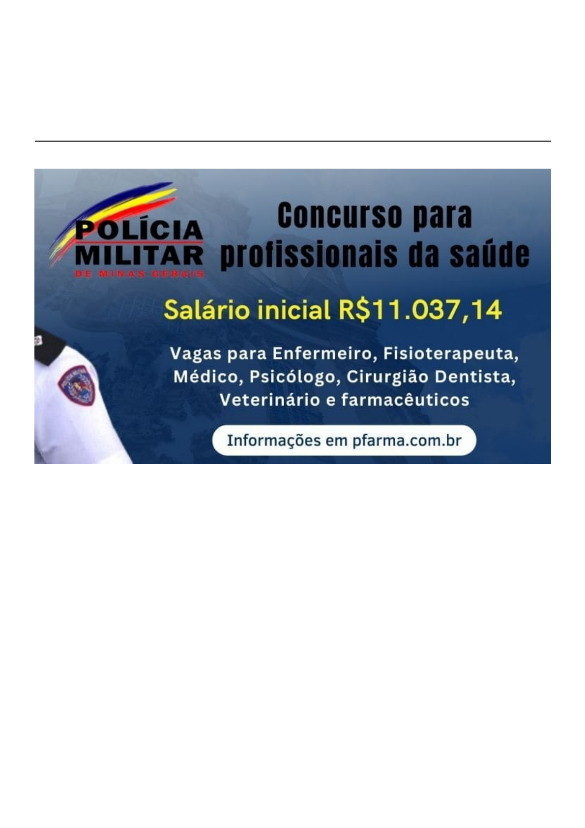 1/4 Concurso com salário de mais de 11 mil para oficiais da saúde na Polícia Militar de Minas Gerais Inscrições abertas para profissionais da saúde no concurso para o quadro de oficiais da saúde da Polícia Militar do Estado de Minas Gerais. O salário inicial é de mais se 11 mil. * Link de inscrição para o concurso e edital de seleção no final do artigo. A Polícia Militar do Estado de Minas Gerais PMMG abriu as inscrições para o Concurso Edital DRH/CRS nº 2/2023 de seleção para provimento de cargo no quadro de oficias da saúde (QOS). O edital oferece 60 vagas imediatas para os profissionais da saúde. Há vagas para Enfermeiro, Fisioterapeuta, Médico (diversas especialidades), Psicólogo, Cirurgião Dentista, Médico Veterinário e Farmacêutico com remuneração inicial como 2º Tenente de R$ 11.037,15, subindo para R$ 12.990,85 ao atingir o cargo de 1º Tenente. R$ 17.698,11 no cargo de Tenente Coronel e R$ 19.620,69 no cargo de Coronel. Salário inicial para profissionais da saúde no Concurso para Oficias da Saúde da Polícia Militar de Minas Gerais PMMG O salário inicial para o 2º Tenente do QOS-PM é atualmente de R$11.037,14 (remuneração mensal inicial de onze mil e trinta e sete reais e quatorze centavos). javascript:void(0) https://undefined/~pfarmacombr/concurso-farmaceutico/8249-concurso-oficial-farmaceutico-policia-militar-de-minas-gerais.html 2/4 O ingresso no QOS-PM dar-se-á no posto de 2º Tenente, por ato do Governador do Estado, após aprovação em todo o processo de seleção previsto no edital do concurso da Polícia Militar de Minas Gerais. No momento da posse no cargo de oficial da saúde, o militar será lotado em qualquer dos municípios indicados no quadro de distribuição de vagas, conforme opção realizada no ato da inscrição. Vagas do Concurso para Oficias da Saúde da Polícia Militar de Minas Gerais PMMG OFICIAL DA SAÚDE VAGAS Oficial Médico (diversas especialidades) 27 Oficial Psicólogo 18 Oficial Cirurgião Dentista 4 Oficial Veterinário 1 Oficial Enfermeiro 5 Oficial Fisioterapeuta 3 Oficial Farmacêutico 2 Divisão das vagas para oficias médicos: Patologia Clínica (1) Otorrinolaringologia (1) Ortopedia – Pé (1) Ortopedia – Ombro (1) Geriatria (1) Cirurgia Pediátrica (1) Cirurgia Vascular (1) Mastologia (2) Neurocirurgia (2) Dermatologia (2) Clínica Médica (3) Clínico (11) Requisitos para prestar o Concurso para Oficias da Saúde da Polícia Militar de Minas Gerais PMMG a) ser brasileiro(a) nato; b) possuir idoneidade moral; c) estar quite com as obrigações eleitorais e militares; d) ter entre 18 (dezoito) e 35 (trinta e cinco) anos de idade completáveis até a data da inclusão; e) ter Carteira Nacional de Habilitação válida, no mínimo na categoria “B”; f) ter concluído curso de graduação em nível superior, obtido em estabelecimento reconhecido pelo sistema de ensino federal, estadual ou do Distrito Federal, em área compatível com a função a ser exercida; g) ter aptidão física; h) ter sanidade física e mental; 3/4 i) ser aprovado em avaliação psicológica; j) não apresentar, quando em uso dos diversos uniformes, tatuagem visível que seja, por seu significado, incompatível com o exercício das atividades de policial militar. Etapas da seleção do Concurso Público para Oficias da Saúde da Polícia Militar de Minas Gerais PMMG O concurso consiste em três fases sendo a primeira uma prova objetiva para avaliação de conhecimentos; a segunda uma prova de Títulos, Avaliações Psicológicas, Exames de Saúde e Avaliação Física Militar (AFM) e a terceira, um Estágio de Adaptação de Oficiais (EAdO). Edital do Concurso para Oficias da Saúde da Polícia Militar de Minas Gerais PMMG Faça download do edital do concurso para oficial da saúde da PM/MG em https://intranet.policiamilitar.mg.gov.br/conteudoportal/sites/concurso/23032023161905790.pdf Inscrição e taxa do Concurso para Oficias da Saúde da Polícia Militar de Minas Gerais PMMG O valor da taxa de inscrição é de R$220,00 (duzentos e vinte reais) e deverá ser paga mediante emissão da guia de Documento de Arrecadação Estadual (DAE). Inscrição somente via internet, por meio do site – www.pmmg.mg.gov.br, até o dia 19/4. Concurso para profissionais da saúde de Nível Médio na Polícia Militar de Minas Gerais PMMG Também há outro concurso em andamento com inscrições até 19 de abril para Praça Especialista com vagas para profissionais da saúde de nível médio/técnico: - Técnico em Farmácia, Técnico em Radiologia, Técnico Laboratorial, Técnico Laboratorial, Técnico em Prótese Dental e Técnico em Saúde Bucal - salário inicial de R$ 4.360,83 ESPECIALISTA TÉCNICO DE SAÚDE VAGAS Técnico em Enfermagem 57 Técnico em Radiologia 2 Técnico em Farmácia 5 Técnico Laboratorial 6 Técnico em Saúde Bucal 8 Técnico em Prótese Dental 2 Confira o edital para o concurso destinado ao nível médico para profissionais técnicos em - Confira os detalhes do concurso para oficial farmacêutico da Polícia Militar de Minas Gerais Whatsapp https://intranet.policiamilitar.mg.gov.br/conteudoportal/sites/concurso/23032023161905790.pdf https://undefined/~pfarmacombr/concurso-farmaceutico/8249-concurso-oficial-farmaceutico-policia-militar-de-minas-gerais.html javascript:void(0) 4/4