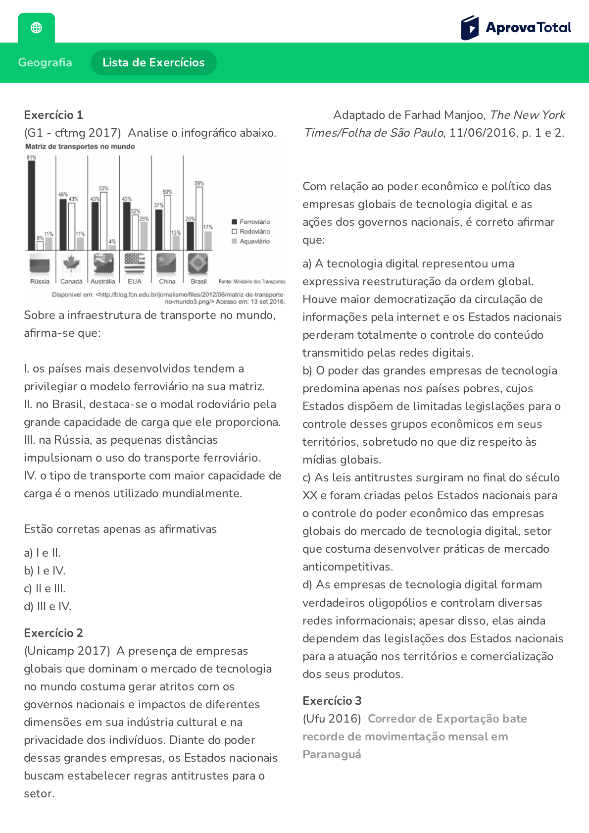 https://aprovatotal.com.br/medio/geografia/exercicios/transportes-comercio-e-servicos/ex.-1-transportes?dificuldade=random&tentativa=ultima&respostas… 1/24 Geogra�a Lista de Exercícios Exercício 1 (G1 - cftmg 2017) Analise o infográ�co abaixo. Sobre a infraestrutura de transporte no mundo, a�rma-se que: I. os países mais desenvolvidos tendem a privilegiar o modelo ferroviário na sua matriz. II. no Brasil, destaca-se o modal rodoviário pela grande capacidade de carga que ele proporciona. III. na Rússia, as pequenas distâncias impulsionam o uso do transporte ferroviário. IV. o tipo de transporte com maior capacidade de carga é o menos utilizado mundialmente. Estão corretas apenas as a�rmativas a) I e II. b) I e IV. c) II e III. d) III e IV. Exercício 2 (Unicamp 2017) A presença de empresas globais que dominam o mercado de tecnologia no mundo costuma gerar atritos com os governos nacionais e impactos de diferentes dimensões em sua indústria cultural e na privacidade dos indivíduos. Diante do poder dessas grandes empresas, os Estados nacionais buscam estabelecer regras antitrustes para o setor. Adaptado de Farhad Manjoo, The New York Times/Folha de São Paulo, 11/06/2016, p. 1 e 2. Com relação ao poder econômico e político das empresas globais de tecnologia digital e as ações dos governos nacionais, é correto a�rmar que: a) A tecnologia digital representou uma expressiva reestruturação da ordem global. Houve maior democratização da circulação de informações pela internet e os Estados nacionais perderam totalmente o controle do conteúdo transmitido pelas redes digitais. b) O poder das grandes empresas de tecnologia predomina apenas nos países pobres, cujos Estados dispõem de limitadas legislações para o controle desses grupos econômicos em seus territórios, sobretudo no que diz respeito às mídias globais. c) As leis antitrustes surgiram no �nal do século XX e foram criadas pelos Estados nacionais para o controle do poder econômico das empresas globais do mercado de tecnologia digital, setor que costuma desenvolver práticas de mercado anticompetitivas. d) As empresas de tecnologia digital formam verdadeiros oligopólios e controlam diversas redes informacionais; apesar disso, elas ainda dependem das legislações dos Estados nacionais para a atuação nos territórios e comercialização dos seus produtos. Exercício 3 (Ufu 2016) Corredor de Exportação bate recorde de movimentação mensal em Paranaguá https://aprovatotal.com.br/medio/geografia/exercicios/transportes-comercio-e-servicos/ex.-1-transportes?dificuldade=random&tentativa=ultima&respostas… 2/24 Acompanhando o recorde brasileiro nas exportações de soja, o Corredor de Exportação do Porto de Paranaguá também fechou o mês de junho de 2015 com movimentação histórica de graneis. Balanço divulgado pela Administração dos Portos de Paranaguá e Antonina (Appa) aponta que o �uxo total de grãos no mês totalizou 1,92 milhões de toneladas. A marca é 5,9% superior ao desempenho anterior, de 1,81 milhões de toneladas escoadas em maio de 2011. Disponível em: <http://www.gazetadopovo.com.br/agronegocio/logistica/corredor- de-exportacao-bate-recorde-de-movimentacao- mensal-em-paranagua- cal9zmjc1psknnr4uuanuohih> Acesso em: 14 de jan. 2016. Os portos são uma parte integrante desse complexo, de�nido como um a) aparato de incentivos �scais voltados à ampliação da produção destinada ao abastecimento do mercado internacional. b) conjunto de infraestruturas criadas pelo agronegócio com a �nalidade de facilitar o escoamento de gêneros agrícolas para outros países. c) sistema integrado de transporte e armazenagem destinado, principalmente, ao escoamento de produtos para o mercado externo. d) programa de estímulo à produção de produtos primários locais com alto valor agregado e voltado para a exportação. Exercício 4 (Uece 2016) A partir dos anos 1980, quando gradativamente espalharam-se pelo mundo as grandes empresas e as novas tecnologias, como a internet, os satélites e os meios digitais, ocorreu um fenômeno global que favoreceu o aumento da produtividade econômica e a aceleração dos �uxos de capitais, mercadorias, informações e pessoas. Este processo, predominante em países desenvolvidos e alguns países emergentes, formou, nos territórios, um meio conhecido como a) cientí�co-agrário. b) técnico-cientí�co-informacional. c) técnico-informacional-agroindustrial. d) acadêmico-industrial. Exercício 5 (Upe 2015) O Rodoanel causa certos impactos sobre o meio urbano, mas não se limita, apenas, à questão do tráfego. Ele pode, inclusive, interferir na dinâmica econômica e territorial do espaço geográ�co. Assinale a alternativa que de�ne CORRETAMENTE um “Rodoanel”. a) É um projeto ferroviário que objetiva fundamentalmente interligar as áreas urbanas às áreas rurais em cidades de médio porte. b) É um projeto viário de interligação de rodovias radiais, que penetram numa Região Metropolitana. c) É um projeto hidroviário que interliga duas grandes áreas metropolitanas com rodovias radiais estaduais. d) É um projeto viário que interliga rodovias estaduais, de áreas montanhosas, com rodovias federais circulares em áreas planas, nas regiões metropolitanas. e) É um projeto viário e hidroviário que se concretizou na região Centro-Sul do Brasil e implicou a construção de hidrovias, partindo do Mato Grosso do Sul ao oeste do Rio Grande do Sul para o escoamento da soja. Exercício 6 (Upf 2015) No Brasil, apesar do extenso litoral, o transporte marítimo é pouco utilizado, tanto para passageiros quanto para carga. Sobre esse assunto, analise as a�rmações e identi�que a única alternativa correta. https://aprovatotal.com.br/medio/geografia/exercicios/transportes-comercio-e-servicos/ex.-1-transportes?dificuldade=random&tentativa=ultima&respostas… 3/24 a) Na região Sul, está o maior terminal portuário 
