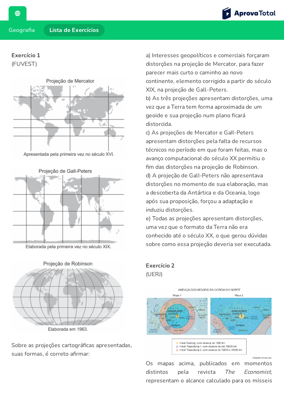 https://aprovatotal.com.br/medio/geografia/exercicios/cartografia-e-geoprocessamento/ex.-1-cartografia?dificuldade=random&tentativa=ultima&respostas… 1/32 Geogra�a Lista de Exercícios Exercício 1 (FUVEST) Sobre as projeções cartográ�cas apresentadas, suas formas, é correto a�rmar: a) Interesses geopolíticos e comerciais forçaram distorções na projeção de Mercator, para fazer parecer mais curto o caminho ao novo continente, elemento corrigido a partir do século XIX, na projeção de Gall-Peters. b) As três projeções apresentam distorções, uma vez que a Terra tem forma aproximada de um geoide e sua projeção num plano �cará distorcida. c) As projeções de Mercator e GaII-Peters apresentam distorções pela falta de recursos técnicos no período em que foram feitas, mas o avanço computacional do século XX permitiu o �m das distorções na projeção de Robinson. d) A projeção de GalI-Peters não apresentava distorções no momento de sua elaboração, mas a descoberta da Antártica e da Oceania, logo após sua proposição, forçou a adaptação e induziu distorções. e) Todas as projeções apresentam distorções, uma vez que o formato da Terra não era conhecido até o século XX, o que gerou dúvidas sobre como essa projeção deveria ser executada. Exercício 2 (UERJ) Os mapas acima, publicados em momentos distintos pela revista The Economist, representam o alcance calculado para os mísseis https://aprovatotal.com.br/medio/geografia/exercicios/cartografia-e-geoprocessamento/ex.-1-cartografia?dificuldade=random&tentativa=ultima&respostas… 2/32 balísticos da Coreia do Norte. No mapa 1, de 03/05/2003, os mísseis não atingem plenamente o espaço continental dos Estados Unidos. O mapa 2, publicado alguns dias depois, corrige essa informação, revelando a efetiva vulnerabilidade de todo o território estadunidense àqueles artefatos militares. A correção das informações do mapa 1 decorre da seguinte característica desse tipo de representação da superfície terrestre: a) deformações resultantes da projeção utilizada b) generalizações derivadas da simbologia grá�ca c) imprecisões decorrentes da tecnologia disponível d) manipulações originadas da orientação ideológica Exercício 3 (IFCE) Nos últimos meses o Nordeste tem enfrentado o maior desastre ambiental relativo à derramamento de óleo no litoral, estando tomado de manchas de petróleo que estão se espalhando pelos principais pontos turísticos da região, como as praias de Ponta Grossa, Redoma e Jericoacoara, no Ceará, Boa Viagem, Porto de Galinhas e Praia dos Carneiros, no Recife, e a Foz do Rio São Francisco, em Sergipe. Em setembro, as manchas negras já tinham atingido 99 locais em 46 municípios de 8 estados, de acordo com o Instituto Brasileiro do Meio Ambiente (Ibama), conforme o G1 de 26 de set. de 2019. A maior parte (41%) está no Rio Grande do Norte (veja a situação por estado mais abaixo). G1 – 26 de set. de 2019. Fonte: https://g1.globo.com/natureza/noticia/2019/09/26/ma de-oleo-nas-praias-do-nordeste-ja-atingem- 99-locais-ibama-diz-que-elas-tem-a-mesma- origem-e-nao-sao-do-brasil.ghtml A imagem acima reproduz as áreas onde foram identi�cadas manchas de óleo no Nordeste brasileiro. É correto a�rmar-se que a imagem a) se con�gura como um mapa, por apresentar características como representação plana em pequena escala, com legendas e escala bem de�nida. b) não se con�gura como um mapa, por inexistirem informações como legenda, escala, orientação e projeção cartográ�ca. c) se con�gura como uma carta, por apresentar características como representação plana, com escala média e desdobramento em folhas articuladas de maneira sistemática. d) não se con�gura como carta, por existirem informações como título, legenda, escala, orientação e projeção cartográ�ca. e) se con�gura como uma planta, por apresentar características como representação plana, com https://aprovatotal.com.br/medio/geografia/exercicios/cartografia-e-geoprocessamento/ex.-1-cartografia?dificuldade=random&tentativa=ultima&respostas… 3/32 escala grande e desdobramento em folhas articuladas de maneira sistemática. Exercício 4 (Espcex (Aman)) Desde os primitivos rabiscos em uma placa de argila ou em peles de animais até a difusão maciça de aplicativos de localização e de navegação em smartphones, o uso de mapas é uma necessidade vital para o homem. Sobre esse assunto, considere as seguintes a�rmativas: I. Diferentemente dos meridianos, que possuem sempre o mesmo diâmetro, os círculos que representam os paralelos diminuem de tamanho à medida que se afastam do Equador em direção aos polos. II. As escalas podem ser grá�cas ou numéricas. As representações em escala pequena mostram áreas pequenas e com muitos detalhes. III. A distorção (de áreas, de formas ou de distâncias) pode ser eliminada quando as projeções a�láticas são empregadas na confecção de um mapa. IV. Anamorfose é uma forma de representação cartográ�ca utilizada em mapas temáticos na qual as áreas dos países, estados ou regiões são mostradas proporcionalmente à importância de sua participação no fenômeno representado. Assinale a alternativa que apresenta todas as a�rmativas corretas, dentre as listadas acima. a) I e II b) I e III c) I e IV d) II e III e) III e IV Exercício 5 (ifpe) Existem mapas que remontam ao ano 6.000 a. C. O primeiro mapa-múndi foi publicado em 1569, pelo belga Mercator, que utilizou uma projeção para representar a superfície esférica da Terra sobre uma superfície plana. Esse tipo de mapa é o mais comumente utilizado hoje e denomina-se planisfério. O globo é a representação mais �el da superfície terrestre, pois, apesar de não ser rico em detalhes, possui forma semelhante à da Terra. Todo bom mapa deve conter quatro elementos principais: título, escala, coordenadas geográ�cas e legenda. Eles a