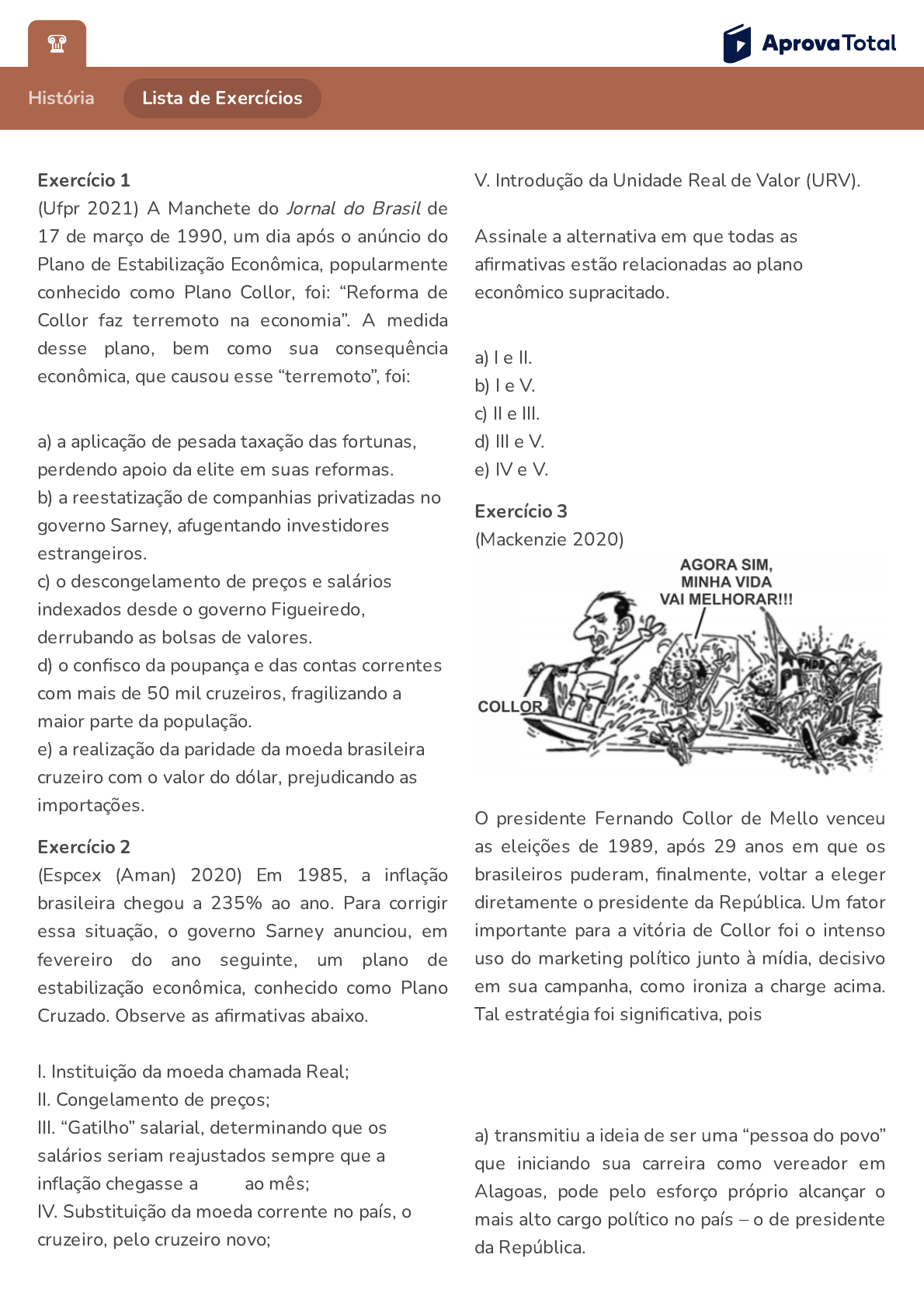 https://aprovatotal.com.br/medio/historia/exercicios/nova-republica/ex.1-nova-republica-i?dificuldade=random&tentativa=ultima&respostas=todas 1/19 História Lista de Exercícios Exercício 1 (Ufpr 2021) A Manchete do Jornal do Brasil de 17 de março de 1990, um dia após o anúncio do Plano de Estabilização Econômica, popularmente conhecido como Plano Collor, foi: “Reforma de Collor faz terremoto na economia”. A medida desse plano, bem como sua consequência econômica, que causou esse “terremoto”, foi: a) a aplicação de pesada taxação das fortunas, perdendo apoio da elite em suas reformas. b) a reestatização de companhias privatizadas no governo Sarney, afugentando investidores estrangeiros. c) o descongelamento de preços e salários indexados desde o governo Figueiredo, derrubando as bolsas de valores. d) o con�sco da poupança e das contas correntes com mais de 50 mil cruzeiros, fragilizando a maior parte da população. e) a realização da paridade da moeda brasileira cruzeiro com o valor do dólar, prejudicando as importações. Exercício 2 (Espcex (Aman) 2020) Em 1985, a in�ação brasileira chegou a 235% ao ano. Para corrigir essa situação, o governo Sarney anunciou, em fevereiro do ano seguinte, um plano de estabilização econômica, conhecido como Plano Cruzado. Observe as a�rmativas abaixo. I. Instituição da moeda chamada Real; II. Congelamento de preços; III. “Gatilho” salarial, determinando que os salários seriam reajustados sempre que a in�ação chegasse a ao mês; IV. Substituição da moeda corrente no país, o cruzeiro, pelo cruzeiro novo; V. Introdução da Unidade Real de Valor (URV). Assinale a alternativa em que todas as a�rmativas estão relacionadas ao plano econômico supracitado. a) I e II. b) I e V. c) II e III. d) III e V. e) IV e V. Exercício 3 (Mackenzie 2020) O presidente Fernando Collor de Mello venceu as eleições de 1989, após 29 anos em que os brasileiros puderam, �nalmente, voltar a eleger diretamente o presidente da República. Um fator importante para a vitória de Collor foi o intenso uso do marketing político junto à mídia, decisivo em sua campanha, como ironiza a charge acima. Tal estratégia foi signi�cativa, pois a) transmitiu a ideia de ser uma “pessoa do povo” que iniciando sua carreira como vereador em Alagoas, pode pelo esforço próprio alcançar o mais alto cargo político no país – o de presidente da República. https://aprovatotal.com.br/medio/historia/exercicios/nova-republica/ex.1-nova-republica-i?dificuldade=random&tentativa=ultima&respostas=todas 2/19 b) a campanha do candidato baseava-se na luta contra a corrupção e apoio aos “descamisados”, grupo do qual fez parte no começo de sua carreira, no interior carente do estado de Alagoas. c) construiu junto ao povo brasileiro a imagem de “caçador de marajás”, defensor do �m de regalias e contra a corrupção; pois, jovem, foi eleito por meio do voto popular, ao cargo de prefeito de Maceió. d) conseguiu transmitir aos eleitores a imagem de um candidato jovem, “moderno” e “moralizador” que se opunha aos representantes políticos corruptos e conservadores. e) deu, efetivamente, início a um programa de atendimento às camadas mais pobres da população, ao se colocar ao lado dos “pés- descalços”, como protetor contra os “velhos políticos”. Exercício 4 (G1 - cftmg 2020) A Constituição de 1988 pode ser considerada um marco na conquista e garantia de direitos pelos indígenas no Brasil. [...] Enquanto o Estatuto do Índio (Lei 6.001), promulgado em 1973, previa prioritariamente que as populações deveriam ser “integradas” ao restante da sociedade, a Constituição passou a garantir o respeito e a proteção à cultura das populações originárias. [...] Na Constituição de 1988, os direitos dos índios estão expressos em capítulo especí�co (Título VIII, Da Ordem Social, Capítulo VIII, Dos Índios) com preceitos que asseguram o respeito à organização social, aos costumes, às línguas, crenças e tradições. “A população indígena hoje no Brasil tem o direito de buscar maior integração, bem como de se manter intacta em sua cultura, aldeada, se assim entender que é a melhor forma de preservação”, explica Gustavo Proença, professor de Direito. [...] Ainda no texto constitucional, os direitos dos índios sobre suas terras são de�nidos como “direitos originários”, isto é, anteriores à criação do próprio Estado e que levam em conta o histórico de dominação da época da colonização. De acordo com o texto constitucional, a obrigação de proteger as terras indígenas cabe à União. [...] OLIVEIRA, Cristiane. Povos Indígenas: conheça os direitos previstos na Constituição. Agência Brasil, Rio de Janeiro, 19 abr. 2017. Disponível em: <http://agenciabrasil.ebc.com.br/direitos- humanos/noticia/2017-04/povos-indigenas- conheca-os-direitos-previstos-naconstituicao>. Acesso em: 10 set. 2019. (adaptado). Sobre os direitos constitucionais dos povos indígenas, a�rma-se que 1. a Constituição de 1988 garantiu o direito originário à terra e o respeito à sua organização social, costumes, línguas, crenças e tradições. 2. a demarcação e o respeito ao uso das terras pelos indígenas é uma obrigação constitucional do governo federal. 3. os princípios que orientavam o Estatuto do Índio de 1973 foram mantidos pela Constituição de 1988. 4. o direito constitucional dos indígenas à terra é determinado por sua condição de descendentes dos povos nativos do território. 5. a Constituição de 1988 determina que os indígenas devem ser integrados ao restante da sociedade. São verdadeiras apenas as a�rmativas a) 1, 2 e 4. b) 1, 3 e 5. c) 2, 3 e 4. https://aprovatotal.com.br/medio/historia/exercicios/nova-republica/ex.1-nova-republica-i?dificuldade=random&tentativa=ultima&respostas=todas 3/19 d) 2, 4 e 5. Exercício 5 (Uerj 2019) Tenho pois mostrado pela