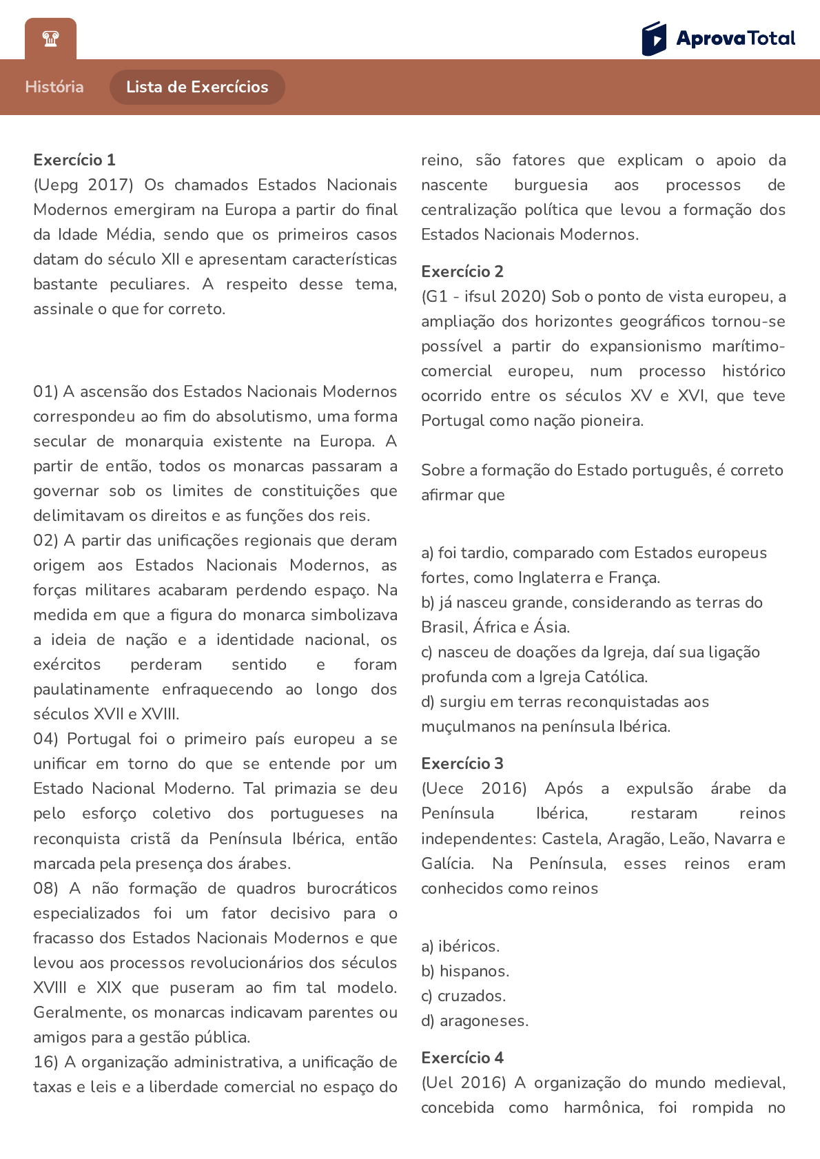 https://aprovatotal.com.br/medio/historia/exercicios/idade-moderna/ex.1-surgimento-dos-estados-modernos?dificuldade=random&tentativa=ultima&respos… 1/66 História Lista de Exercícios Exercício 1 (Uepg 2017) Os chamados Estados Nacionais Modernos emergiram na Europa a partir do �nal da Idade Média, sendo que os primeiros casos datam do século XII e apresentam características bastante peculiares. A respeito desse tema, assinale o que for correto. 01) A ascensão dos Estados Nacionais Modernos correspondeu ao �m do absolutismo, uma forma secular de monarquia existente na Europa. A partir de então, todos os monarcas passaram a governar sob os limites de constituições que delimitavam os direitos e as funções dos reis. 02) A partir das uni�cações regionais que deram origem aos Estados Nacionais Modernos, as forças militares acabaram perdendo espaço. Na medida em que a �gura do monarca simbolizava a ideia de nação e a identidade nacional, os exércitos perderam sentido e foram paulatinamente enfraquecendo ao longo dos séculos XVII e XVIII. 04) Portugal foi o primeiro país europeu a se uni�car em torno do que se entende por um Estado Nacional Moderno. Tal primazia se deu pelo esforço coletivo dos portugueses na reconquista cristã da Península Ibérica, então marcada pela presença dos árabes. 08) A não formação de quadros burocráticos especializados foi um fator decisivo para o fracasso dos Estados Nacionais Modernos e que levou aos processos revolucionários dos séculos XVIII e XIX que puseram ao �m tal modelo. Geralmente, os monarcas indicavam parentes ou amigos para a gestão pública. 16) A organização administrativa, a uni�cação de taxas e leis e a liberdade comercial no espaço do reino, são fatores que explicam o apoio da nascente burguesia aos processos de centralização política que levou a formação dos Estados Nacionais Modernos. Exercício 2 (G1 - ifsul 2020) Sob o ponto de vista europeu, a ampliação dos horizontes geográ�cos tornou-se possível a partir do expansionismo marítimo- comercial europeu, num processo histórico ocorrido entre os séculos XV e XVI, que teve Portugal como nação pioneira. Sobre a formação do Estado português, é correto a�rmar que a) foi tardio, comparado com Estados europeus fortes, como Inglaterra e França. b) já nasceu grande, considerando as terras do Brasil, África e Ásia. c) nasceu de doações da Igreja, daí sua ligação profunda com a Igreja Católica. d) surgiu em terras reconquistadas aos muçulmanos na península Ibérica. Exercício 3 (Uece 2016) Após a expulsão árabe da Península Ibérica, restaram reinos independentes: Castela, Aragão, Leão, Navarra e Galícia. Na Península, esses reinos eram conhecidos como reinos a) ibéricos. b) hispanos. c) cruzados. d) aragoneses. Exercício 4 (Uel 2016) A organização do mundo medieval, concebida como harmônica, foi rompida no https://aprovatotal.com.br/medio/historia/exercicios/idade-moderna/ex.1-surgimento-dos-estados-modernos?dificuldade=random&tentativa=ultima&respos… 2/66 decorrer dos séculos X ao XV por um complexo processo histórico constituído por transformações e criações que mudaram a Europa Ocidental. Em relação à criação das monarquias ibéricas nesse contexto, considere as a�rmativas a seguir. I. A nobreza portuguesa lutou de forma uni�cada contra o reino de Castela pela independência de Portugal, apoiando-se no retorno do Rei Dom Sebastião I. II. A reconquista da região ibérica, no século XIII, teve início com o Papa Urbano VII ao conceder o reino de Navarra a Dom Afonso Henrique. III. A reconquista espanhola equilibrou-se em uma centralização política, mas sem atingir uma uni�cação cultural pelas diversas identidades de seus habitantes. IV. Em Portugal, a Revolução de Avis, composta majoritariamente pelas camadas burguesas, fortaleceu a uni�cação política do reino. Assinale a alternativa correta. a) Somente as a�rmativas I e II são corretas. b) Somente as a�rmativas I e IV são corretas. c) Somente as a�rmativas III e IV são corretas. d) Somente as a�rmativas I, II e III são corretas. e) Somente as a�rmativas II, III e IV são corretas. Exercício 5 (Fgv 2013) Guerra dos Cem Anos – Denominação dada a uma série de con�itos ocorridos entre a França e a Inglaterra no período 1337-1475. O termo, que vem sendo considerado impróprio, é uma criação moderna dos historiadores do século XIX, introduzido nos manuais escolares. (...) Alguns historiadores têm mesmo proposto que seja utilizada a expressão “cem anos de guerra” e não a tradicional. (Antônio Carlos do Amaral Azevedo, Dicionário de nomes, termos e conceitos históricos apud Luiz Koshiba, História: origens, estruturas e processos) Sobre essa guerra, é correto a�rmar que a) decorreu diretamente da chamada Crise do Século XIV, pois a Inglaterra e a França tinham leituras divergentes da paralisia econômica que atingiu a Europa ocidental desde os primeiros anos desse século. b) resultou da imediata reação da França, aliada dos reinos de Castela e Aragão, à aliança econômica e militar entre a Inglaterra e Portugal, iniciando o mais sangrento con�ito bélico da Europa moderna. c) desenrolou-se quase toda em território francês, com batalhas entremeadas por tréguas e períodos de paz, e as suas origens se ligam à sucessão do trono francês, também disputado pela Inglaterra. d) derivou da disputa por territórios recém- descobertos por franceses no norte da África, mas que eram estratégicos para a expansão da economia inglesa, já produtora de manufaturados. e) desenvolveu-se no contexto das reformas religiosas, obrigando cada nação europeia a se posicionar na defesa ou não do papado, fator principal do con�ito bélico entre franceses e ingleses. Exercício 6 (Unicamp 2013) Tradicionalmente, a vitória dos cristãos sobre os muçulmanos na Batalha de Covadonga, na regi