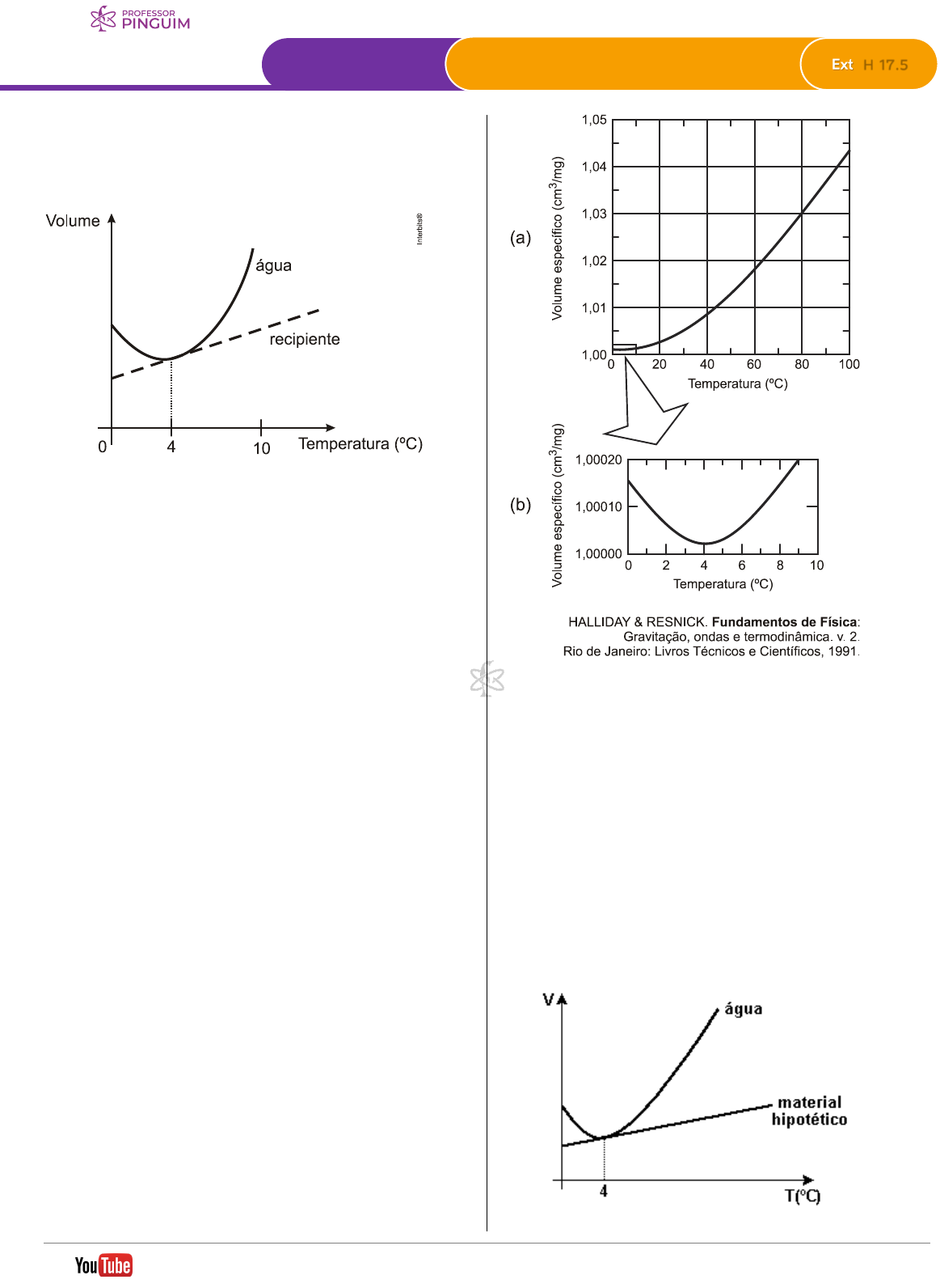 | 2 Extensivo de Física Ext H 17.5 TERMOLOGIA Lista 1 Dilatação Anômala da Água Resoluções em vídeo ► professorpinguim.com.br /profpinguim 1. (Pucrs) As variações de volume de certa quantidade de água e do volume interno de um recipiente em função da temperatura foram medidas separadamente e estão representadas no gráfico abaixo, respectivamente, pela linha contínua (água) e pela linha tracejada (recipiente). Estudantes, analisando os dados apresentados no gráfico, e supondo que a água seja colocada dentro do recipiente, fizeram as seguintes previsões: I. O recipiente estará completamente cheio de água, sem haver derramamento, apenas quando a temperatura for °4 C. II. A água transbordará apenas se sua temperatura e a do recipiente assumirem simultaneamente valores acima de °4 C. III. A água transbordará se sua temperatura e a do recipiente assumirem simultaneamente valores acima de °4 C ou se assumirem simultaneamente valores abaixo de °4 C. A(s) afirmativa(s) correta(s) é/são: a) I, apenas. b) I e II, apenas. c) I e III, apenas. d) II e III, apenas. e) I, II e III. 2. (Enem) De maneira geral, se a temperatura de um líquido comum aumenta, ele sofre dilatação. O mesmo não ocorre com a água, se ela estiver a uma temperatura próxima a de seu ponto de congelamento. O gráfico mostra como o volume específico (inverso da densidade) da água varia em função da temperatura, com uma aproximação na região entre 0ºC e 10ºC, ou seja, nas proximidades do ponto de congelamento da água. A partir do gráfico, é correto concluir que o volume ocupado por certa massa de água a) diminui em menos de 3% ao se resfriar de 100ºC a 0ºC. b) aumenta em mais de 0,4% ao se resfriar de 4ºC a 0ºC. c) diminui em menos de 0,04% ao se aquecer de 0ºC a 4ºC. d) aumenta em mais de 4% ao se aquecer de 4ºC a 9ºC. e) aumenta em menos de 3% ao se aquecer de 0ºC a 100ºC. 3. (Ufpel) A água, substância fundamental para a vida no Planeta, apresenta uma grande quantidade de comportamentos anômalos. Suponha que um recipiente, feito com um determinado material hipotético, se encontre completamente cheio de água a 4°C. https://professorpinguim.com.br https://youtube.com/profpinguim https://youtube.com/profpinguim https://professorpinguim.com.br https://youtube.com/profpinguim https://professorpinguim.com.br https://professorpinguim.com.br https://youtube.com/profpinguim https://professorpinguim.com.br https://youtube.com/profpinguim https://youtube.com/profpinguim | 2 Extensivo de Física Ext H 17.5 TERMOLOGIA Lista 1 Dilatação Anômala da Água Resoluções em vídeo ► professorpinguim.com.br /profpinguim De acordo com o gráfico e seus conhecimentos, é correto afirmar que a) apenas a diminuição de temperatura fará com que a água transborde. b) tanto o aumento da temperatura quanto sua diminuição não provocarão o transbordamento da água. c) qualquer variação de temperatura fará com que a água transborde. d) a água transbordará apenas para temperaturas negativas. e) a água não transbordará com um aumento de temperatura, somente se o calor específico da substância for menor que o da água. 4. (Ufla) Um bulbo de vidro conectado a um tubo fino, com coeficiente de dilatação desprezível, contendo certa massa de água na fase líquida é mostrado a seguir em três situações de temperatura. Na primeira, o sistema está a 4°C; na segunda, a 1°C e, na terceira, a 10°C. Conforme a temperatura, a água ocupa uma certa porção do tubo. Tal fenômeno é explicado a) pelo aumento de volume da água de 0°C a 4°C, seguido da diminuição do volume a partir de 4°C. b) pela diminuição da densidade da água de 0°C a 4°C, seguido do aumento da densidade a partir de 4°C. c) pelo aumento do volume da água a partir de 0°C. d) pelo aumento da densidade da água de 0°C a 4°C, seguido da diminuição da densidade a partir de 4°C. e) pela diminuição do volume da água a partir de 0°C. 5. (Pucmg) Quando aumentamos a temperatura dos sólidos e dos líquidos, normalmente seus volumes aumentam. Entretanto, algumas substâncias apresentam um comportamento anômalo, como é o caso da água, mostrado no gráfico a seguir. Assinale a afirmativa CORRETA. a) O volume da água aumenta e sua densidade diminui, quando ela é resfriada abaixo de 4°C. b) Entre 4°C e 0°C, a diminuição de temperatura faz com que a água se torne mais densa. c) Quando a água é aquecida, a partir de 4°C sua densidade e seu volume aumentam. d) Quando a água está a 4°C, ela apresenta a sua menor densidade. 1. C 2. C 3. C 4. D 5. A Gabarito https://professorpinguim.com.br https://youtube.com/profpinguim https://youtube.com/profpinguim https://professorpinguim.com.br https://youtube.com/profpinguim https://professorpinguim.com.br https://professorpinguim.com.br https://youtube.com/profpinguim https://professorpinguim.com.br https://youtube.com/profpinguim https://youtube.com/profpinguim https://professorpinguim.com.br https://youtube.com/profpinguim