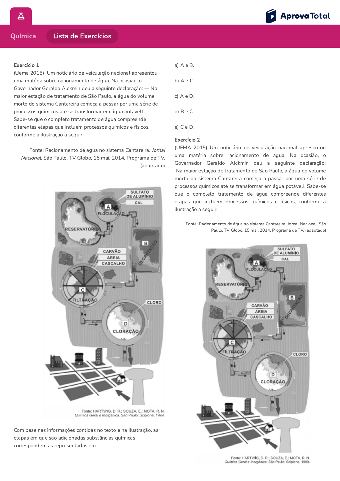 https://www.biologiatotal.com.br/medio/quimica/exercicios/separacao-de-misturas/ex.7-tratamento-de-agua 1/20 Química Lista de Exercícios Exercício 1 (Uema 2015) Um noticiário de veiculação nacional apresentou uma matéria sobre racionamento de água. Na ocasião, o Governador Geraldo Alckmin deu a seguinte declaração: ― Na maior estação de tratamento de São Paulo, a água do volume morto do sistema Cantareira começa a passar por uma série de processos químicos até se transformar em água potávelǁ. Sabe-se que o completo tratamento de água compreende diferentes etapas que incluem processos químicos e físicos, conforme a ilustração a seguir. Fonte: Racionamento de água no sistema Cantareira. Jornal Nacional. São Paulo. TV Globo, 15 mai. 2014. Programa de TV. (adaptado) Com base nas informações contidas no texto e na ilustração, as etapas em que são adicionadas substâncias químicas correspondem às representadas em a) A e B. b) A e C. c) A e D. d) B e C. e) C e D. Exercício 2 (UEMA 2015) Um noticiário de veiculação nacional apresentou uma matéria sobre racionamento de água. Na ocasião, o Governador Geraldo Alckmin deu a seguinte declaração: Na maior estação de tratamento de São Paulo, a água do volume morto do sistema Cantareira começa a passar por uma série de processos químicos até se transformar em água potávelǁ. Sabe-se que o completo tratamento de água compreende diferentes etapas que incluem processos químicos e físicos, conforme a ilustração a seguir. Fonte: Racionamento de água no sistema Cantareira. Jornal Nacional. São Paulo. TV Globo, 15 mai. 2014. Programa de TV. (adaptado) https://www.biologiatotal.com.br/medio/quimica/exercicios/separacao-de-misturas/ex.7-tratamento-de-agua 2/20 Com base nas informações contidas no texto e na ilustração, as etapas em que são adicionadas substâncias químicas correspondem às representadas em: a) A e B. b) A e C. c) A e D. d) B e C. e) C e D. Exercício 3 (CPS 2017) A quantidade de água doce disponível para o nosso uso é muito pequena, perto de 3% do volume total de água existente. Os outros 97% são constituídos por água salgada. Desses 3% de água doce, cerca de 1% está acessível para a população de todo o planeta e o restante está na forma de gelo. Contudo, boa parte da água acessível encontra-se poluída e deve ser tratada para o consumo humano. As etapas envolvidas nas estações de tratamento da água das grandes metrópoles são a) �ltração e cloração, somente. b) decantação e �ltração, somente. c) �oculação e decantação, somente. d) sublimação, decantação e �ltração. e) �oculação, decantação, �ltração e cloração. Exercício 4 (CPS 2017) O fenômeno da chuva ácida está relacionado ao aumento da poluição em regiões industrializadas. Os agentes poluentes são distribuídos pelos ventos, causando danos à saúde humana e ao meio ambiente. Gases gerados pelas indústrias, veículos e usinas energéticas reagem com o vapor de água existente na atmosfera, formando compostos ácidos que se acumulam em nuvens, ocorrendo, assim, a condensação, da mesma forma como são originadas as chuvas comuns. Um desses gases, o SO2 é proveniente da combustão do enxofre, impureza presente em combustíveis fósseis, como o carvão e derivados do petróleo. Ele leva à formação do ácido sulfúrico. O esquema ilustra esse processo Uma forma de atenuar o fenômeno descrito seria a retirada do enxofre dos combustíveis derivados do petróleo, como o diesel e o óleo combustível. Esses dois combustíveis são obtidos do petróleo por a) �ltração. b) sublimação. c) decantação. d) fusão fracionada. e) destilação fracionada. Exercício 5 (Ufjf-pism 1 2019) A solda macia (ou solda branca) é uma solda comum à base de uma liga de estanho e chumbo em variadas proporções. Na eletroeletrônica, as soldas são mais usadas em forma de �os, com a liga estanho/chumbo de proporção a qual possui ponto de fusão igual a Analisando o grá�co abaixo, que mostra o comportamento térmico dessa solda, assinale a a�rmativa CORRETA: a) A solda é constituída por substâncias com impurezas e com temperatura de ebulição constante. b) O fenômeno que ocorre na região B é a solidi�cação, e há três fases em equilíbrio. c) A solda é constituída por uma mistura eutética, pois funde em temperatura constante. d) A solda é constituída por uma mistura azeotrópica, pois funde em temperatura constante. e) Na região D da curva, coexistem as fases líquida e gasosa, e a temperatura permanece constante. Exercício 6 (Ita 2012) A �gura representa a curva de aquecimento de uma amostra, em que S, L e G signi�cam, respectivamente, sólido, líquido e gasoso. Com base nas informações da �gura é CORRETO a�rmar que a amostra consiste em uma https://www.biologiatotal.com.br/medio/quimica/exercicios/separacao-de-misturas/ex.7-tratamento-de-agua 3/20 a) substância pura. b) mistura coloidal. c) mistura heterogênea. d) mistura homogênea azeotrópica. e) mistura homogênea eutética. Exercício 7 (FATEC 2014) Além do problema da escassez de água potável em alguns pontos do planeta, a sociedade também enfrenta as di�culdades de tratamento da água disponível, cada vez mais poluída. Uma das etapas desse tratamento envolve a adição de compostos químicos que possam facilitar a retirada de partículas suspensas na água. Os compostos adicionados reagem formando uma substância gelatinosa, hidróxido de alumínio, que aglutina as partículas suspensas. A seguir, temos a reação que representa o descrito: A etapa descrita é denominada: a) �ltração. b) cloração. c) �oculação. d) destilação. e) decantação. Exercício 8 (Unesp 2010) No campo da metalurgia é crescente o interesse nos processos de recuperação de metais, pois é considerável a economia de energia entre os processos de produção e de reciclagem, al