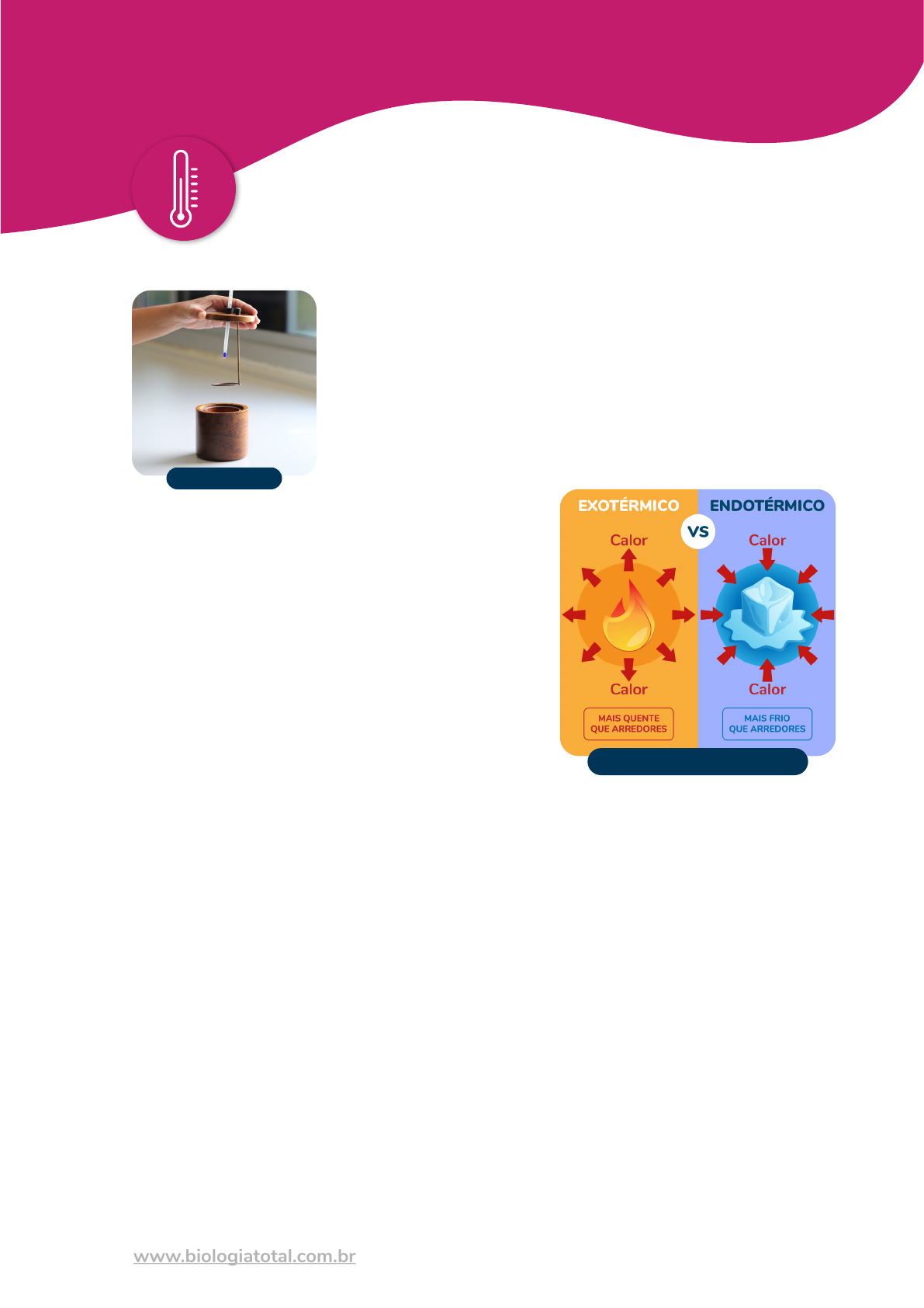 1www.biologiatotal.com.br ENTALPIAS A entalpia é a quantidade de energia presente em um determinado sistema. A entalpia vem vem da energia interna que cada substância possui, sendo simbolizada pela letra “H”. Porém, não é possível determinar isoladamente a entalpia de uma molécula. O que é feito é calcular a variação de entalpia (ΔH) envolvida no processo. São utilizados nesse tipo de determinação os calorímetros, que são aparelhos que medem a quantidade de calor liberada em uma reação. Quando ocorre a liberação de energia chamamos o processo de exotérmico. Neste caso, a variação de entalpia é negativa (ΔH < 0). A combustão é um exemplo de reação química exotérmica. Quando ocorre absorção de energia por um sistema, chamamos o processo de endotérmico. Neste caso, a variação de entalpia é positiva (ΔH > 0). O processo de derretimento do gelo (fusão da água), é um exemplo de processo endotérmico. Interpretando o sinal de ΔH ΔH < 0, significa que a entalpia contida nos produtos é menor que a entalpia contida nos reagentes. Ou seja, houve uma liberação de energia, sendo assim, é um processo exotérmico. ΔH > 0, significa que a entalpia contida nos produtos é maior que a entalpia contida nos reagentes. Ou seja, para que houvesse a formação dos produtos foi necessário uma absorção de energia, sendo assim, é um processo endotérmico. TIPOS DE ENTALPIA Existem diversos tipos de entalpia, os quais dependem do tipo de substância envolvida na reação química. Os tipos de entalpia que serão estudados são: f Entalpias de reação f Entalpia de mudança de fase f Entalpias de formação f Entalpias de dissolução f Entalpia de combustão f Entalpia de neutralização Calorímetro Processo endotérmico 2 En ta lp ia s Entalpias de reação A variação de entalpia pode ser definida como: ΔH = HFINAL – HINICIAL Sendo assim, a variação de entalpia de uma reação por ser expresso como ΔHr , e ser definida como : ΔHr = HPRODUTOS – HREAGENTES. Exemplo: Quando 2 mols de H2(g) reagem com 1 mol de oxigênio à uma pressão constante, há a formação de 2 mols de H2O(g) , e o sistema libera 483,6 kJ de energia. A imagem mostra um diagrama de entalpia. Quanto mais ao alto a equação química está, maior sua entalpia. Já que no caso a reação ocorre minimizando a entalpia do sistema ao liberar energia para as redondezas, a direção da seta é de cima para baixo, resultando em uma reação exotérmica. Podemos representar a equação química das seguintes formas: 2 H 2(g) + O2(g) → 2 H2O(g) + 483.6 kJ 2 H 2(g) + O2(g) → 2 H2O(g) ΔHr = – 483.6 kJ Mas devemos estar atentos às proporções estequiométricas da reação em questão! Caso a reação fosse entre 1 mol de H2(g) e ½ mol de O2(g) o valor da entalpia da reação seria exatamente a metade: 1 H 2(g) + ½ O2(g) → 1 H2O(g) ΔHr = – 241,8 kJ 3www.biologiatotal.com.br En ta lp ia sAo se utilizar equações termoquímicas e diagramas de entalpia, é importante saber que: f A entalpia da reação (ΔHr) é proporcional à quantidade de reagentes consumidos. Como vimos anteriormente, a reação para formação de 2 mols de água a partir de 2 mols de H2(g) com 1 mol de O2(g) tem uma ΔHr duas vezes maior que na reação que contém a metade de reagentes (1 mols de H2(g) com ½ mol de O2(g) ) f A entalpia da reação reversa é igual à entalpia de reação em termos de magnitude, porém tem sinal oposto. Por exemplo, a decomposição de 2 mols de H2O(g) em 2 mols de H2(g) com 1 mol de O2(g) terá uma ΔHr = + 483,6 kJ. Quando isso é expresso em um diagrama, devemos prestar atenção na direção das setas. f A entalpia da reação (ΔHr) depende dos estados dos reagentes e produtos e é muito importante especificá-los. Por exemplo, se o produto da reação apresentada fosse água líquida ao invés de água gasosa (2 H 2(g) + O2(g) → 2 H2O(l)) o valor ΔHr seria de – 571,6 kJ. Isso ocorre pois quando o produto é gasoso, uma etapa a mais deve ocorrer: converter água líquida em vapor. Converter água líquida em vapor requer energia, e por isso o valor de ΔHr é menos negativo quando o produto é a água gasosa, ou seja, parte teve que ser gastado para o processo de vaporização, mais especificadamente, 88 kJ: 2 H2O(l) + 2 H2O(g) ΔH = +88 kJ (processo endotérmico) Exercício resolvido A reação de decomposição do peróxido de hidrogênio é dada abaixo: 2 H2O2(l) + 2 H2O(l) + O2(g) ΔHr = –196 kJ Calcule a quantidade de calor liberado pela decomposição de 5,00 g de H2O2(l) à uma pressão constante. Dados: H = 1 g/mol ; O = 16 g/mol. Resolução: Tendo a equação química balanceada, a informação do valor da entalpia de reação e a massa molar do H2O2 podemos calcular o calor liberado por 5,00 g de H2O2 (l) EXERCÍCIO RESOLVIDO 4 En ta lp ia s Massa Molar H2O2 = 2 × 1 + 2 × 16 = 34 g/mol 34 g --------- 1 mol 5 g --------- 𝑥 mol 𝑥 = 0,147 mol de H2O2 Sabemos que 2 mols de H2O2 liberam 196 kJ (ΔHr = –196 kJ), sendo assim, quantos kilojoules 0,15 mol de H2O2 liberam? 2 mol --------- 196 kJ 0,147 mol --------- 𝑥 𝑥 = 14,4 kJ A entalpia de reação da decomposição de 5 g de H2O2 é ΔHr = –14,4 kJ. Entalpias de formação Uma informação muito importante na termoquímica é a que diz respeito da formação de compostos a partir de seus constituintes elementares. A entalpia associada com esse processo é chamada de entalpia de formação, e designada como ΔHf . Porém, sabemos que a magnitude de qualquer variação de entalpia depende da temperatura, pressão e estado físico que se encontram os reagentes e produtos. Sendo assim, é ideal que uma série de condições sejam definidas para que possamos comparar uma reação com outra. Essas condições são chamadas de estado padrão. Estado padrão de substâncias simples O estado padrão de uma substância é definido como o estado físico mais comum e estável, a 25 °C e a 1 atm de