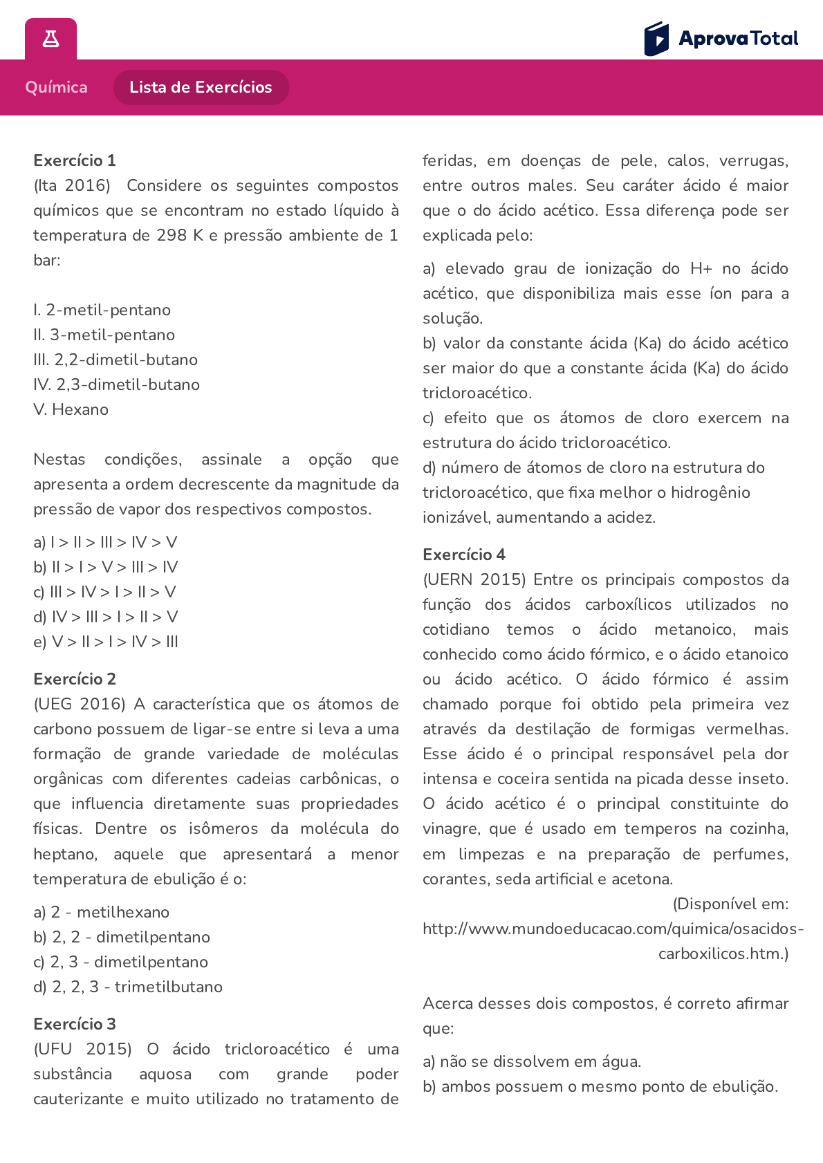 https://aprovatotal.com.br/medio/quimica/exercicios/propriedades-dos-compostos-organicos/ex.8-propriedades-dos-compostos-organicos?dificuldade=ra… 1/23 Química Lista de Exercícios Exercício 1 (Ita 2016) Considere os seguintes compostos químicos que se encontram no estado líquido à temperatura de 298 K e pressão ambiente de 1 bar: I. 2-metil-pentano II. 3-metil-pentano III. 2,2-dimetil-butano IV. 2,3-dimetil-butano V. Hexano Nestas condições, assinale a opção que apresenta a ordem decrescente da magnitude da pressão de vapor dos respectivos compostos. a) I > II > III > IV > V b) II > I > V > III > IV c) III > IV > I > II > V d) IV > III > I > II > V e) V > II > I > IV > III Exercício 2 (UEG 2016) A característica que os átomos de carbono possuem de ligar-se entre si leva a uma formação de grande variedade de moléculas orgânicas com diferentes cadeias carbônicas, o que in�uencia diretamente suas propriedades físicas. Dentre os isômeros da molécula do heptano, aquele que apresentará a menor temperatura de ebulição é o: a) 2 - metilhexano b) 2, 2 - dimetilpentano c) 2, 3 - dimetilpentano d) 2, 2, 3 - trimetilbutano Exercício 3 (UFU 2015) O ácido tricloroacético é uma substância aquosa com grande poder cauterizante e muito utilizado no tratamento de feridas, em doenças de pele, calos, verrugas, entre outros males. Seu caráter ácido é maior que o do ácido acético. Essa diferença pode ser explicada pelo: a) elevado grau de ionização do H+ no ácido acético, que disponibiliza mais esse íon para a solução. b) valor da constante ácida (Ka) do ácido acético ser maior do que a constante ácida (Ka) do ácido tricloroacético. c) efeito que os átomos de cloro exercem na estrutura do ácido tricloroacético. d) número de átomos de cloro na estrutura do tricloroacético, que �xa melhor o hidrogênio ionizável, aumentando a acidez. Exercício 4 (UERN 2015) Entre os principais compostos da função dos ácidos carboxílicos utilizados no cotidiano temos o ácido metanoico, mais conhecido como ácido fórmico, e o ácido etanoico ou ácido acético. O ácido fórmico é assim chamado porque foi obtido pela primeira vez através da destilação de formigas vermelhas. Esse ácido é o principal responsável pela dor intensa e coceira sentida na picada desse inseto. O ácido acético é o principal constituinte do vinagre, que é usado em temperos na cozinha, em limpezas e na preparação de perfumes, corantes, seda arti�cial e acetona. (Disponível em: http://www.mundoeducacao.com/quimica/osacidos- carboxilicos.htm.) Acerca desses dois compostos, é correto a�rmar que: a) não se dissolvem em água. b) ambos possuem o mesmo ponto de ebulição. https://aprovatotal.com.br/medio/quimica/exercicios/propriedades-dos-compostos-organicos/ex.8-propriedades-dos-compostos-organicos?dificuldade=ra… 2/23 c) o ácido acético possui ponto de ebulição menor. d) o ácido acético é menos ácido que o ácido fórmico. Exercício 5 (PUCRS 2014) Analise o texto abaixo, que contém lacunas, e as fórmulas a seguir. A carne de panela é um prato muito apreciado da culiná¬ria tradicional, mas em geral é bastante gorduroso, o que o torna inconveniente para muitas pessoas. Para obter uma carne de panela saborosa e com pouca gordura, uma possibilidade é cozinhála normalmente, com bas¬tante molho, e deixála esfriar; depois, levar à geladeira. Devido a sua __________, a gordura forma placas sólidas por cima do molho, podendo ser facilmente removida. Depois, é só aquecer novamente e tem-se uma carne de panela saborosa e pouco gorda. Esse método é bom para retirar a gordura e o colesterol (sempre presente na gordura animal), mas há uma desvantagem. É que muitos nutrientes são constituídos de moléculas de baixa polaridade, dissolvendo-se preferencialmente em __________. Por isso, são perdidos na remoção das placas, o que poderia levar, por exemplo, à perda do __________. Os termos que completam corretamente as lacunas são: a) massa e volume molares – carboidratos – caroteno b) polaridade e densidade – hidrocarbonetos – ácido pantotênico c) temperatura de fusão – água – caroteno d) massa e volume molares – proteínas – ácido pantotênico e) polaridade e densidade – lipídios – caroteno Exercício 6 (IFBA 2014) A destilação permite a separação de várias frações de hidrocarbonetos constituintes do petróleo. Dessa forma, ao se levar em conta as propriedades dos compostos e das misturas, bem como o processo de separação das frações do petróleo, pode-se a�rmar que: a) a destilação do petróleo, à pressão atmosférica, permite separar os hidrocarbonetos através de um processo químico. b) as forças intermoleculares predominantes nos hidrocarbonetos saturados do petróleo são do tipo dispersão de London. c) devido à alta concentração de eletrólitos na água do mar, esta solubiliza o petróleo em maior proporção que a água pura. d) as frações de destilado que contêm o butano e o propano são obtidas com destilação à pressão reduzida do petróleo. e) o propano e o 2-metilpropano são gases à temperatura ambiente sendo que o 2- metilpropano tem maior momento de dipolo devido à rami�cação da cadeia carbônica. Exercício 7 (UFRN 2013) O etino (C2H2), conhecido como acetileno, é bastante usado em solda de metais. Quando obtido na indústria, pode apresentar impurezas como o sulfeto de hidrogênio (H2S), molécula de geometria angular. Se o gás acetileno contiver essa impureza, pode ser puri�cado fazendo-o passar através de: a) éter metílico (CH3OCH3), pois o H2S é dissolvido, e o etino, pelo fato de ser formado por moléculas polares, não se dissolve nele. b) tetracloreto de carbono líquido (CCl4 ), pois o H2S é dissolvido, e o etino, pelo fato de ser formado por moléculas apolares, não se dissolve nele. c) água líquida (H2O), pois o H2S é dissolvido, e o etino, pelo fato de s
